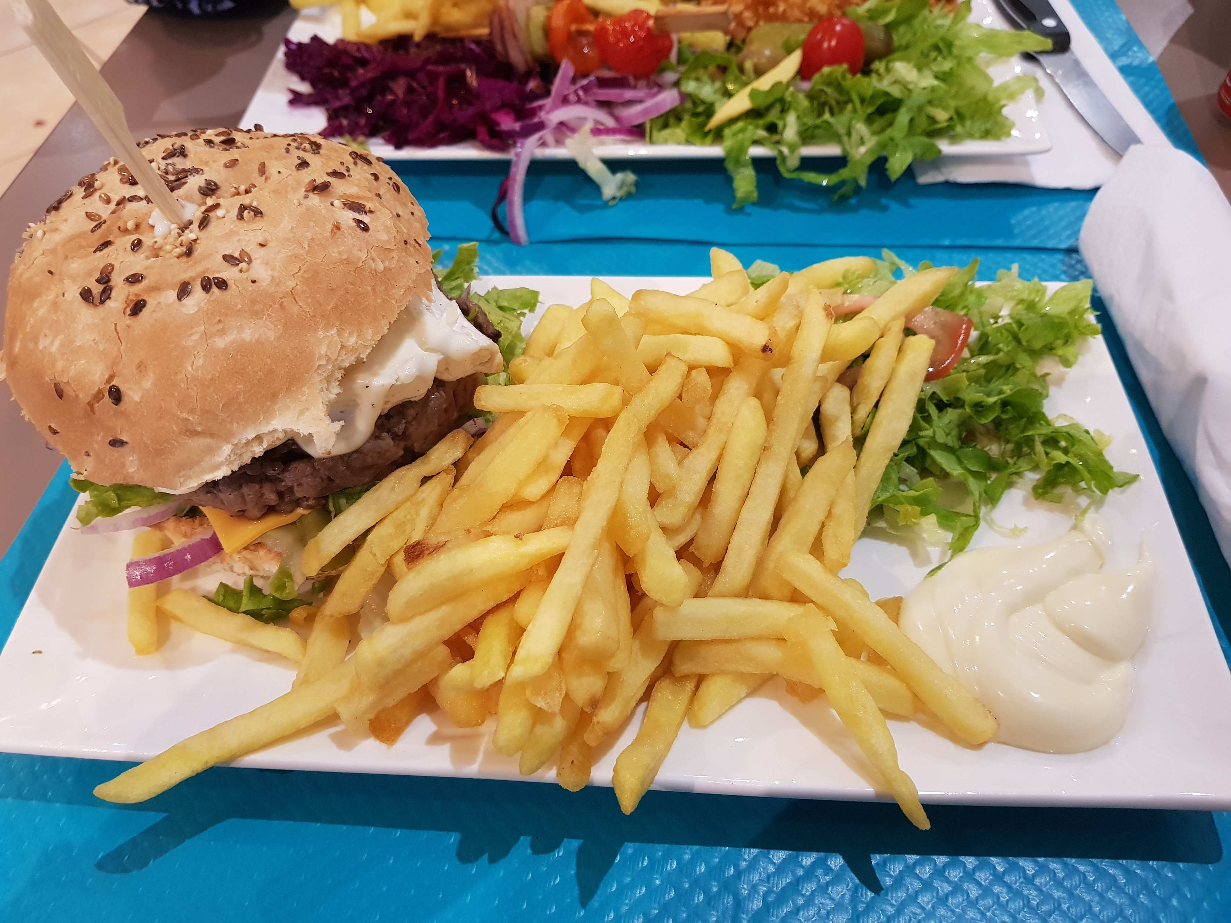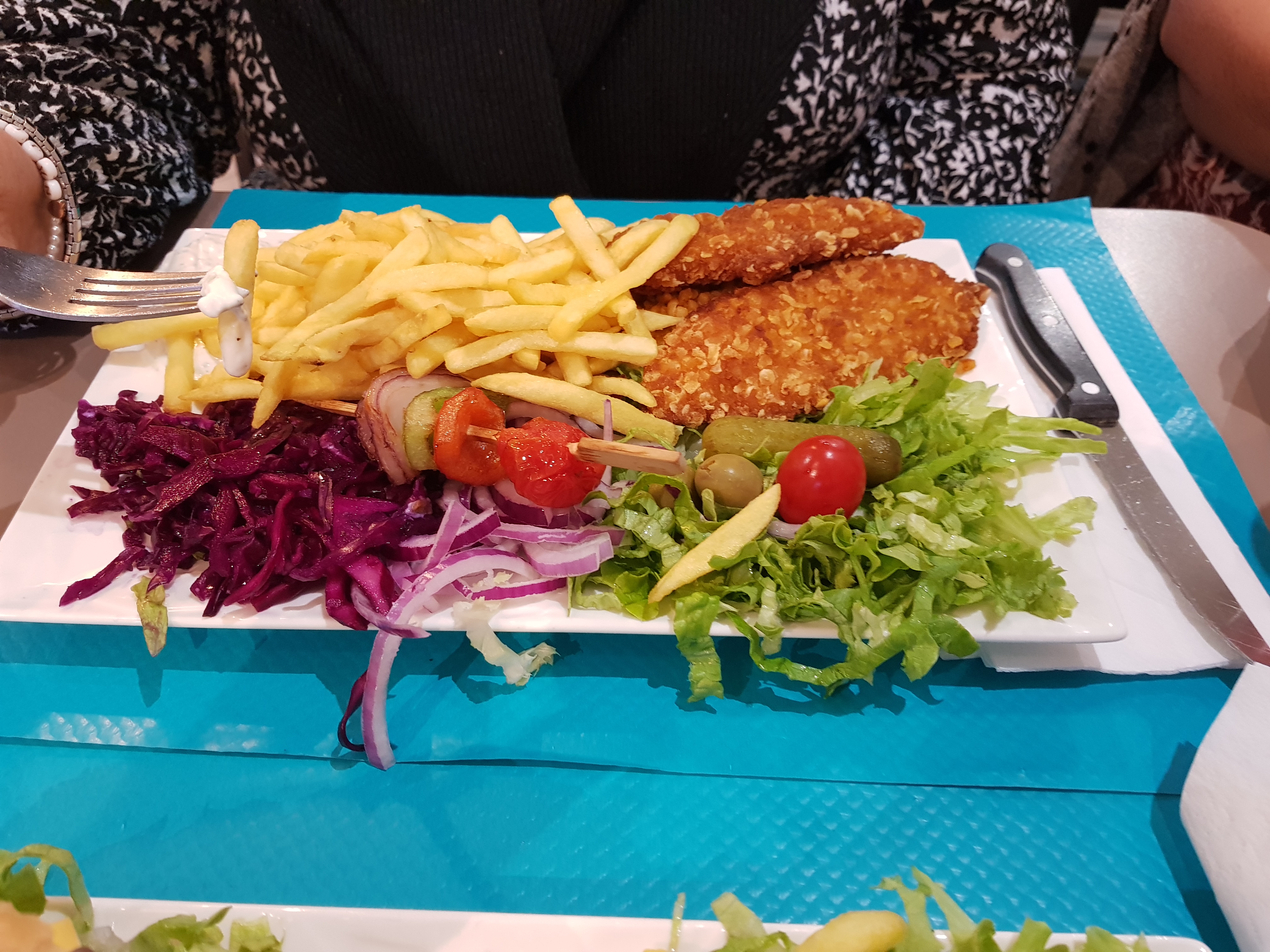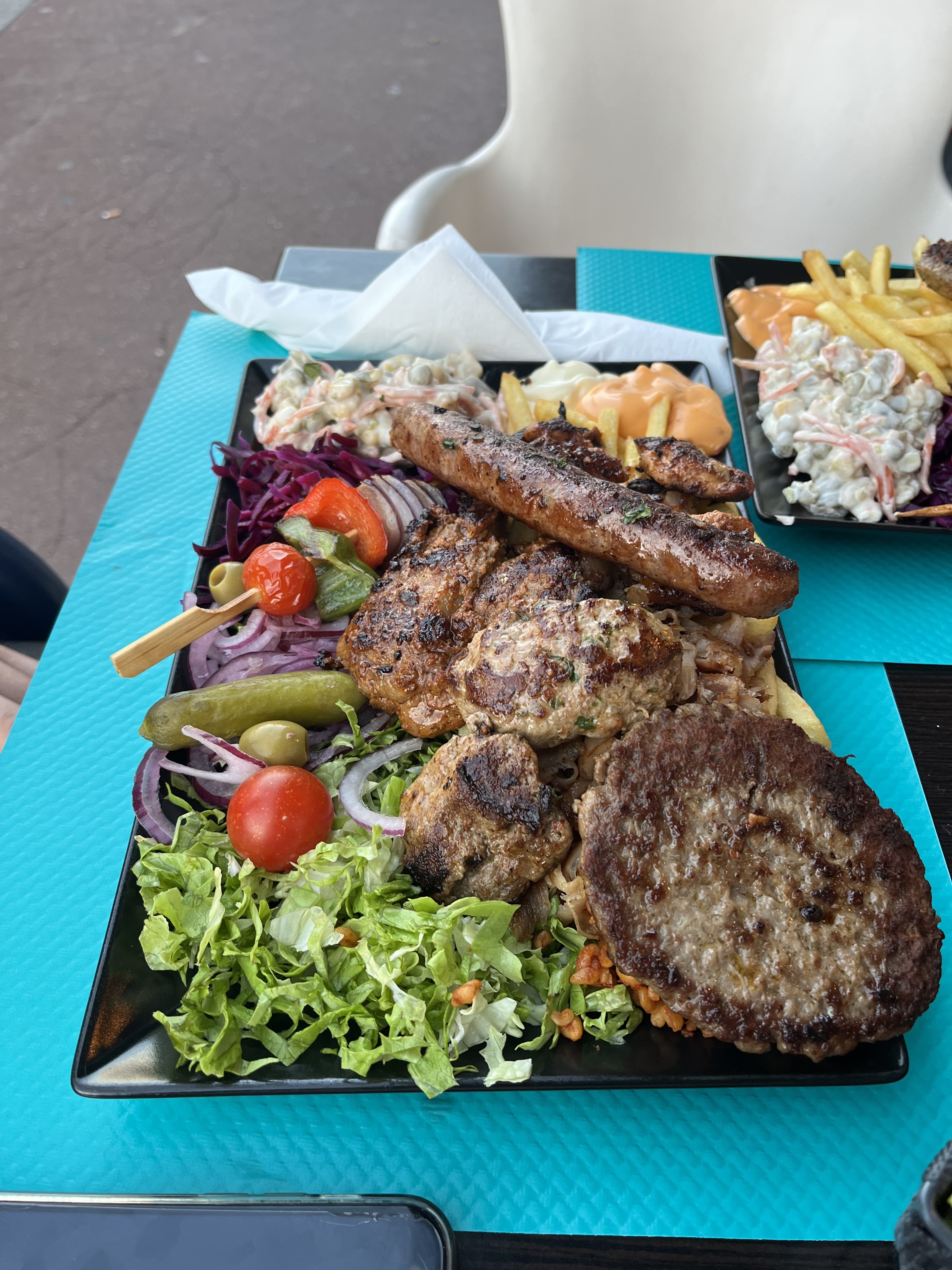 Placé dans la véranda au soleil, un peu long avant d'être servi et là THE assiette qui est posée devant moi. De gros morceaux de viande, des légumes, du boulgour, de la salade, du choux rouge un vrai festival. Ce n'est pas le meilleur kebab que j'ai mangé, la viande est bonne pas excellente, mais l'assiette était généreuse, les crudités bien venues, la petite brochette de légumes grillés 👍. Le service au petit oignons. Je recommande.