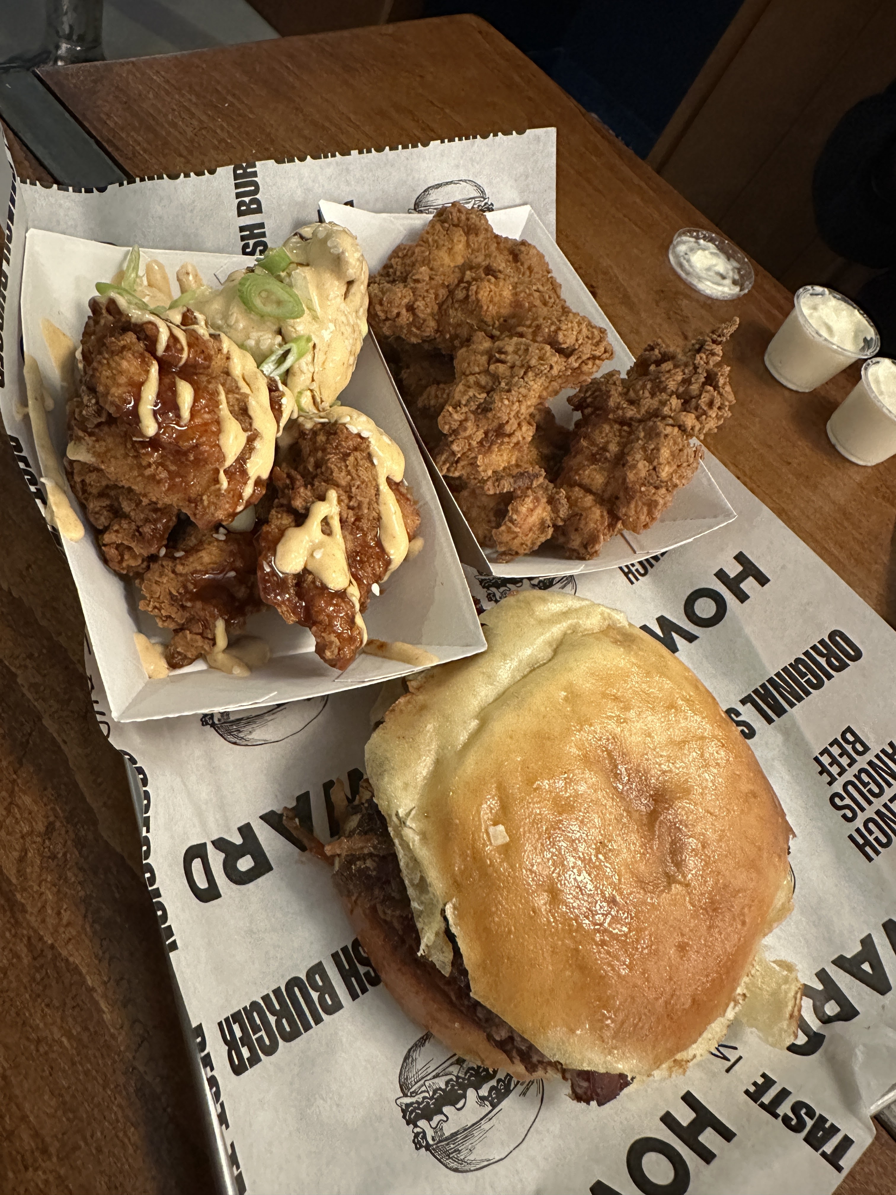 Déçue, je m’attendais à tellement mieux. Déjà j’ai trouvé l’attente un peu longue mais passons. Le personnel est agréable. La nourriture c’est une déception car pas aussi bonne qu’annoncée. On est sur une qualité moyenne et qui ne va pas avec le prix selon moi (mais il ne suffit pas d’avoir de bons ingrédients pour faire de la bonne nourriture). Le poulet frit pas mal mais panure trop sèche bien qu’épaisse( en plus il y a une épice qui ne se mariait pas avec le reste et qui m’a dérangé la langue tout au long du repas). Burger qui sont moins fat que prévu, j’ai pas pu bien sentir les diff ingrédients et pas de sauce. Pain à burger trop gras ? Frites ok ni plus ni moins, je préfère salé juste à la sortie de la friteuse plutôt que de devoir rajouter le sel soi même, mais bon c’est un parti pris. J’ai voulu rattraper en prenant les desserts. Cookie sec pas moelleux comme annoncé, une impression qu’il n’est pas de première fraîcheur. Le pire c’est ma glace, on la vends comme étant artisanale avec de bons ingrédients mais en vrai c’est que la glace qui l’est, le topping est purement industriel. Le caramel dégueulasse, c’est le sirop qu’on trouve en grande surface. Déçu j’ai pris aucun plaisir avec la glace qui faisait très industriel à cause du caramel. Bref si vous êtes amateurs de bonnes saveurs avec un palais assez aiguisé passé votre chemin. Si vous n’êtes pas trop regardant et pointilleux ça vous ira.