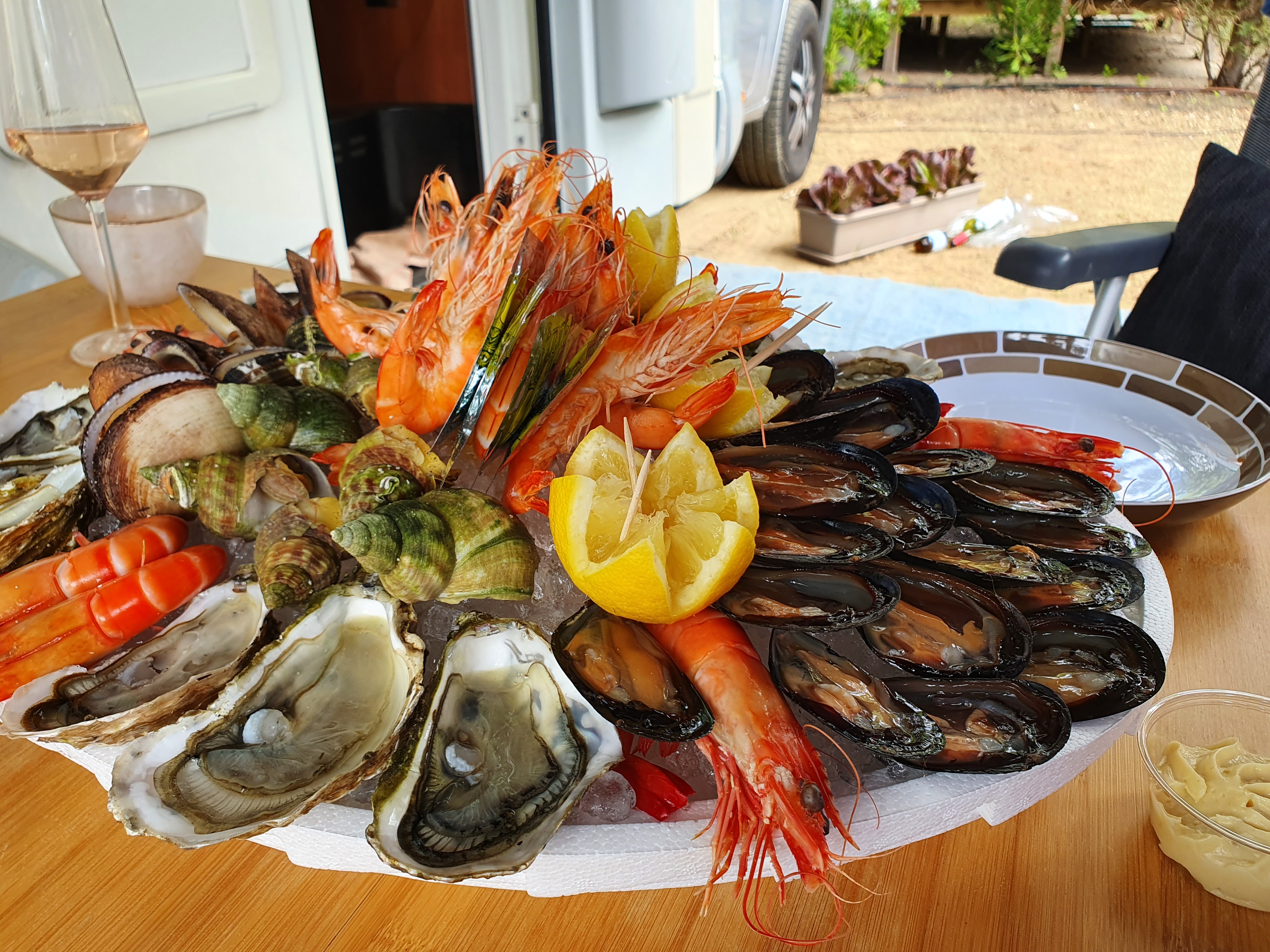 Hier à midi nous avons récupéré un plateau de fruits de mer que nous avions commandé la veille. Les huîtres, les moules, les crevettes et les escargots étaient excellents et merveilleux. Toujours mon plaisir.