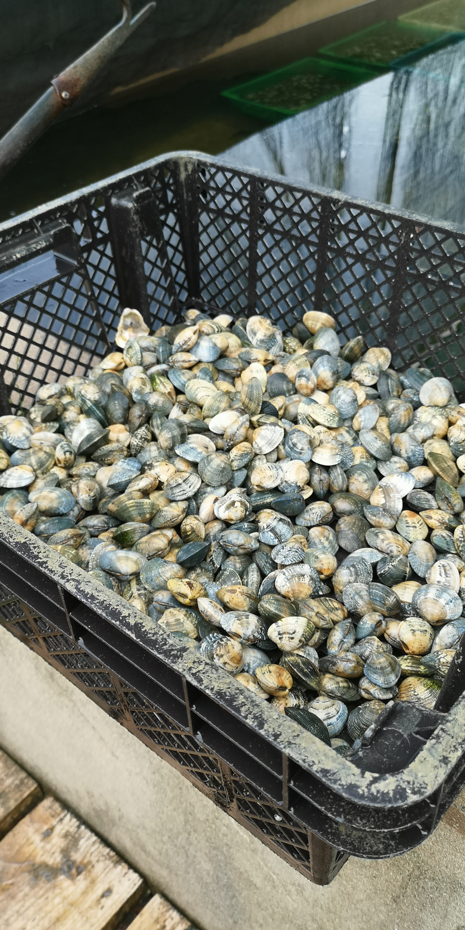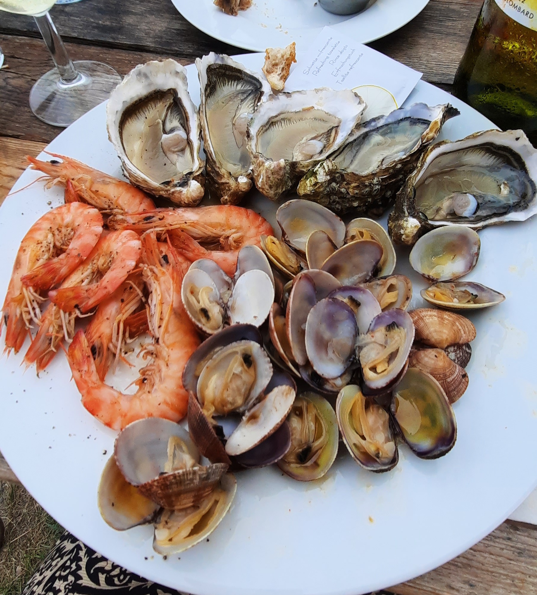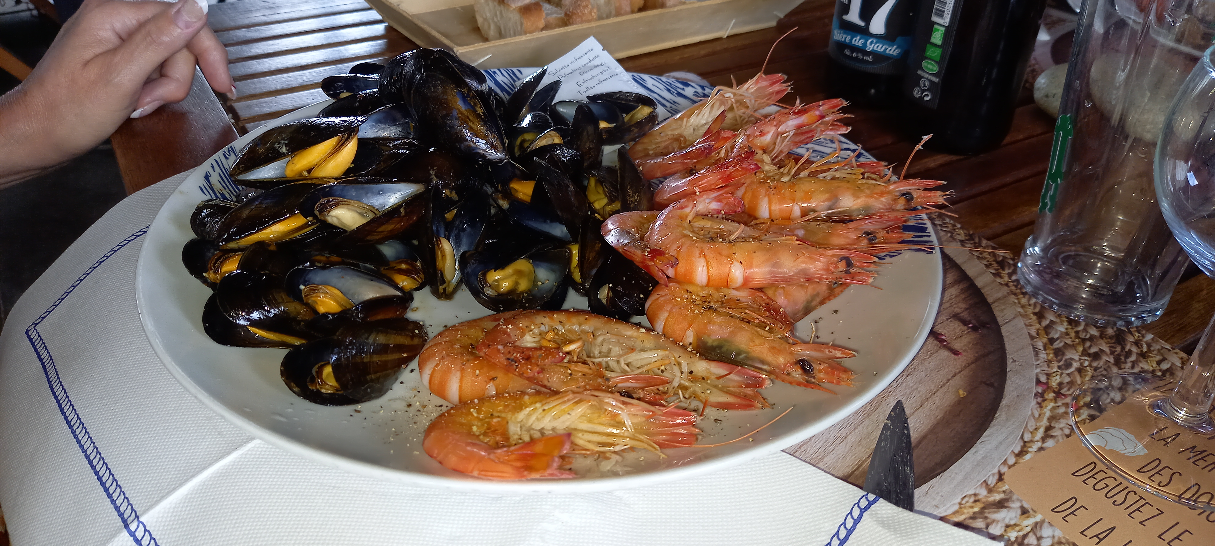Du producteur au consommateur. Éleveur de palourdes, d'huîtres et de crevettes, nous avons dû nous contenter des 2 premières car ce n'était pas la saison encore des crevettes. Les moules et palourdes a la plancha avec assaisonnement dont la cheffe n'a pas voulu nous révéler son secret, sont un vrai régal.
