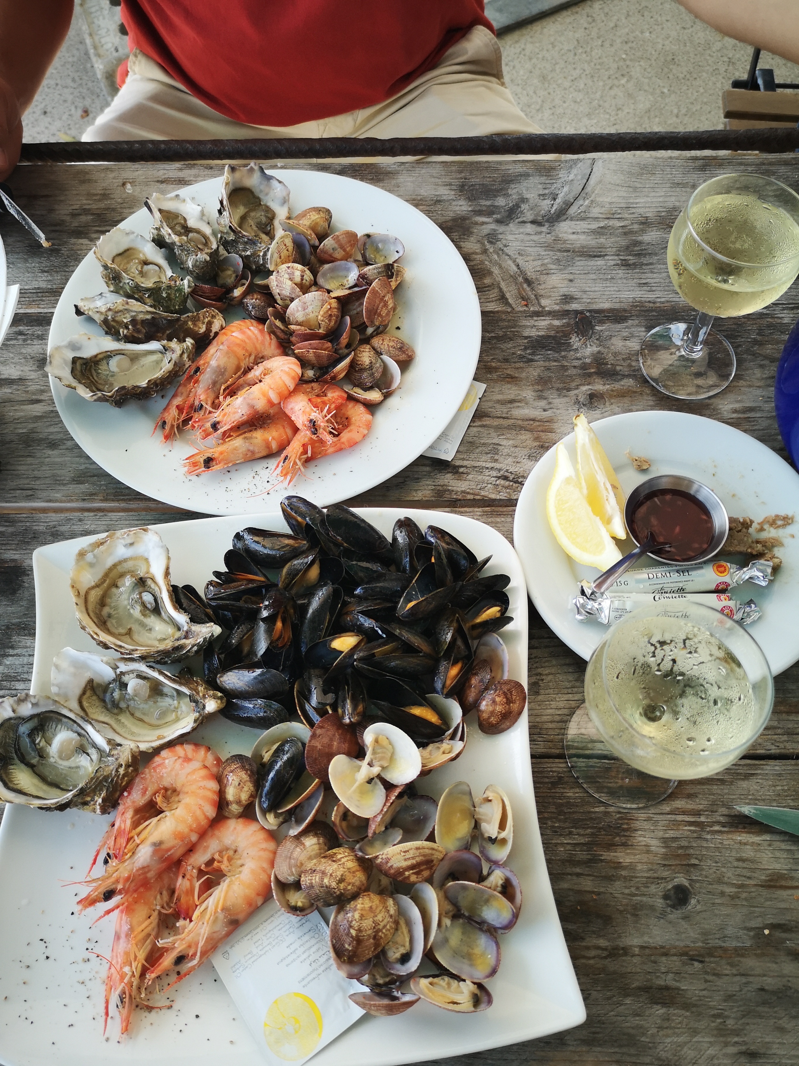 Nous n’avons pas dîner sur place car il faut réservé (c’est mieux) et lorsque nous sommes passé c’était complet ! Pensez y ! Du coup nous avons pris à emporter les huîtres, des coques, une soupe de poisson et un bon vin. On s’est régalé avec toutes ces bonnes choses