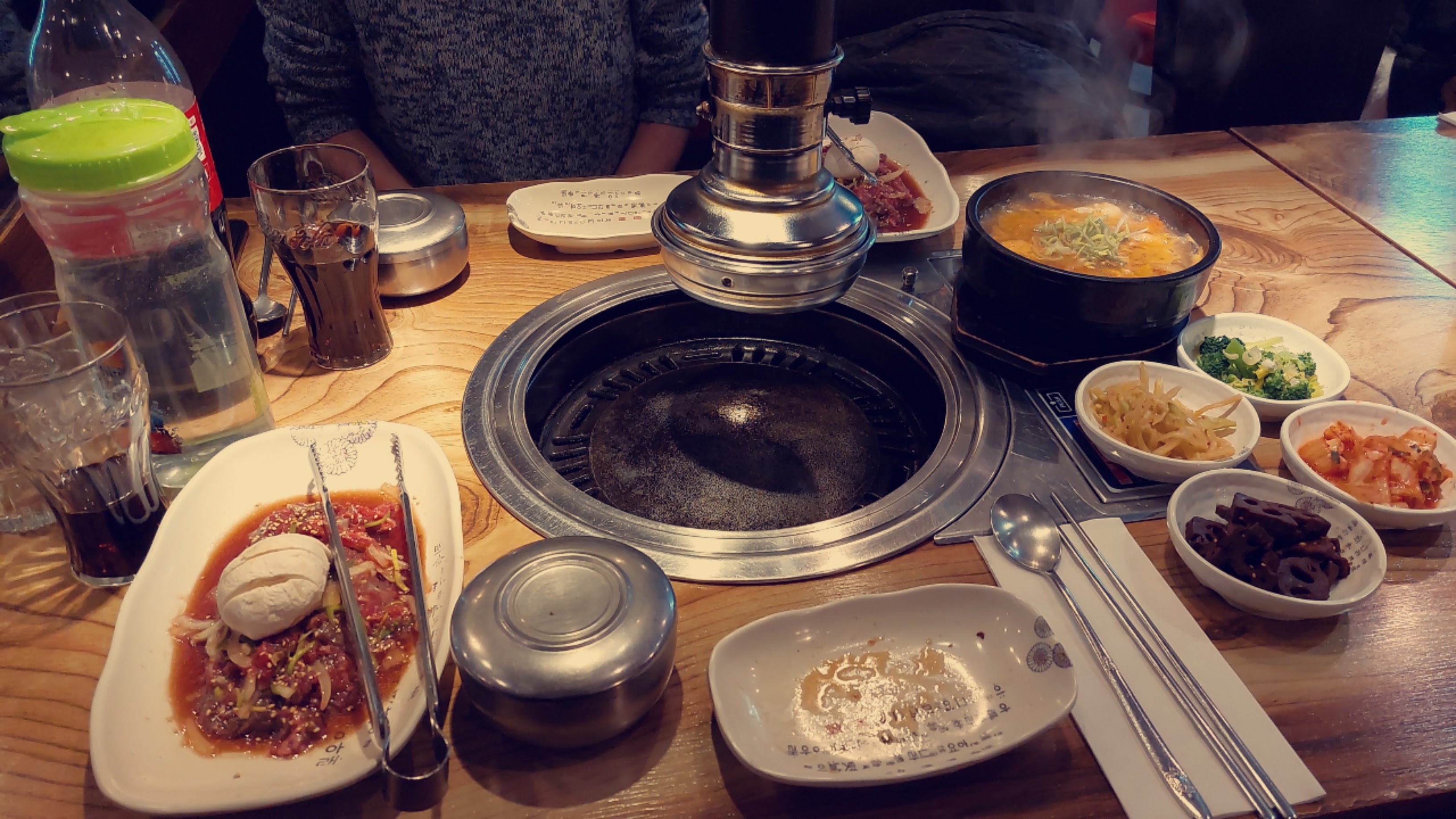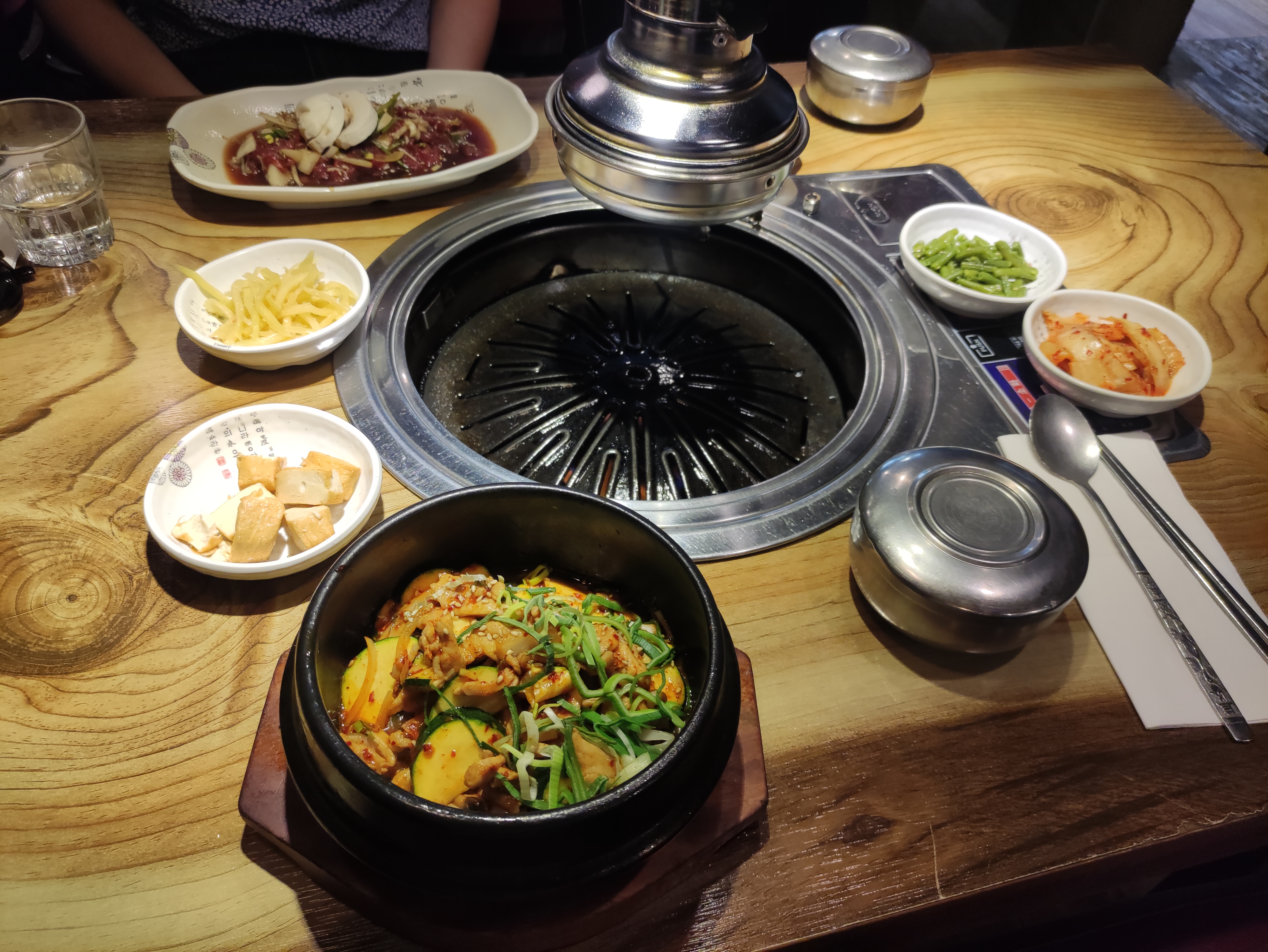 Ambiance sympa et un grill par table. Il y a une hotte, ce qui est super pour l'odeur. On n'a pas eu à attendre trop longtemps pour une table. On a pris barbecue avec ma soeur. J'ai pris porc et ma soeur boeuf. Les morceaux de porc qu'on m'a apporté était encore congelés, et étaient assez étrangement découpés. En grillant, la viande s'est séparée bizarrement et le porc n'avait pas beaucoup de goût. Le bœuf était congelé aussi et la qualité pas super. Heureusement il y avait des plats d'accompagnements assez bon, et du riz. Le prix du bbq était acceptable, environ 18euros. Mais pour la qualité de la viande, je trouvais ça cher.