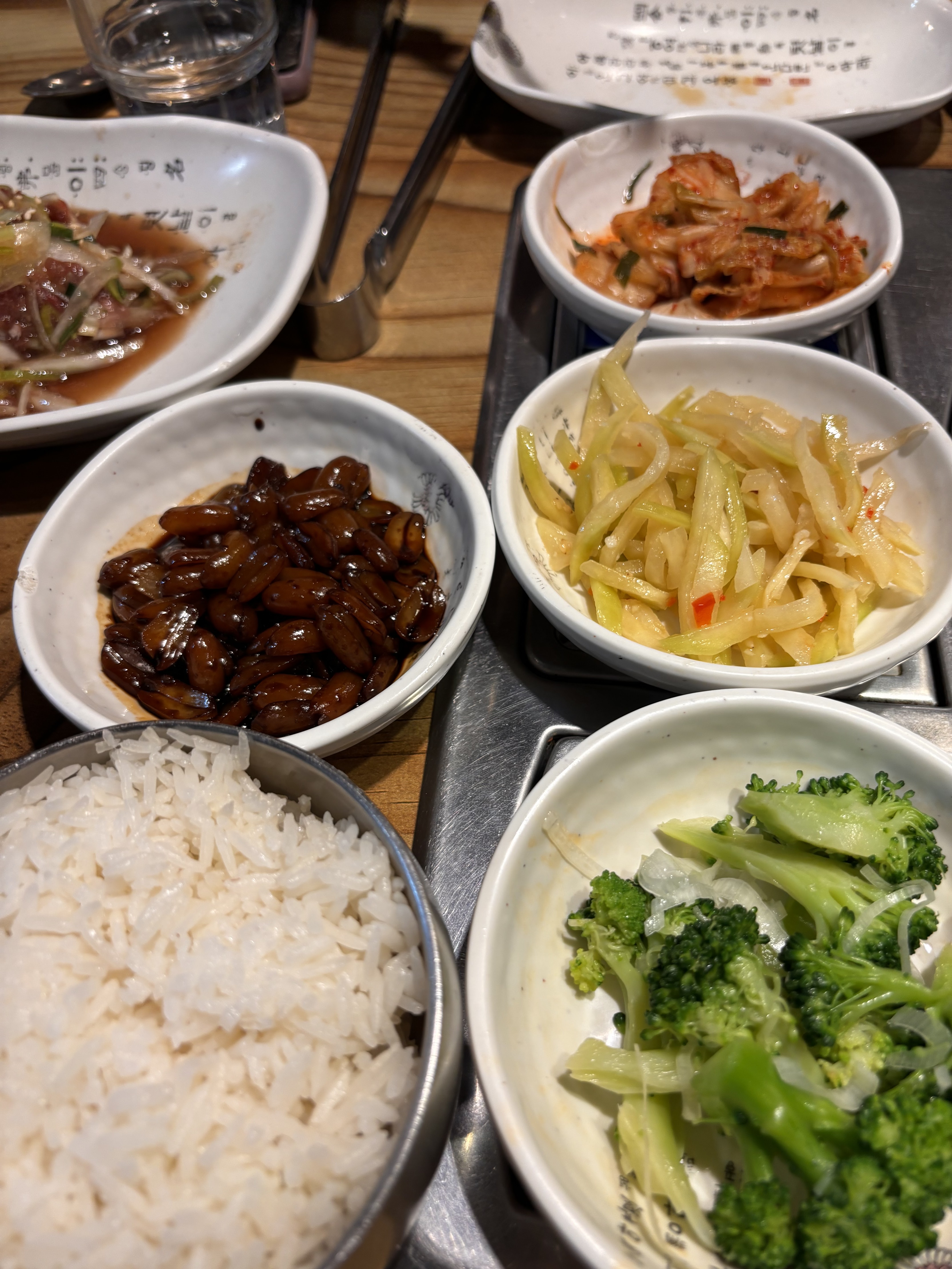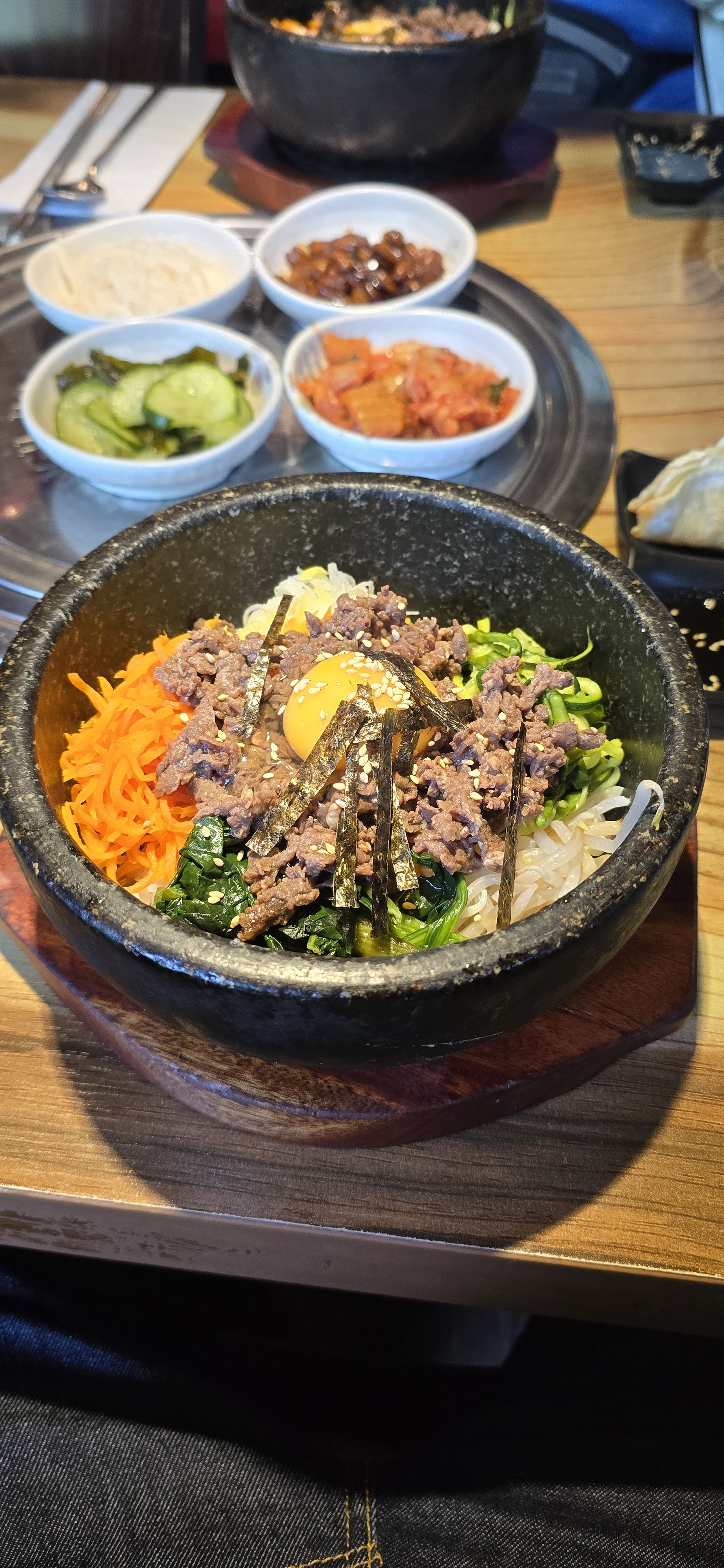 Dolsotbibimbap allait bien. Le bol en pierre devait être un peu plus chaud pour obtenir du vrai nurungji. Banchan était couci-couça. Le Kimchi était très fermenté. Sinon, les trois autres petites assiettes allaient bien. Radis marinés et cacahuètes à la sauce soja.