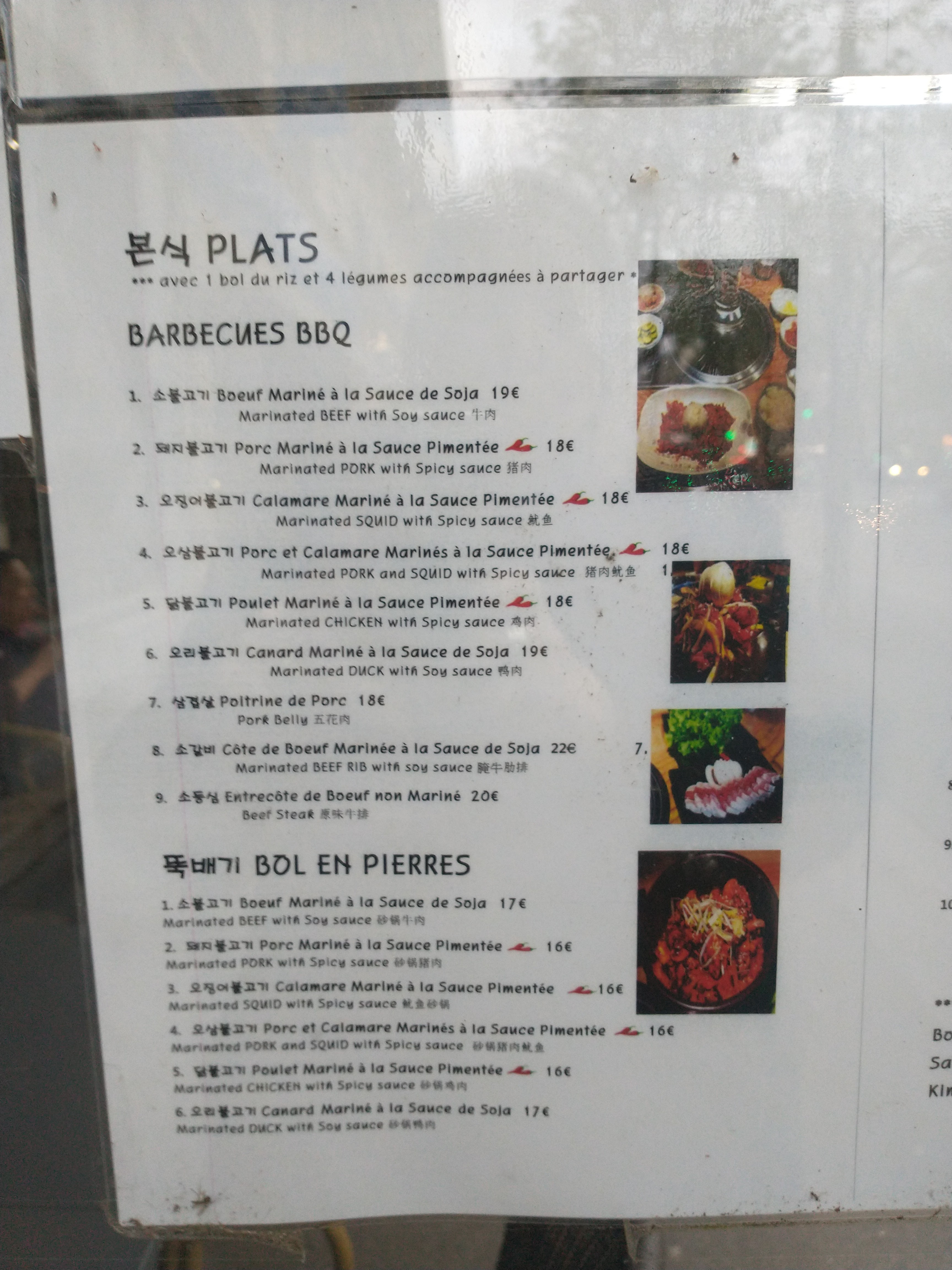 J'ai acheté des bibimbap à porter. C'était super, les plat ! Pour le barbecue, les viandes sont bonnes mais le restaurant n'a pas changé de grille lors du repas.