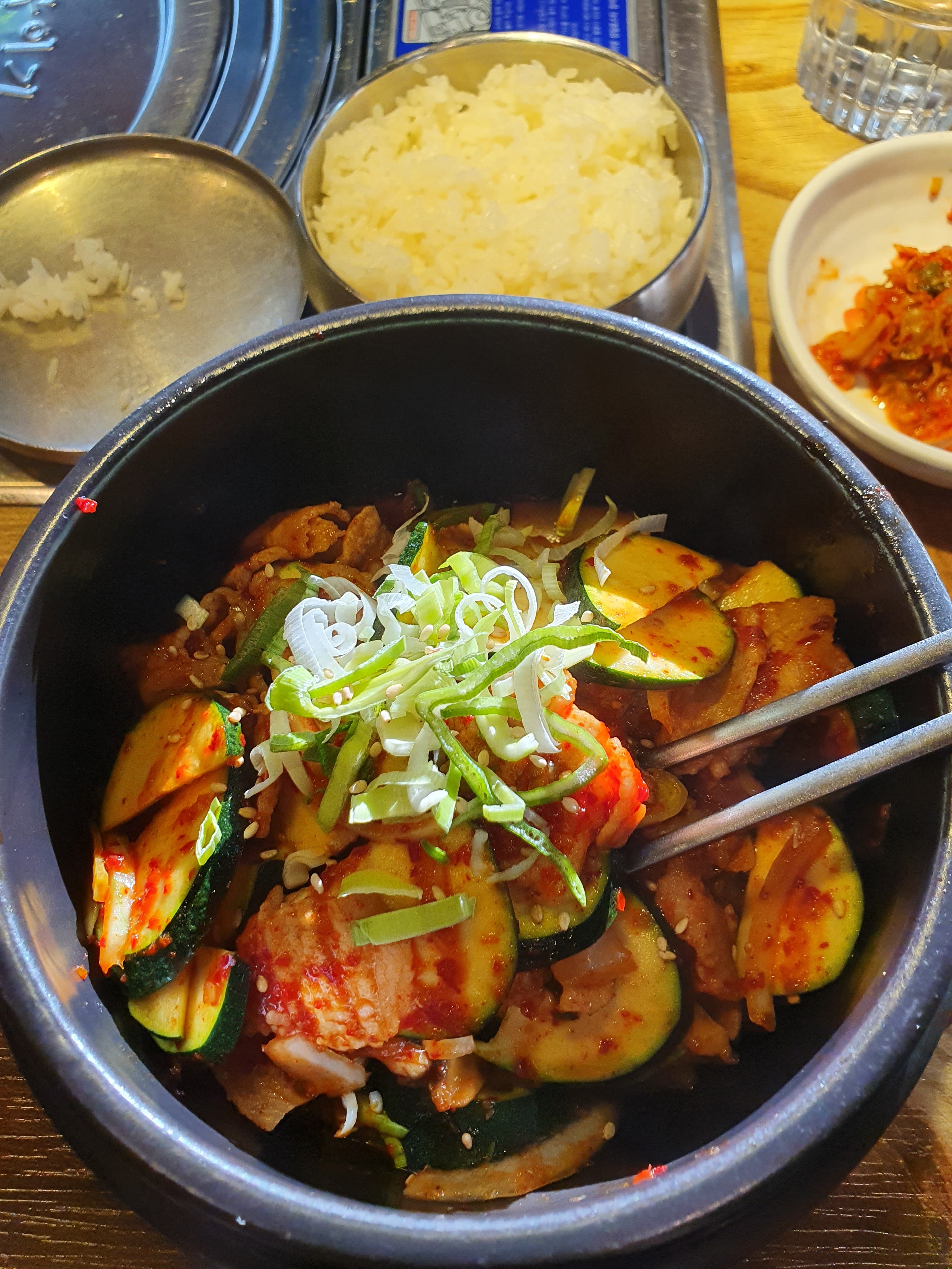 Accueil très sympatique, même si nous n'avions pas pu reserver en avance nous avons pu dîner. 😊 Service rapide 👍🏼 Rapport Qualité/prix : correct Restaurant à recommander sans hésitation ⬇️ entrée : galette de kimchi ⬇️ plat : Bol en pierre, porc et calamar mariné piquant avec ses accompagnements, pour 2.