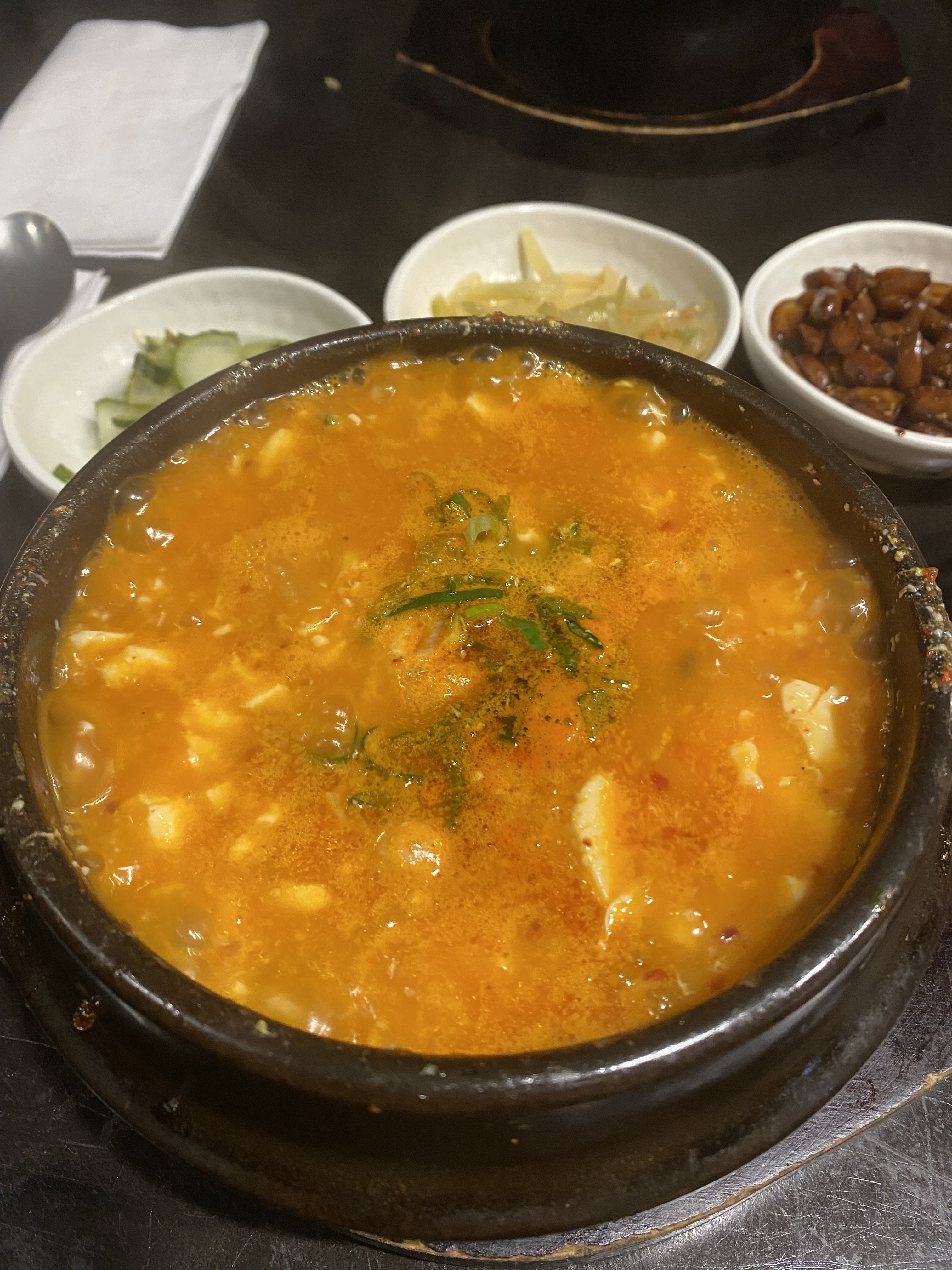 J'ai commandé la soupe au tofu et c'était très fade. Cela n’avait le goût de rien, juste de l’eau avec des flocons de piment. Ils ont définitivement oublié de mettre quelque chose. C'était tellement d'eau que je ne pouvais pas le manger. Gaspillage d'argent :( Bibimbap, par contre, était correct, j'aurais aimé le commander à la place.