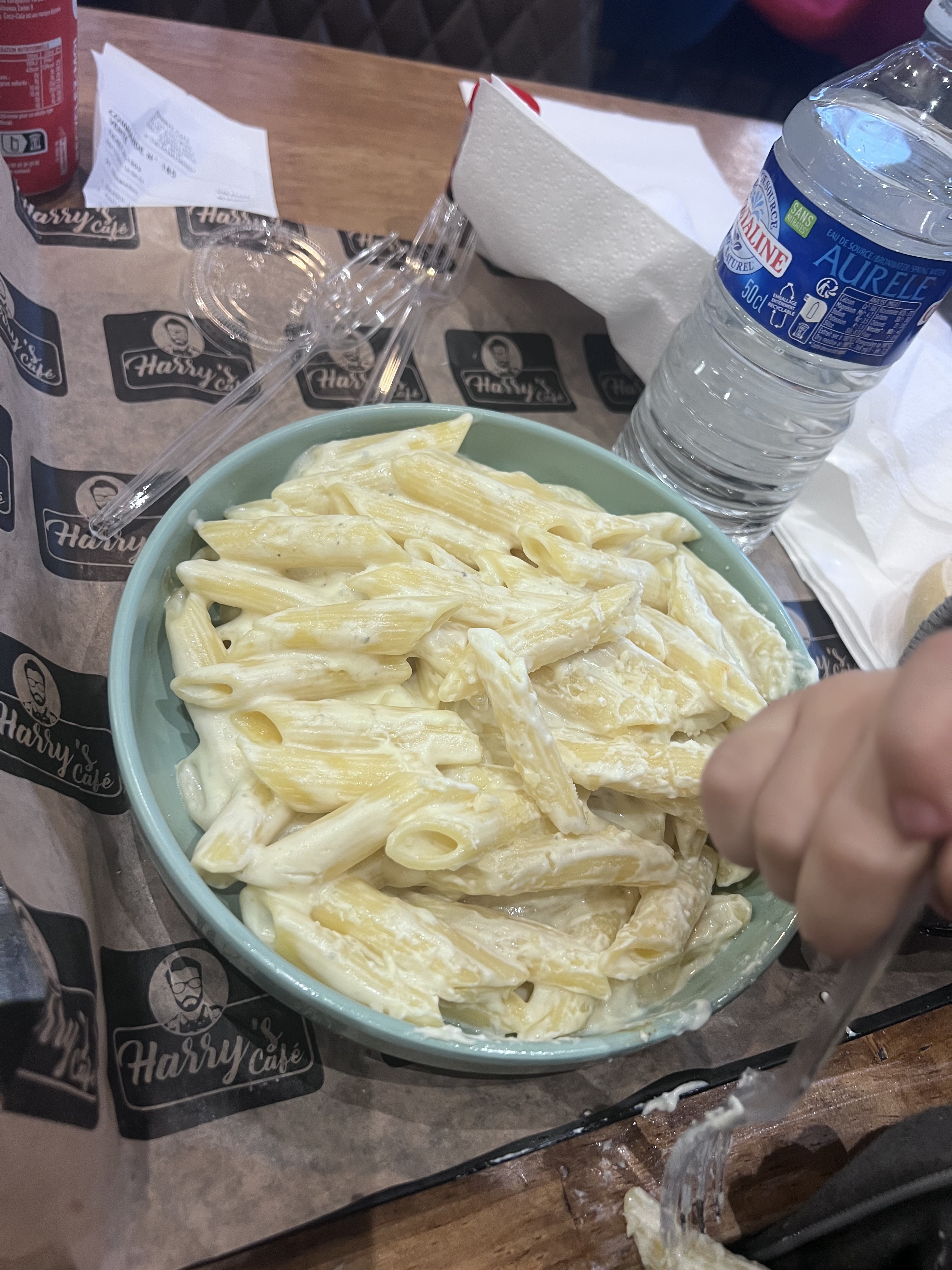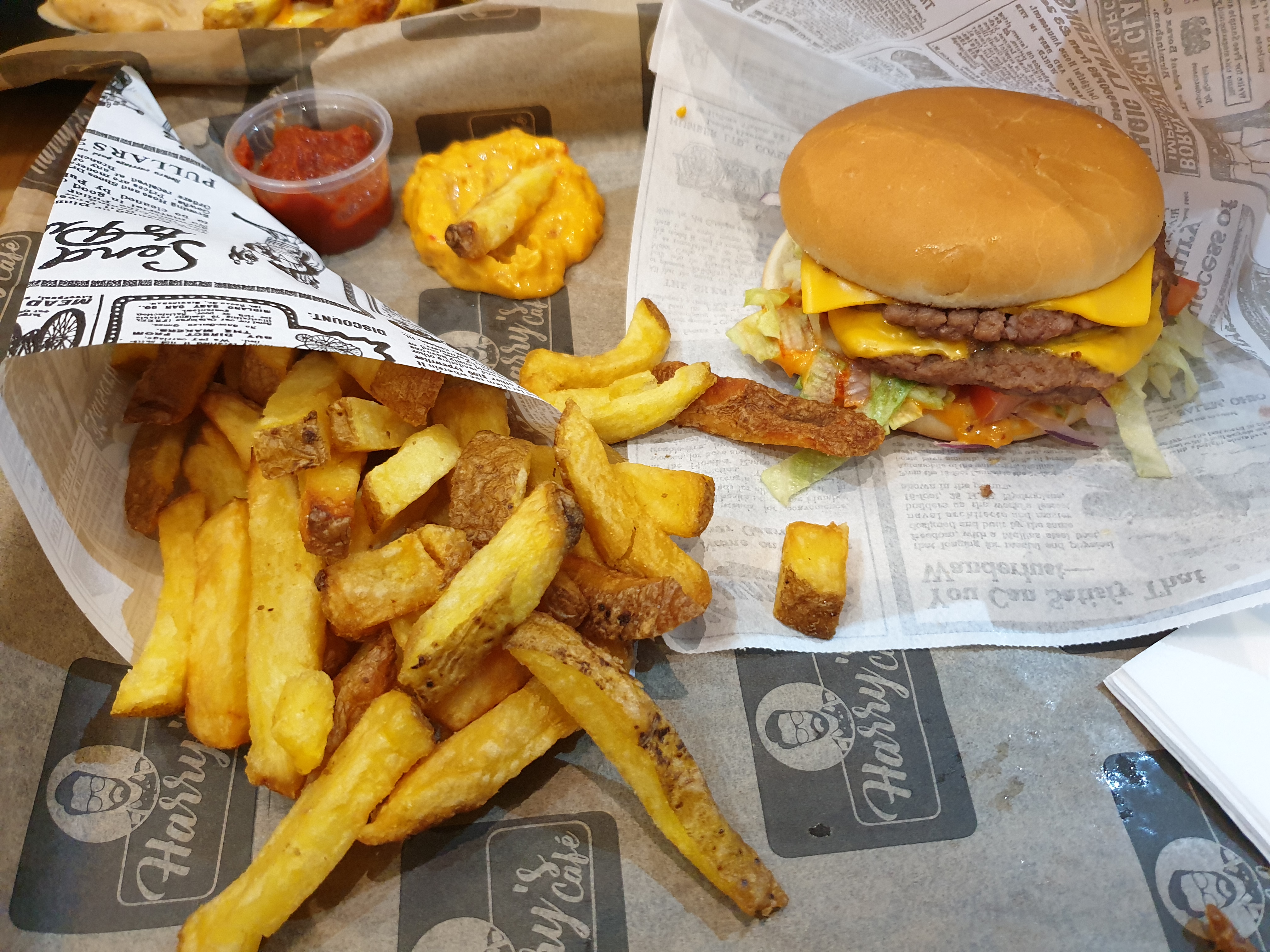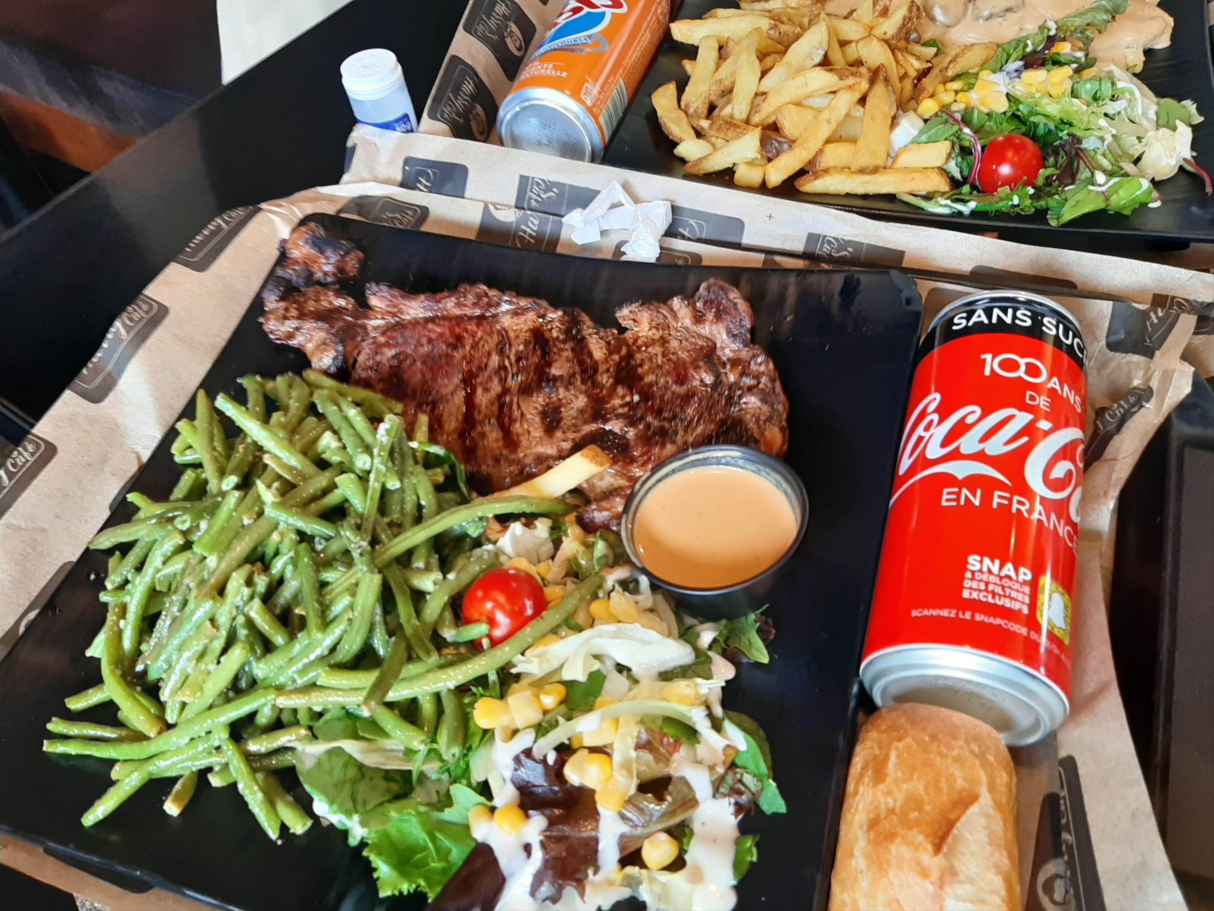 Hary’s café était mon endroit préféré entre amis jusqu’à que lorsqu’un soir je commande mon entrecôte habituel et j’avais pris un supplément frite. Et lors de la récupération je découvre un oublie de mon supplément et quand je l’ai réclamé on m’a passer une petite boîte avec exactement 10 frites dans la boîte en me disant qu’il nous reste plus bcp. Je savais plus quoi dire!!! Mais c’est pas la faute du client qui a payer d’entendre ce genre de choses, aussi le système de payement est catastrophique sur les bornes, car quand nous sommes entre amis et que chacun paye pour sois on reçoit nos commandes en décalé et le temps que tout le monde soit servis tout refroidit. J’espère ce problème va être résolu dans les meilleurs délais. Sinon la qualité est top la viandes est très bonne et la communication est agréable.