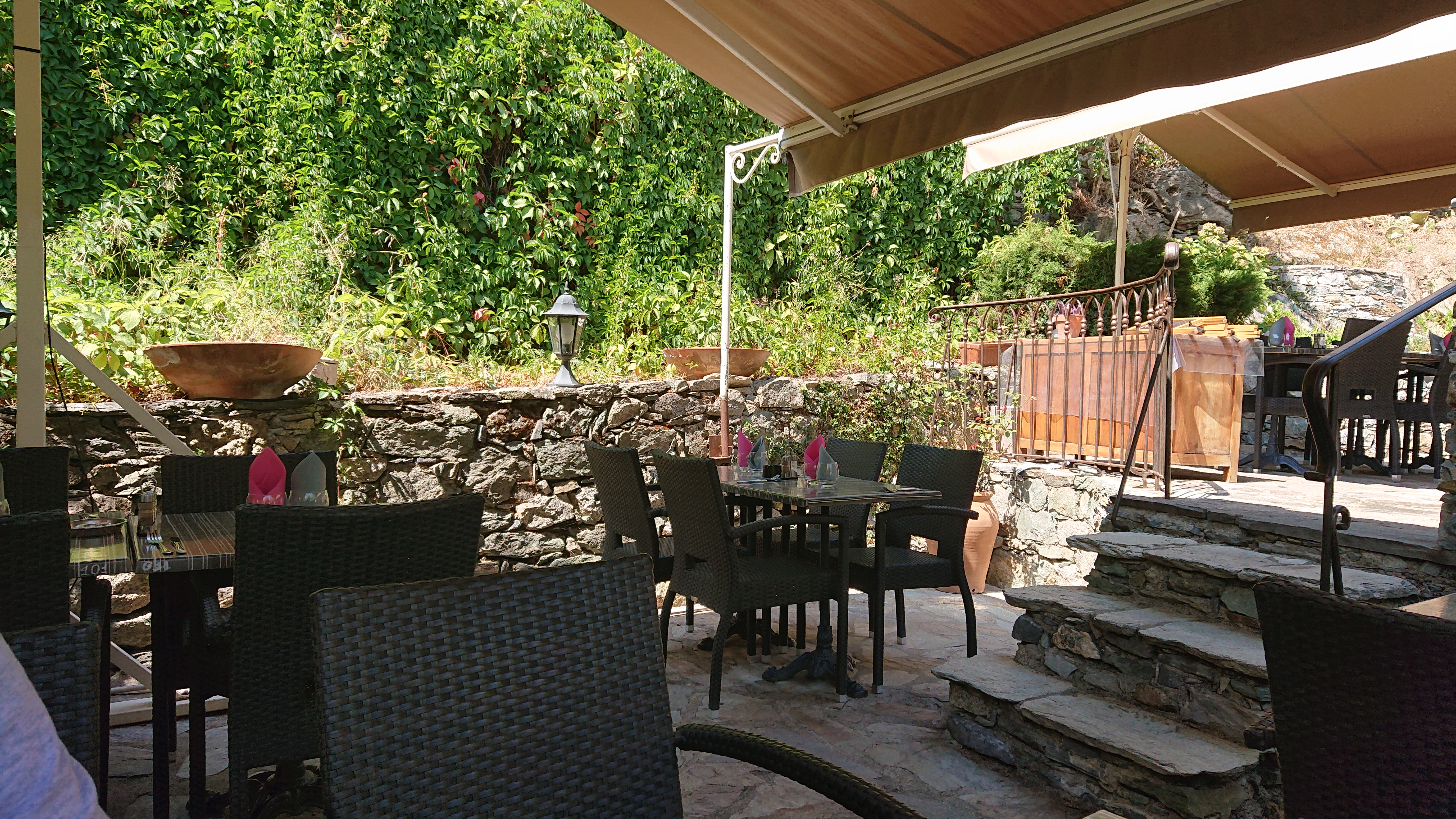 Petit restaurant à l'ombre sous le belvédère, cadre romantique sur petite musique Corse, repas burger copieux