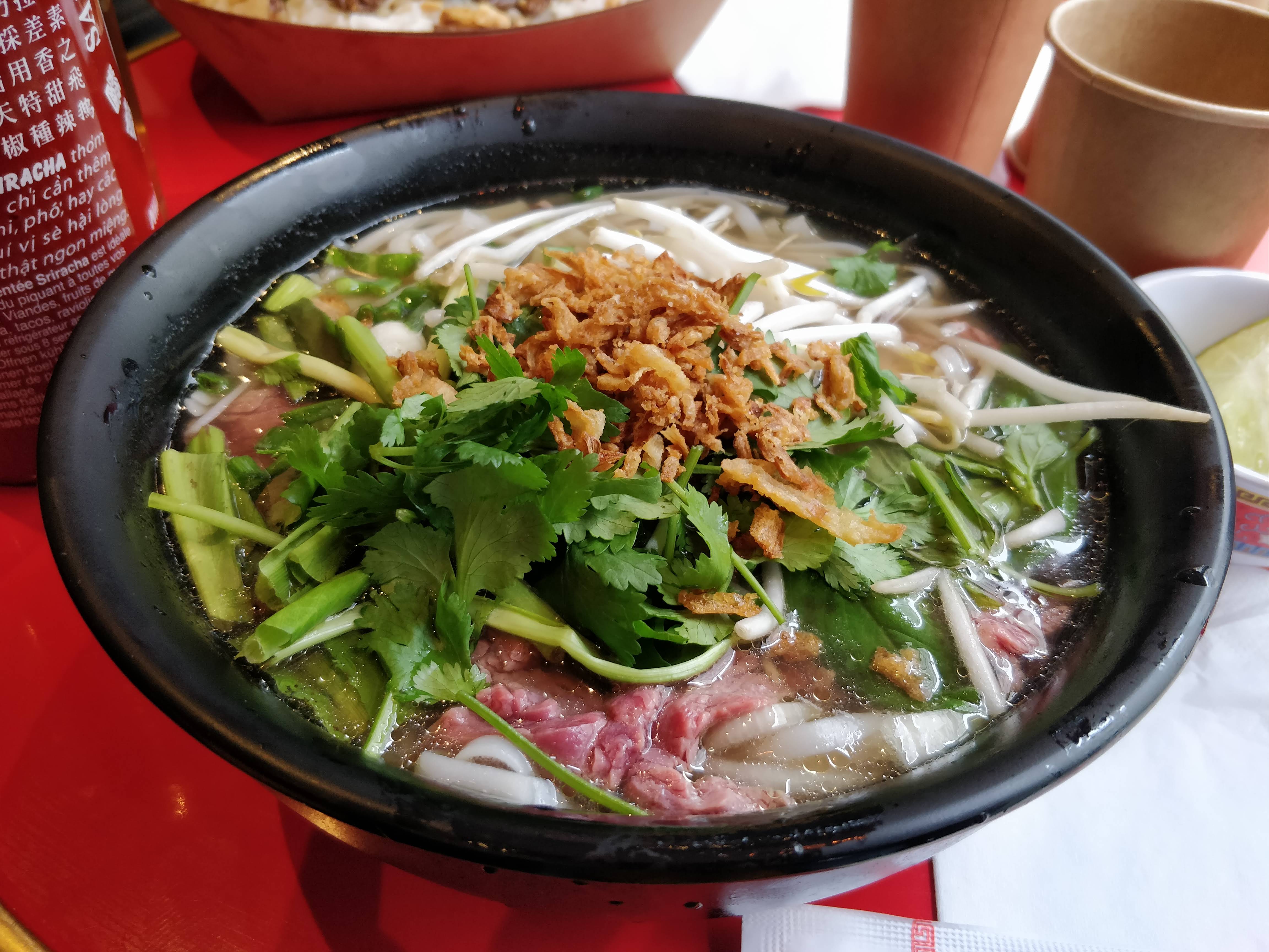 attention : restaurant surnoté. Ambiance mini fast-food. Nous avons pris un Pho au bœuf et un Bo Bun au boeuf. Les points positifs : - service rapide - personnel aimable - portions copieuses - crudités fraiches. Les points négatifs : - le bouillon du Pho moyen (pas trop le gout du bœuf, oignons frits qu'on ne devrait pas trouver dans un Pho,) - les nems ne sont pas bon, ni en goût, ni en consistance (bouillie). La galette de riz qui enrobe la farce devrait être craquante/croustillante. - la salade, et la menthe dans le Bo Bun devraient être coupées en lamelles très fines - la sauce nuoc mam est très légère, (manque piment et ail ?)