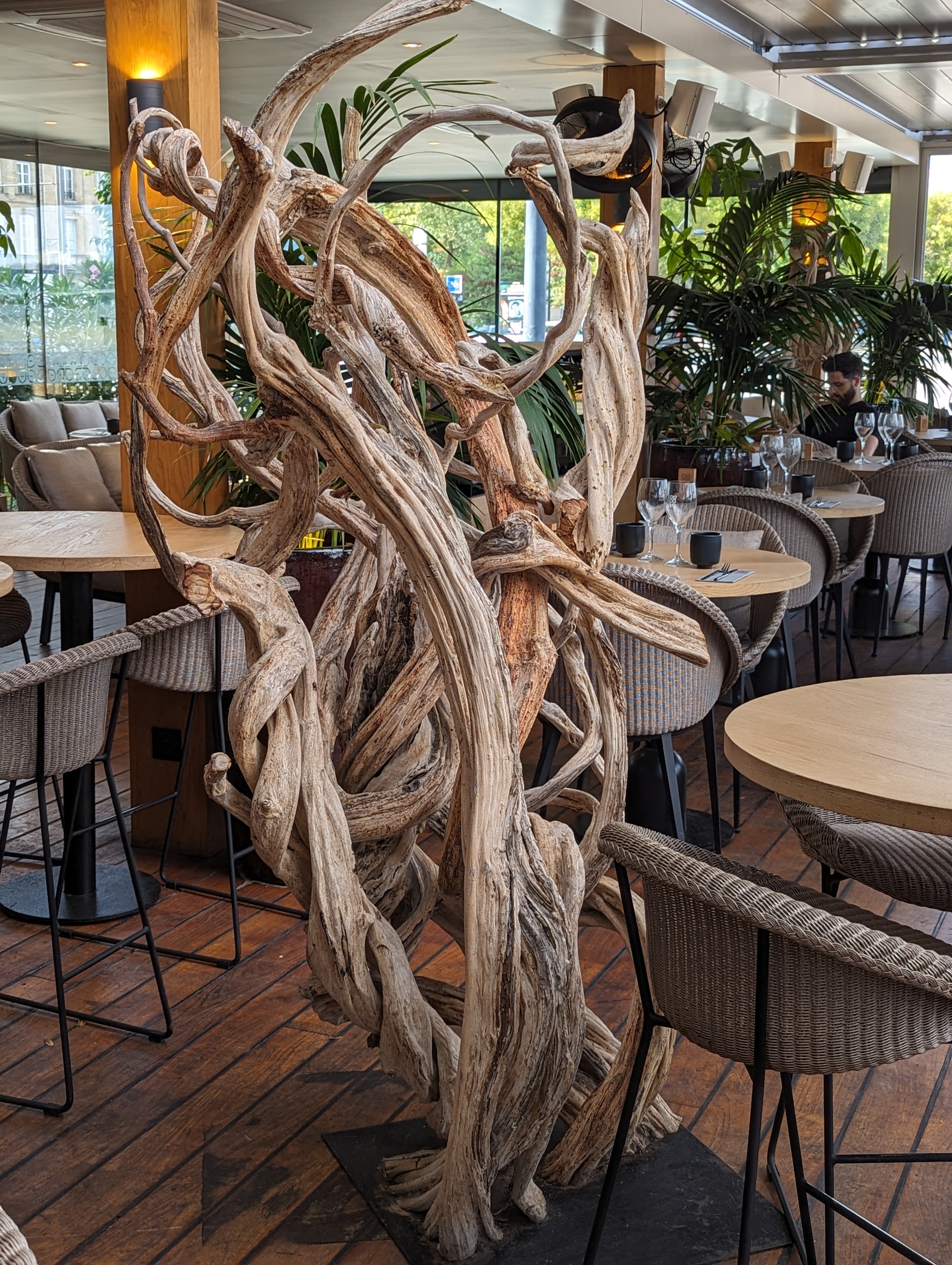 Difficile à noter car de très bon points, comme l’emplacement exceptionnel, le cadre soigné et plutôt classe, le toit ouvrant pour un maximum d’aération lorsque le temps en bord de Garonne le permet, le personnel très sympa, l’ambiance dj, la qualité de la nourriture et la carte plutôt riche et variée. En revanche des points noirs rédhibitoires, comme le volume sonore du dj qui rend difficile et déplaisant la conversation alors qu’il était à peine 20h30 et qui gâche ce qui aurait pu être un tres bon moment, et évidemment les prix qui sont complètement excessifs: 23€ une salade caesar (très bonne) et 29€ la poitrine de porc delicieuse mais plutôt petite et tres grasse et sans accompagnement (6 ou 7€ à rajouter pour des frites ou légumes). Au final, un lieu à éviter si le volume sonore n’est pas maîtrisé et que l’on privilégiera plutôt pour un simple verre. Pour manger les restaurants à Tourny ou St Pierre offrent un meilleur rapport qualité prix et sont à quelques pas seulement.