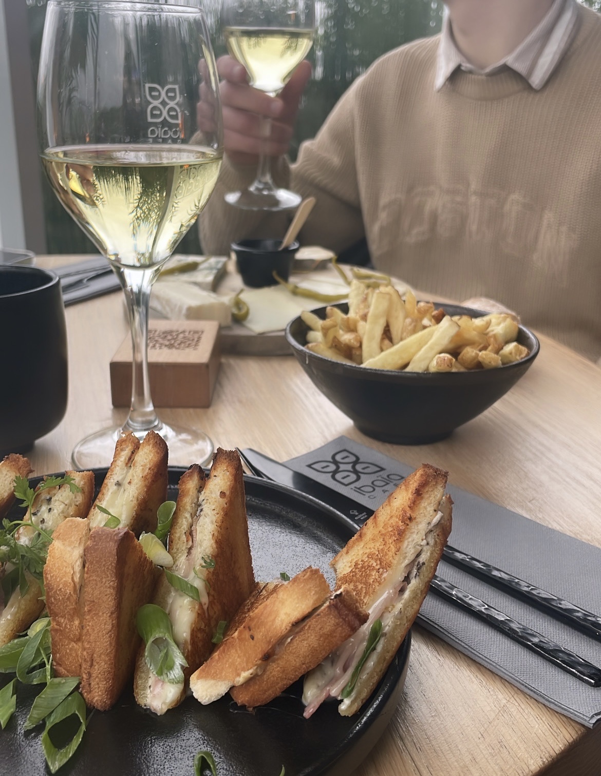 Nous avons eu du mal à comprendre les critiques négatives. En visite à Bordeaux, nous cherchions un lieu calme et chaleureux pour déjeuner. Nous avons commandé du vin, une assiette de fromage, des frites et un croque-monsieur à la truffe. C'était délicieux et très copieux, difficile à finir. En clôture et surtout par gourmandise, nous avons partagé un moelleux au chocolat, (qui ressemblait davantage à un mi-cuit) super bon! Je recommande cet endroit pour un déjeuner abordable et copieux.
