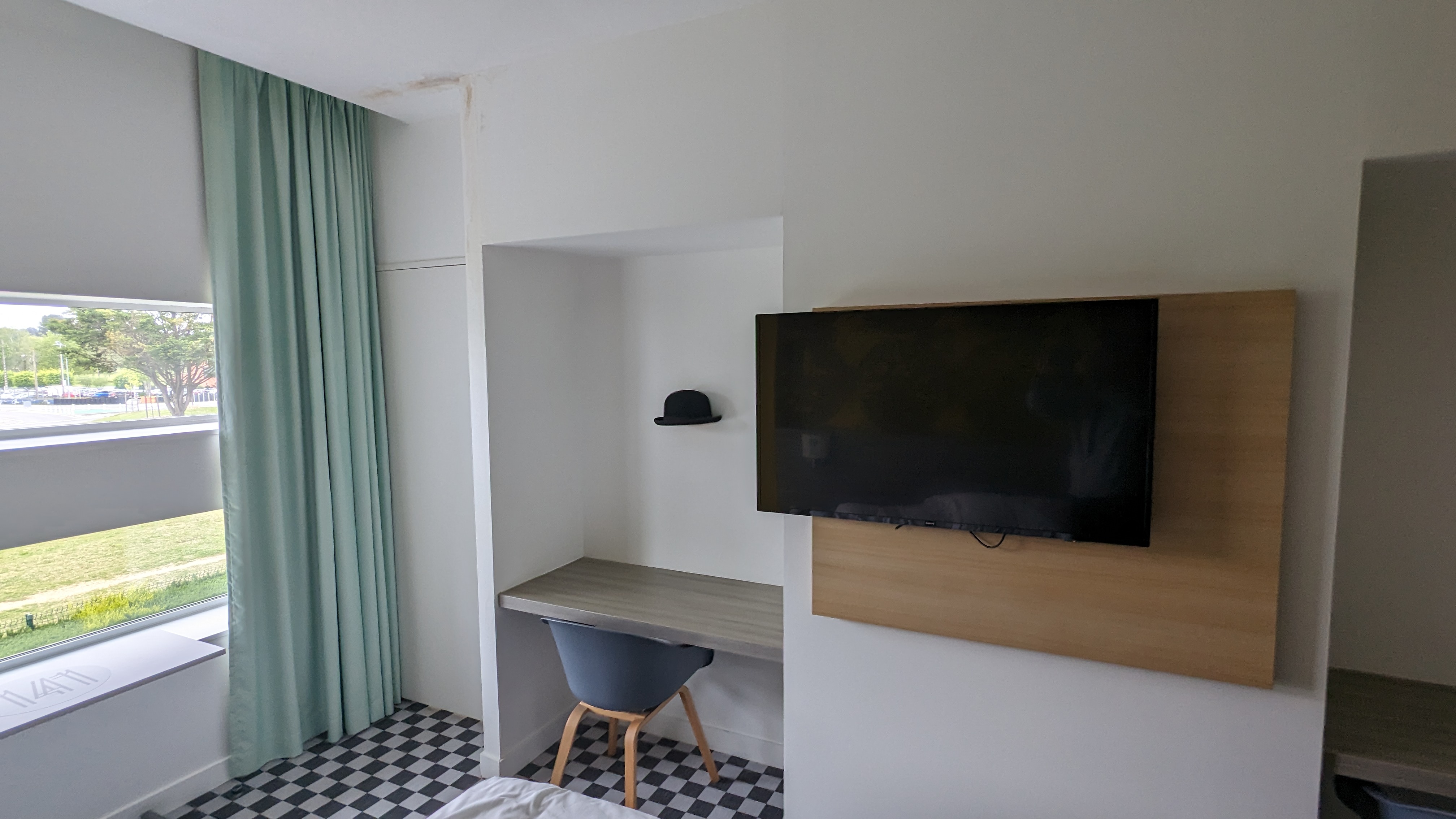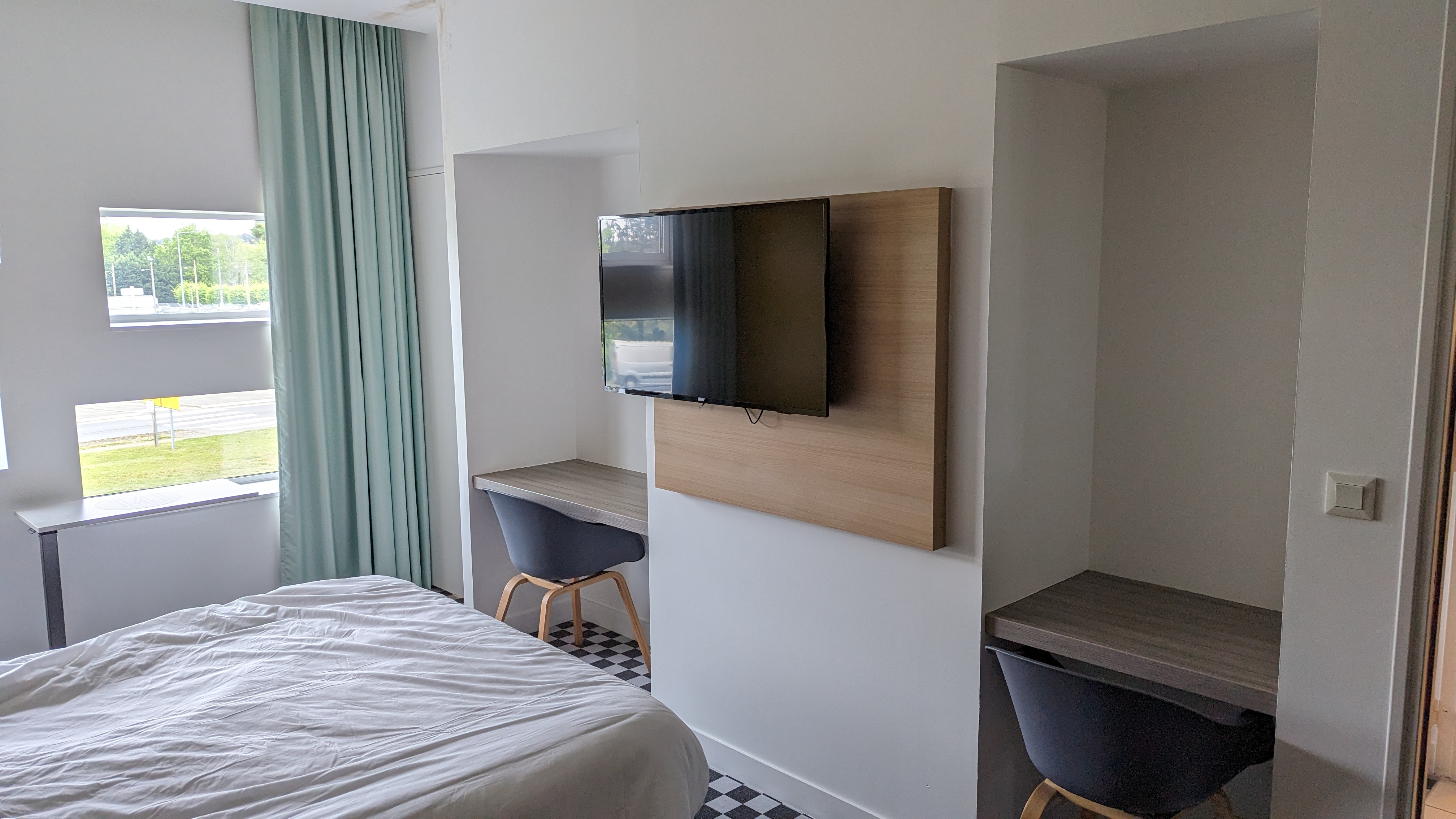 Hôtel spacieux, calme, propre, décoré avec soin. L’accueil est agréable, souriant. Restaurant, bar, pianos, tablettes, sont mis à disposition des clients, les enfants ne sont pas oubliés, tablette storio, planches d’autocollants, crayons de couleurs, bonbons sont aussi là pour les occuper dans le hall d’acceuil. La chambre (familiale) est grande, lumineuse, bien tempérée, bien équipée (grands écrans TV, nombreuses chaînes même payantes, prises USB, liseuses, bureau, canapé, penderies, WC séparés de la salle de bain avec sèche-cheveux, baignoire,...). Le petit-déjeuner à volonté est varié, frais, approvisionné. Pour moi cet hôtel est un sans faute! Quoi que le parking était complet on a trouvé la dernière place, ouf !