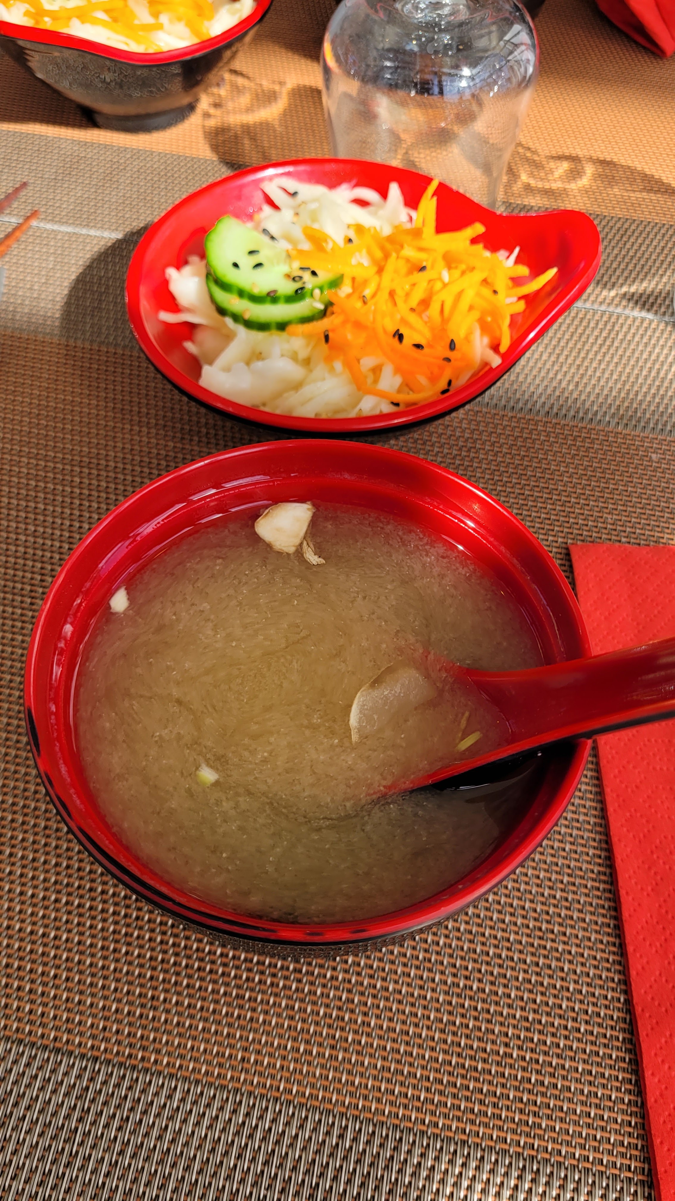 Les règles sanitaires sont respectées et le service est très appréciable. La salade et la soupe miso ont du goût.