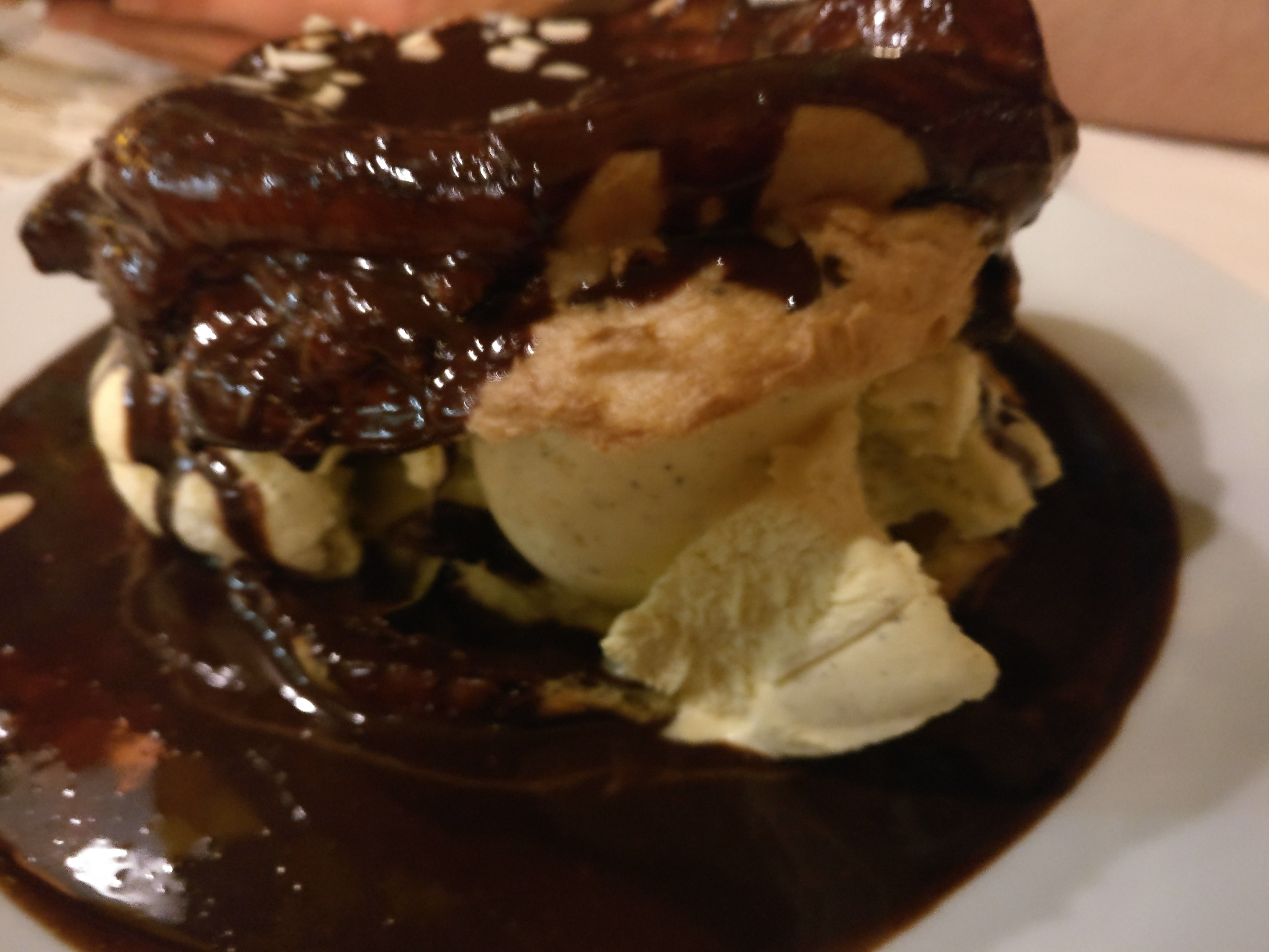 J’ai adoré le cadre de ce restaurant. Un vendredi soir entre amis, on a mangé sur la terrasse. J’ai adoré. Les plats sont très bon et le prix raisonnable. Dommage que nous avons dû entrer à l’intérieur pour le dessert, mais à cause du voisinage. Les desserts sont TRES copieux ! Sur la photo ce sont des profiteroles. Petit bémol qui m’a dérangé, un couple de serveurs qui se bécotaient en plein service au comptoir. Je trouve ça déplacé devant les clients. Et au moment de boire le digestif nous avons demandé du rhum vieux, qui avait le gout du captain morgan 🤔:Pour les connaisseurs. Mais j’en reste quand même satisfaite.