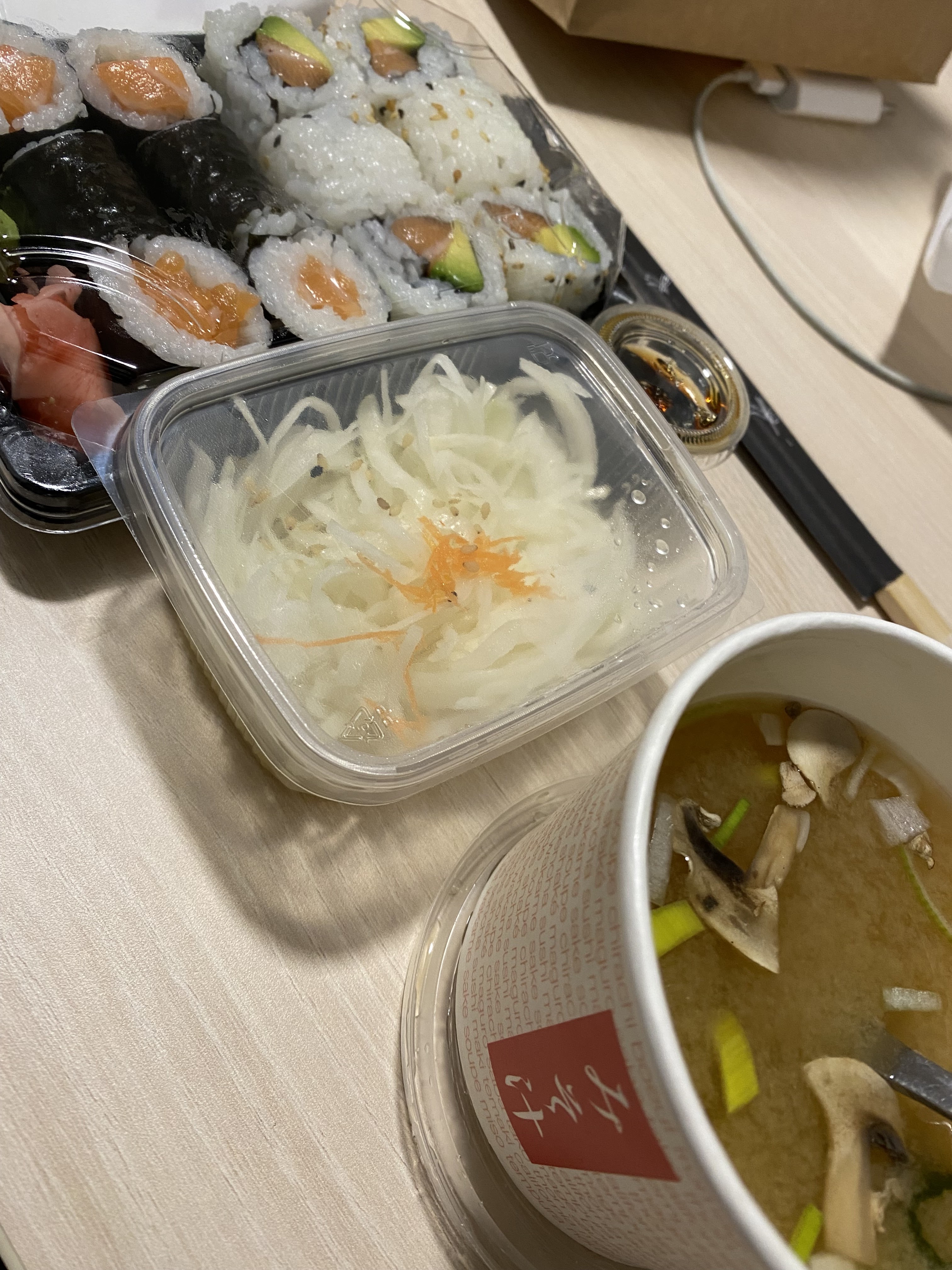 Sushi saumon + maki california thon/avocat + temaki saumon avocat -Produits frais- présentation soignée-portions généreuses -Accueil téléphonique (arrangeante) et livreur affables