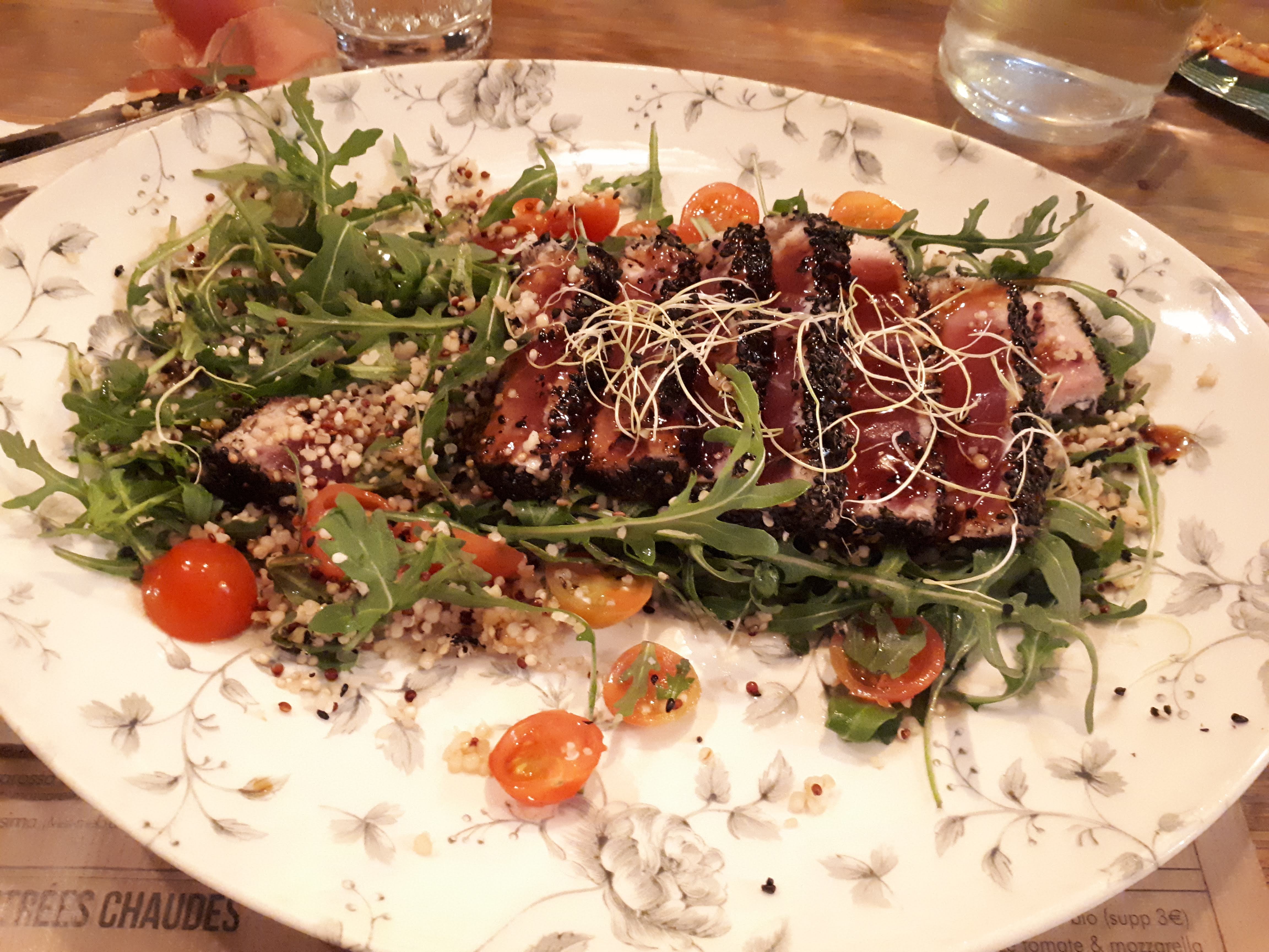 Charcuterie au goût prononcé et mi-cuit thon croustillant excellent. En plus la déco est top avec vue je la tour Eiffel au coin de la rue