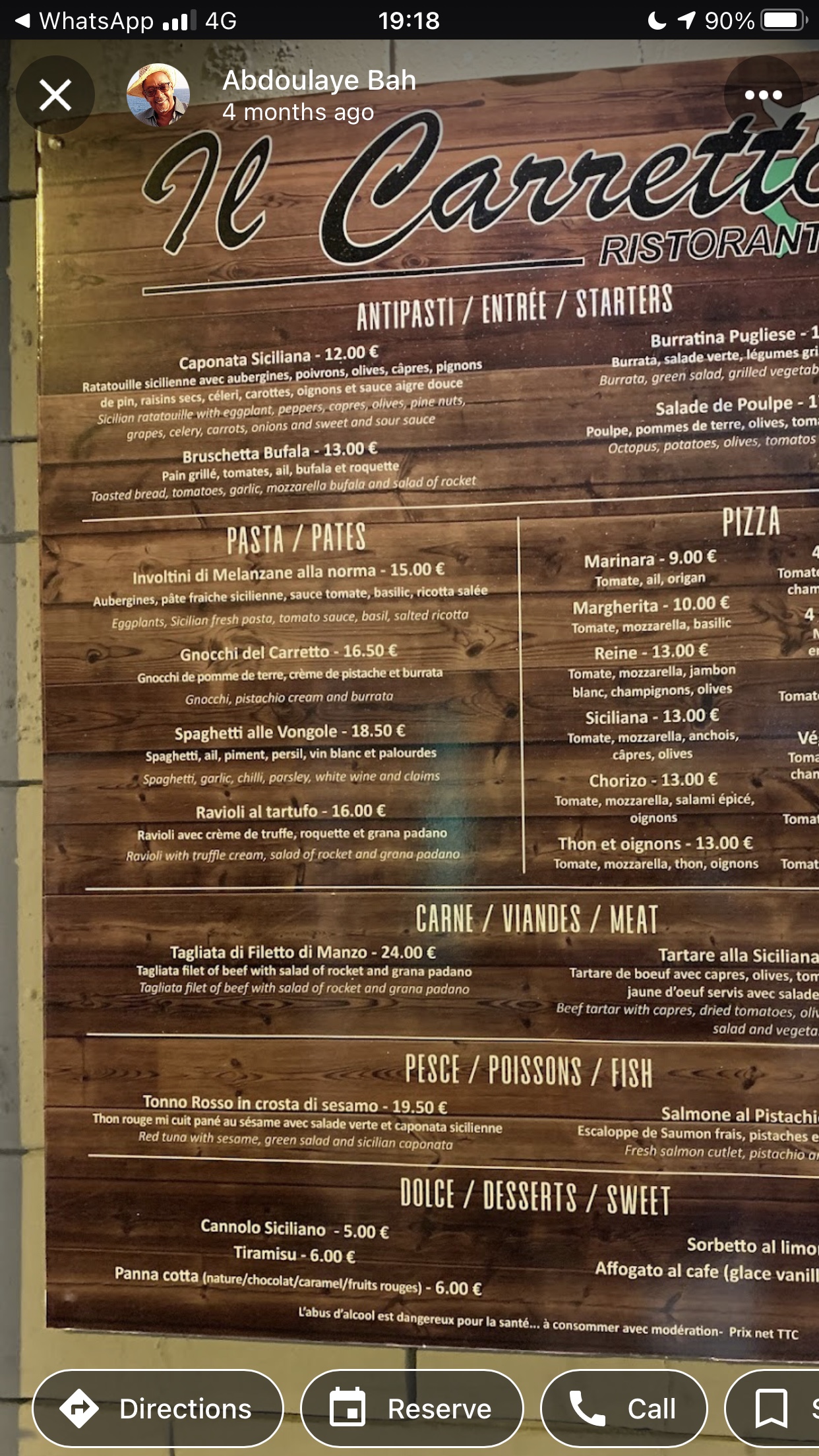 J'ai dîné en couple sur réservation, personnel très sympathique et accueillant. Le lieu n'est pas très grand mais les tables sont confortables pour être en France. Nous avons essayé tous les choix du menu, des boulettes de viande de grand-mère à la parmigiana !! Vraiment bien, ça vaut le coup d'essayer.... Tout d'abord, des gnocchis à la pistache et des spaghettis aux palourdes... J'avais l'impression d'être en Italie à Nice !!! Très bon dessert tiramisu à la crème. Nous reviendrons pour essayer la pizza. Le chariot... Excellent.