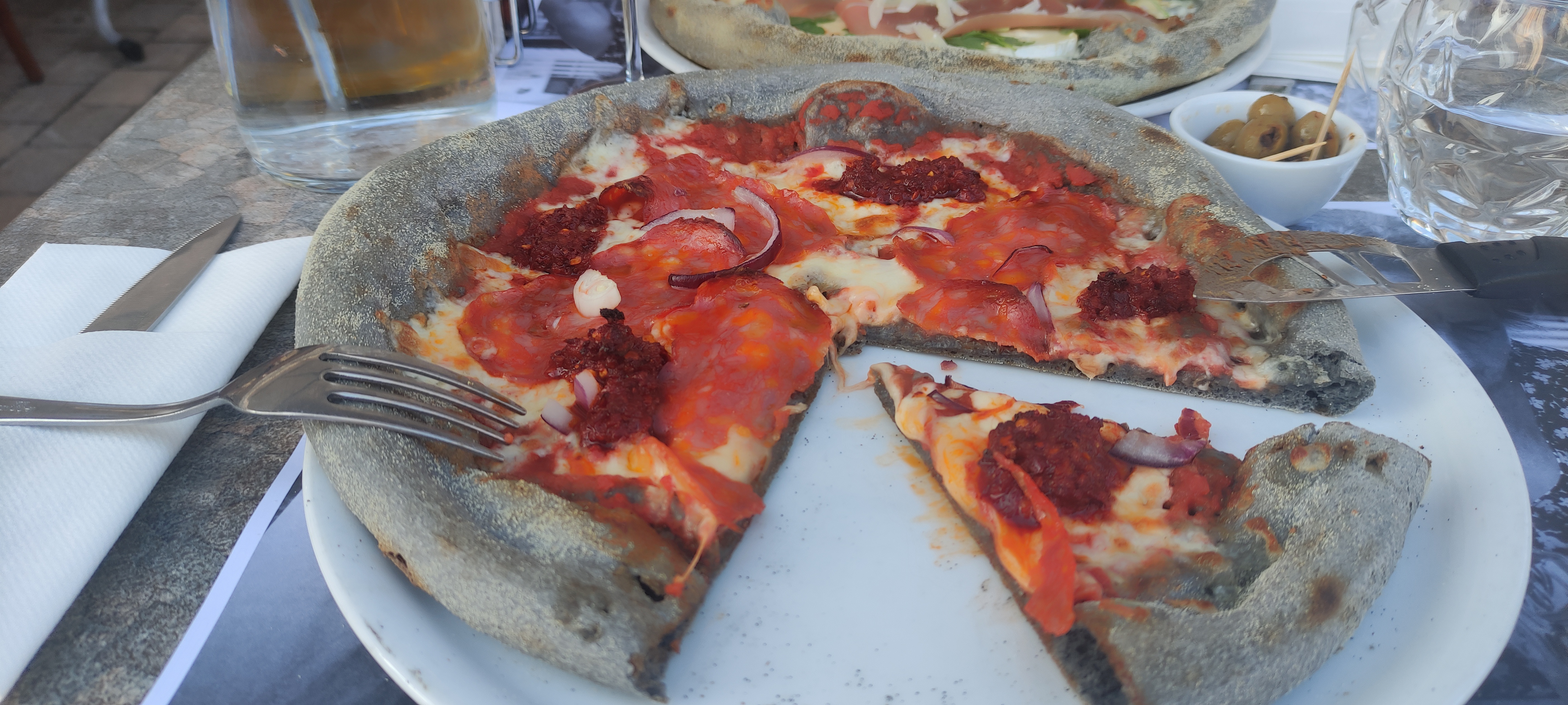 Une pâte à pizza originale au charbon végétale qui n'altère pas le goût ! Il vaut mieux réserver en raison de l'affluence !
