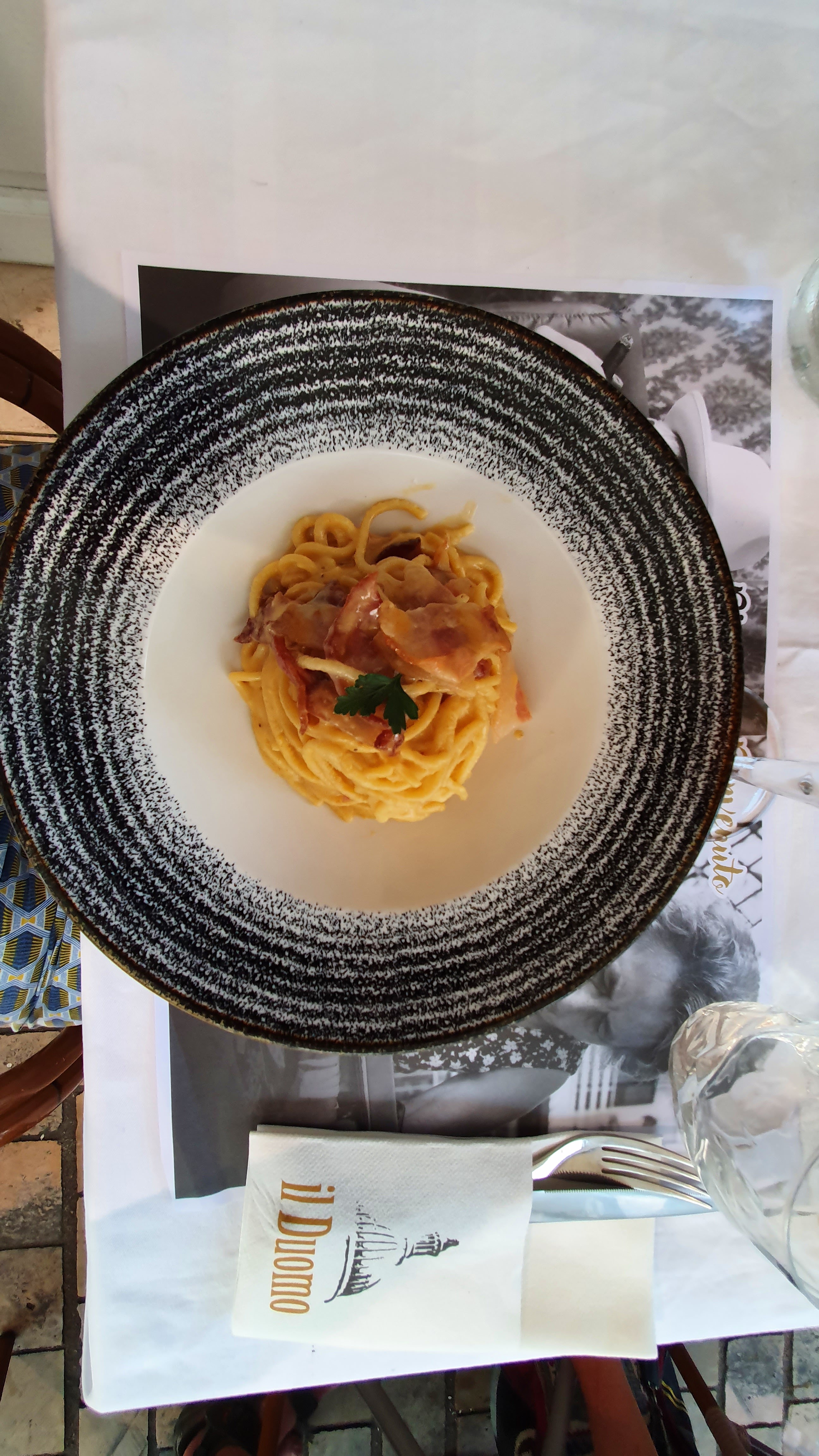 Nous n’avions pas réservé, ce qui avait l’air de déranger les serveurs. Regards noirs et tête d’enterrement voilà ce qu’on a eu en entrée ! Personnel désagréable et pas accueillant, limite hautain. J’aimerais noté les carbonara mais il n’y avait pas assez de portion pour me faire un avis…. Qualité prix déplorable Au moins le pain était bon… A fuir, ne perdez pas votre temps !