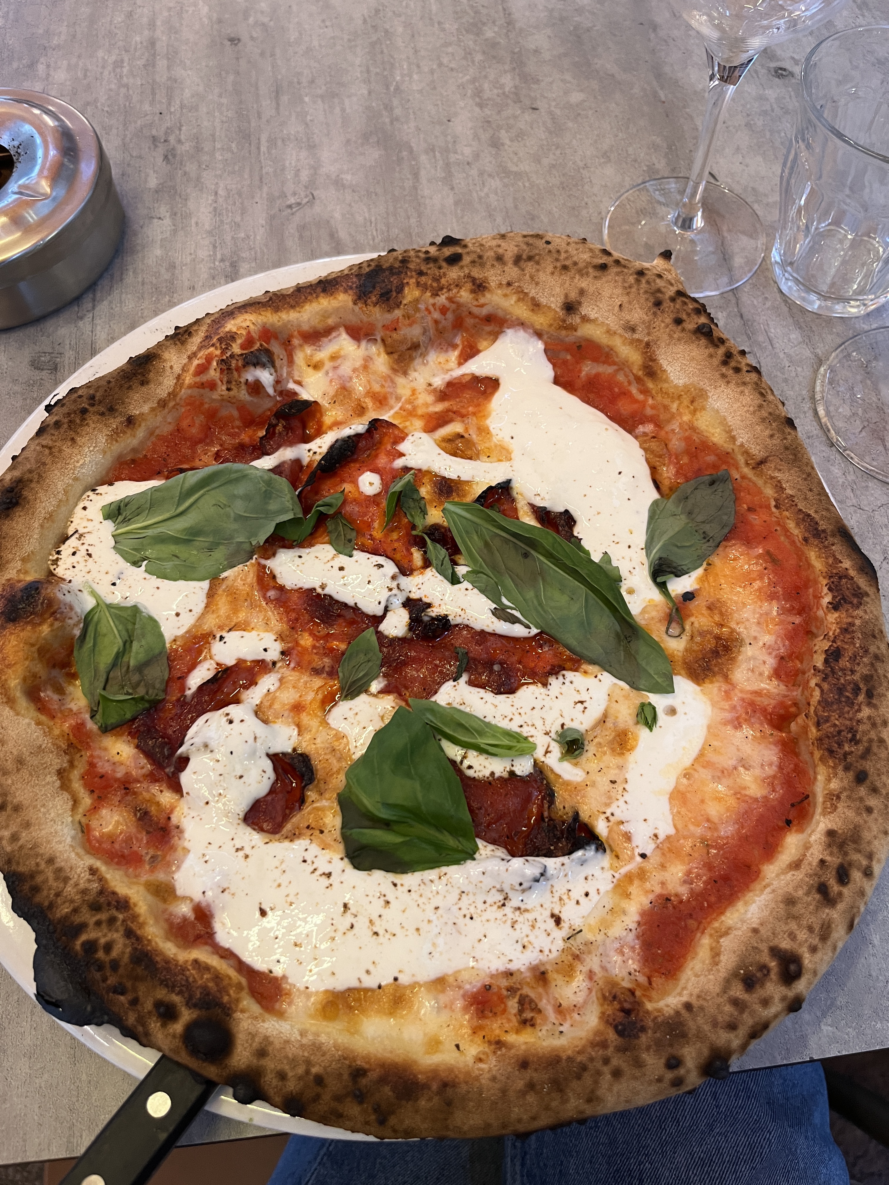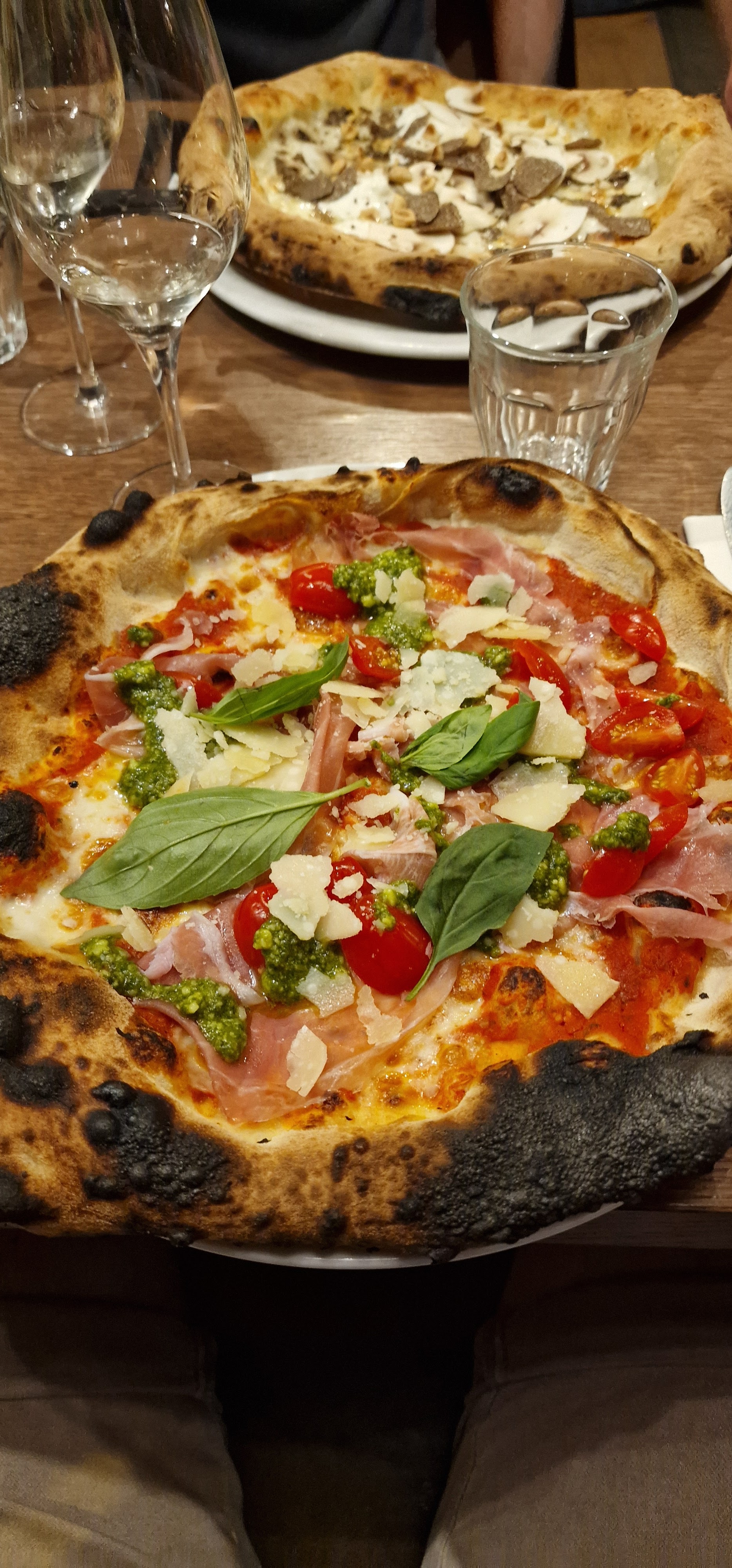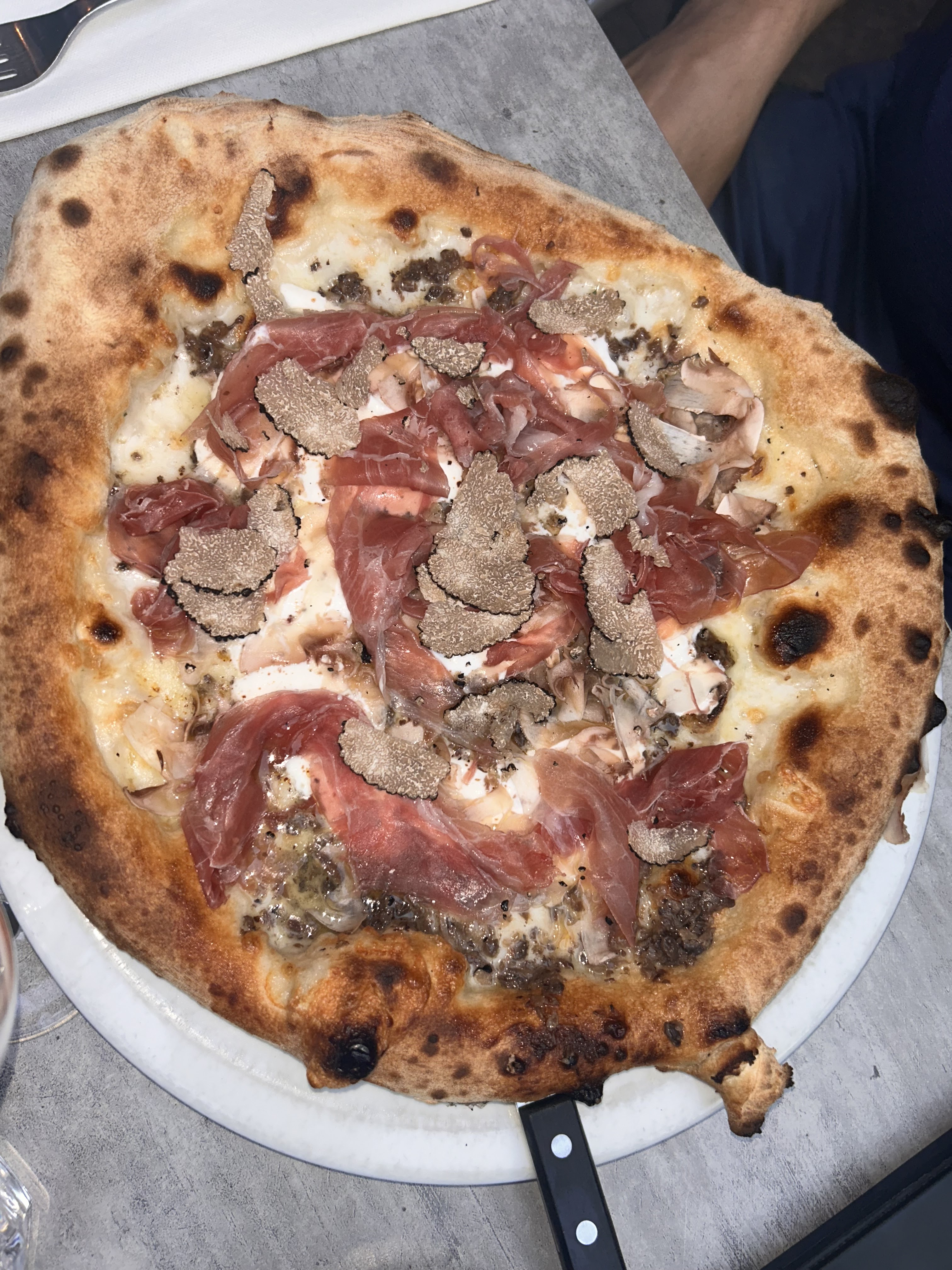 J'ai pris une pizza à la truffe. Je l'ai trouvé très bonne et la pâte est excellente sauf quelques endroits carbonisés sur les rebords surtout. La serveuse a oublié quelques petits détails comme nous proposé de l'huile pimentée et la carafe d'eau, il manque un peu de musique. Les prix sont élevés mais on paie la qualité qui est néanmoins au RDV.