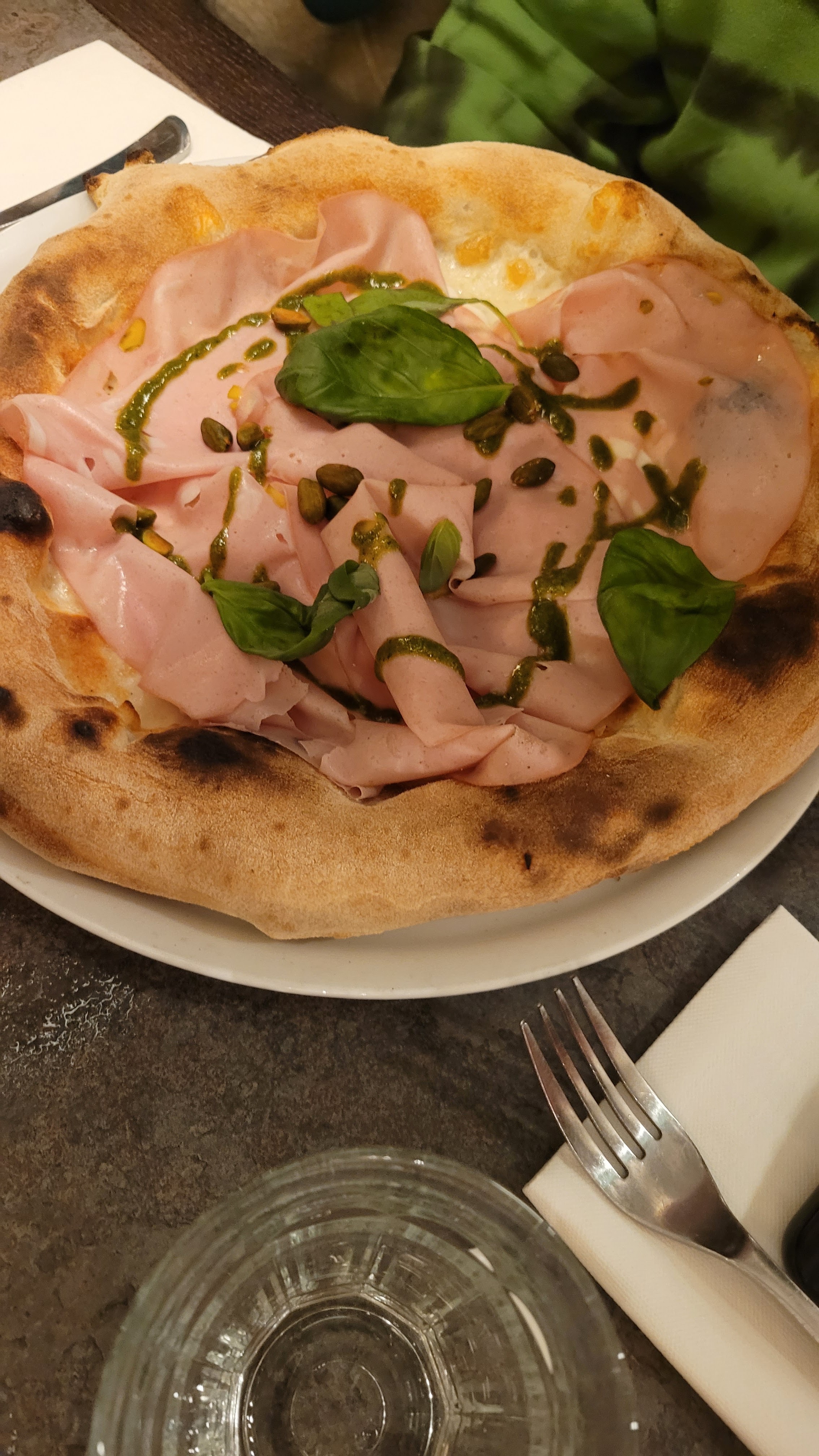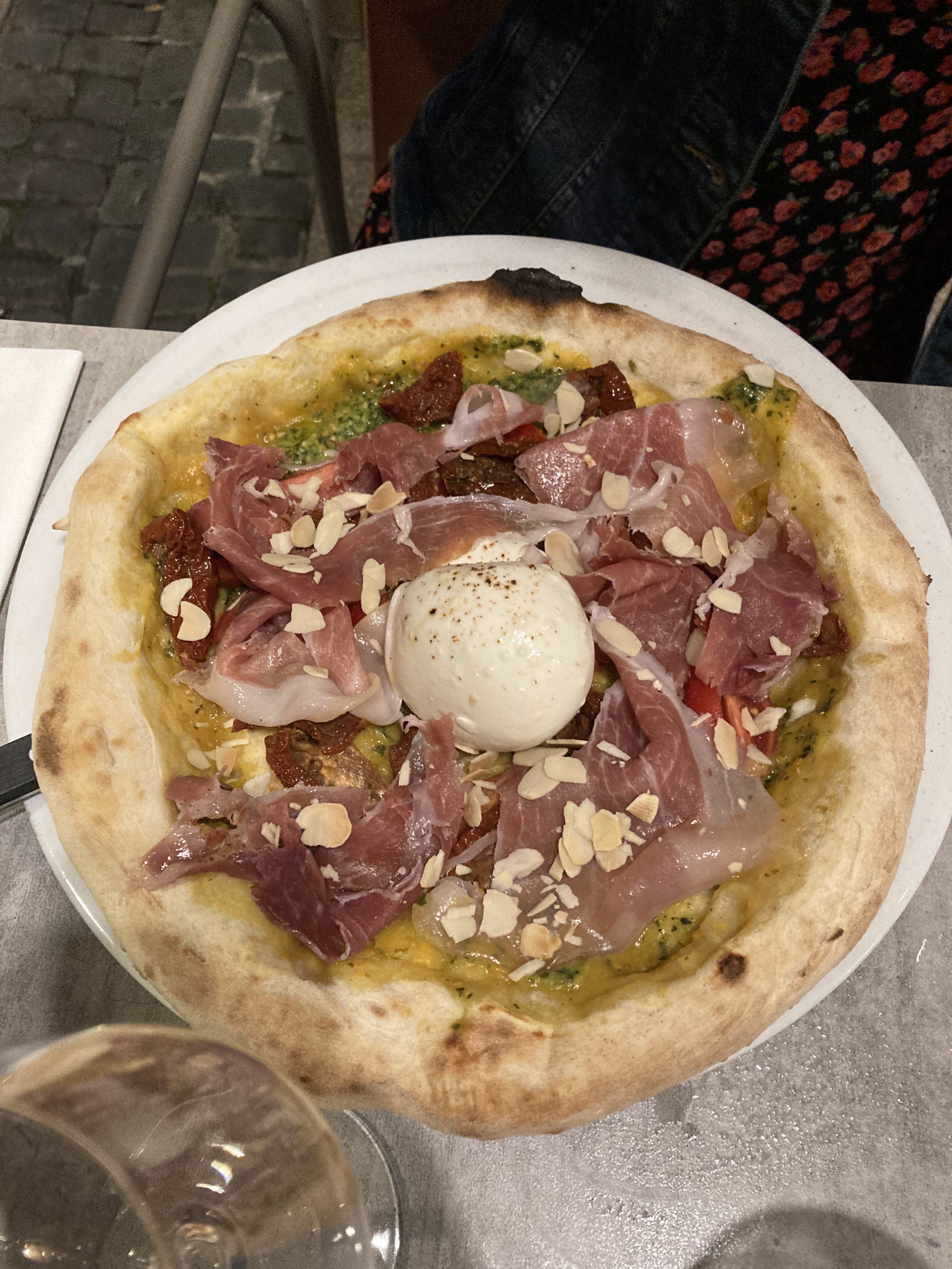 Très belle pizzeria. La nourriture était délicieuse. Nous nous sommes assis dehors entre les bâtiments et le temps était parfait. Il y a du tabac mais personne ne fumait. La serveuse ne parlait pas anglais mais était très serviable. La croûte de pizza était fine avec des bords parfaits, doux à l'intérieur et moelleux à l'extérieur. Les gnocchis étaient moelleux et moelleux dans un Alfredo fin avec beaucoup de saveur. Rien de tout cela n'était intense avec l'ail, même le pesto sur la pizza.
