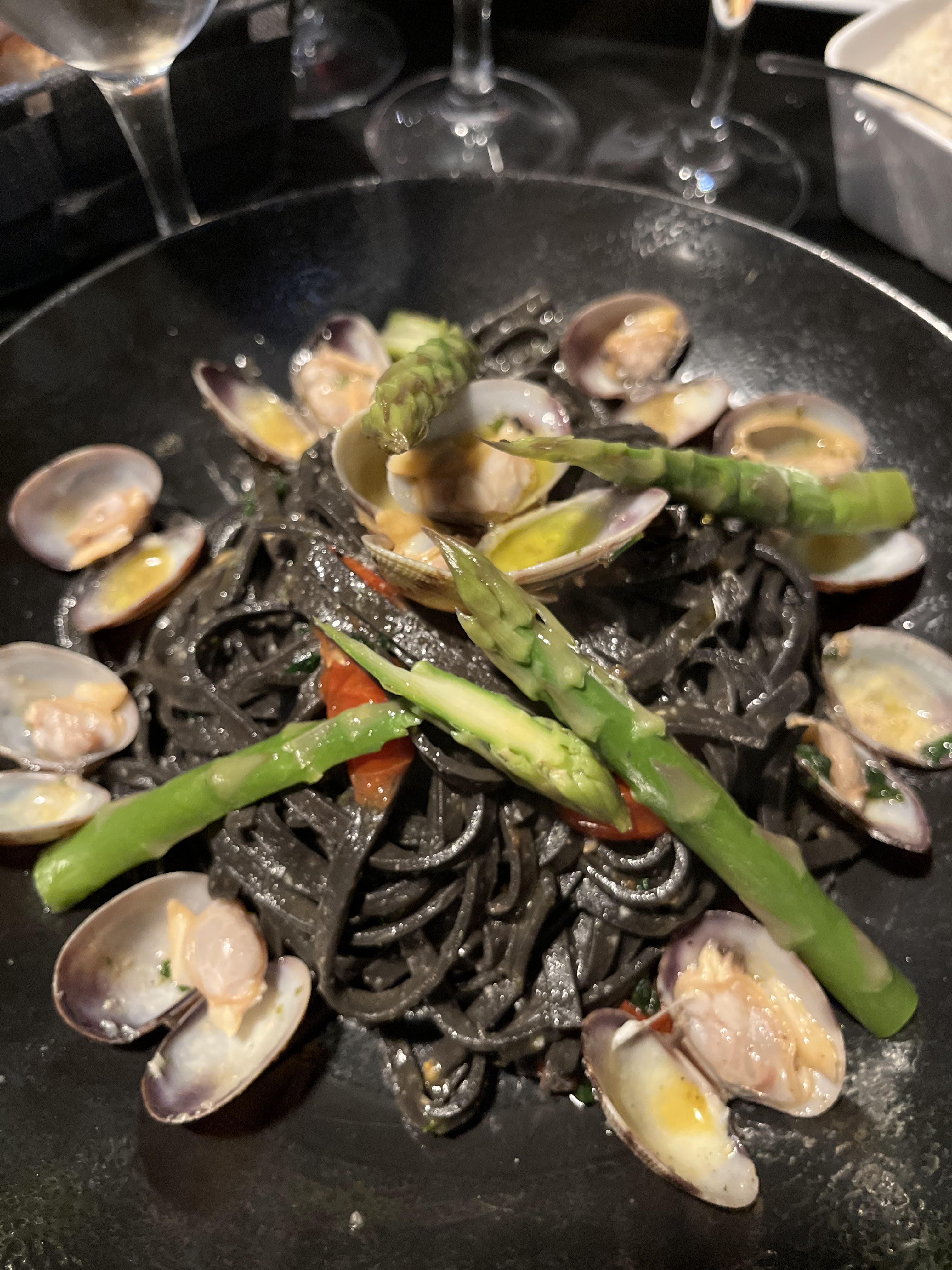 bon, mais un peu serré... Ça gâche le plaisir !! Pâtes à l'encre de seiche avec palourdes sympa, escalope milanaise un peu sèche.... Apero sympa.
