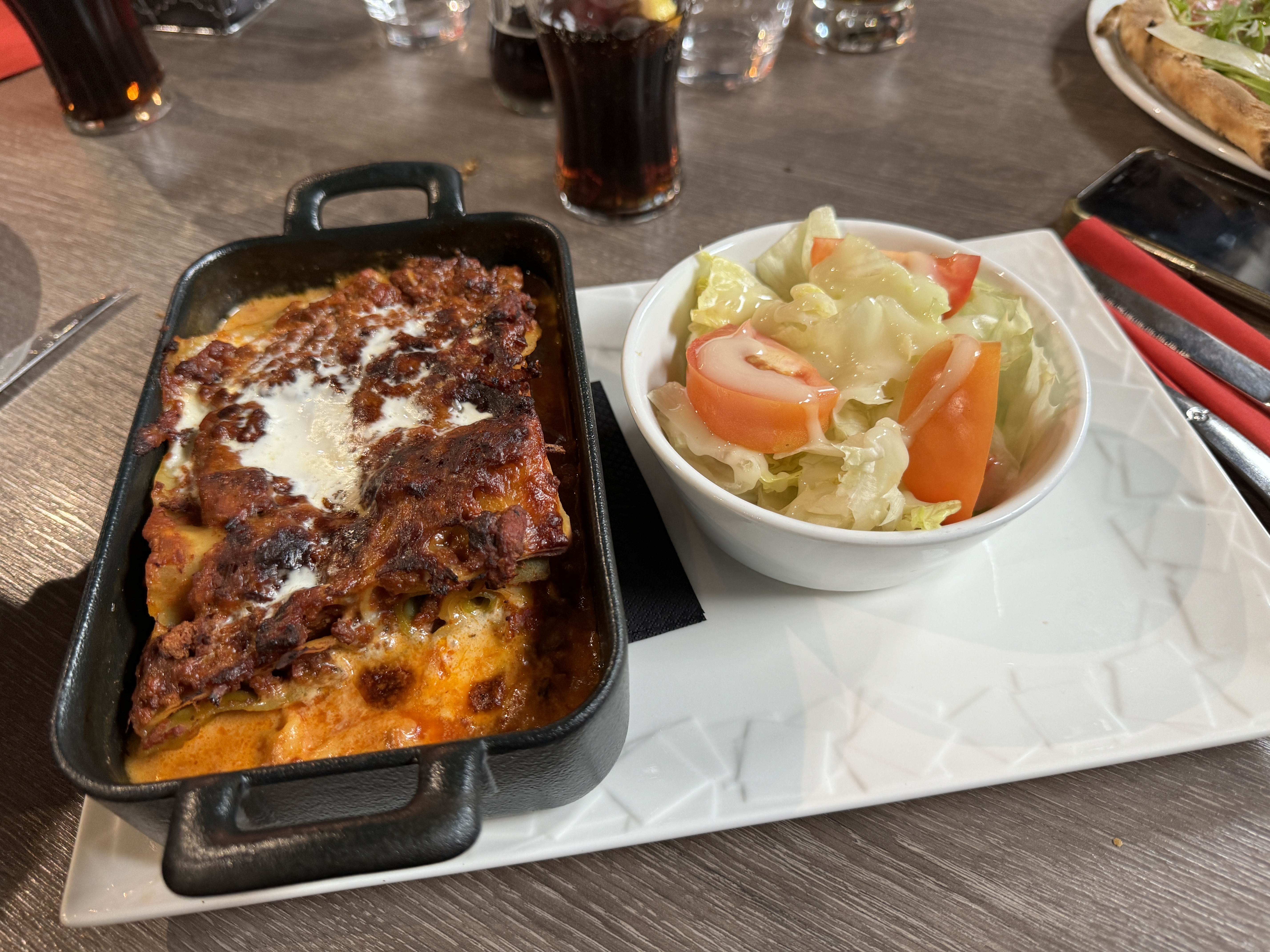 Service lent, serveuse avec les cheveux gris pas sympathique. Lasagne cramée sur le dessus et froide au milieu. Pizza pas cuite et sans goût. Juste le dessert relève un peu le niveau.