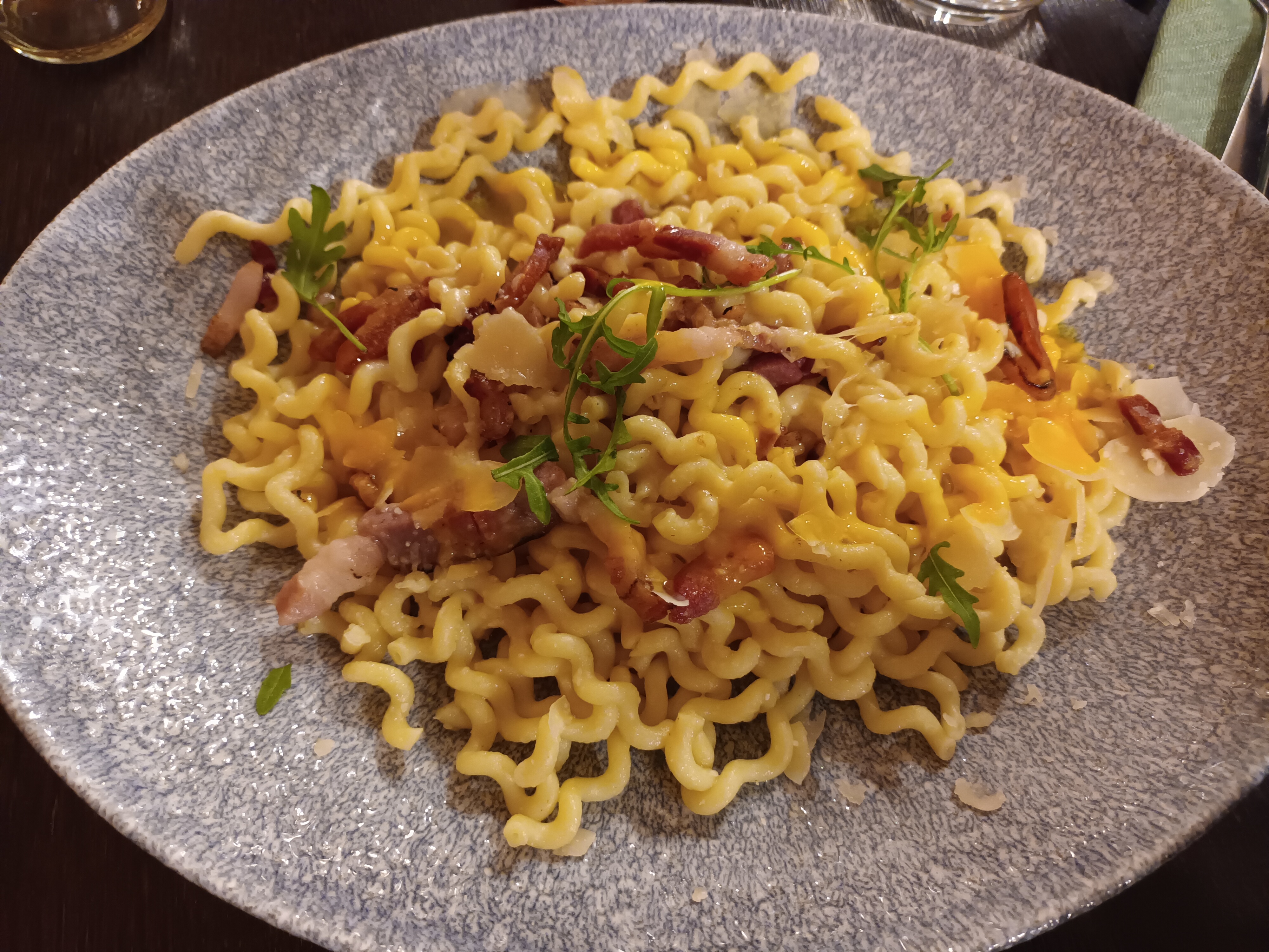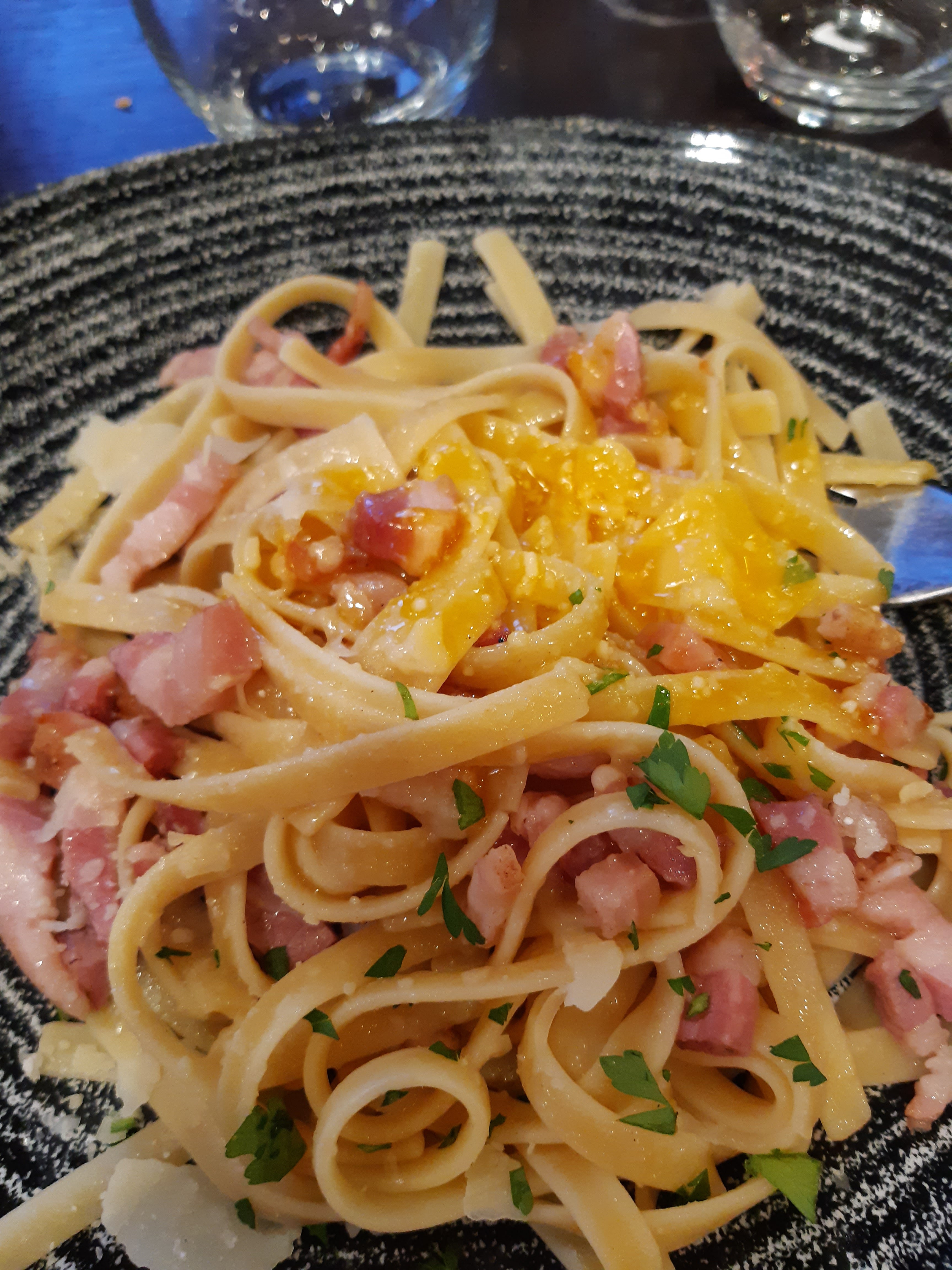 Pâtes carbonara servies froides réchauffées au micro-ondes et du coup omelette aux pâtes !!!! Très décevant...beaucoup trop de monde service long et clients négligés...