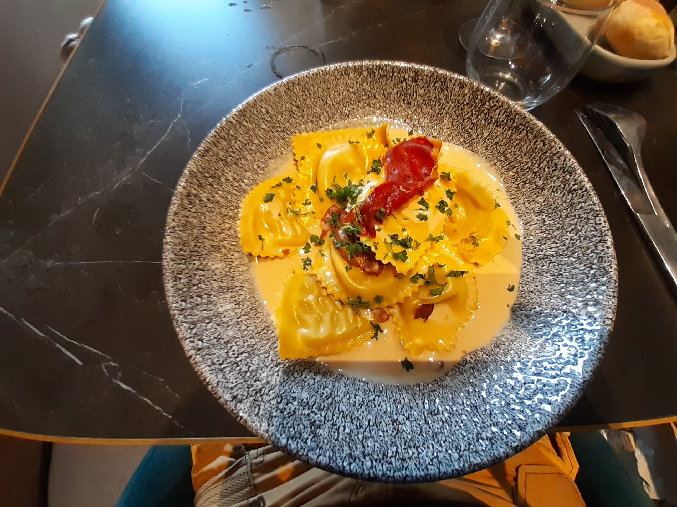 Des plats délicieux dans un cadre moderne agréable. Petit apéritif avant de goûter pizza et raviolis. Pizza délicieuse avec de bons ingrédients et une pâte légère mais que dire des raviolis... Succulents!! Une folie sous leur sauce onctueuse. Bravo! Un peu déçu du tiramisu classique mais bon quand même, la version framboise est délicieuse. Le service est de qualité, le personnel a envie de bien faire les choses. Je reviendrai goûter les autres plats ;)