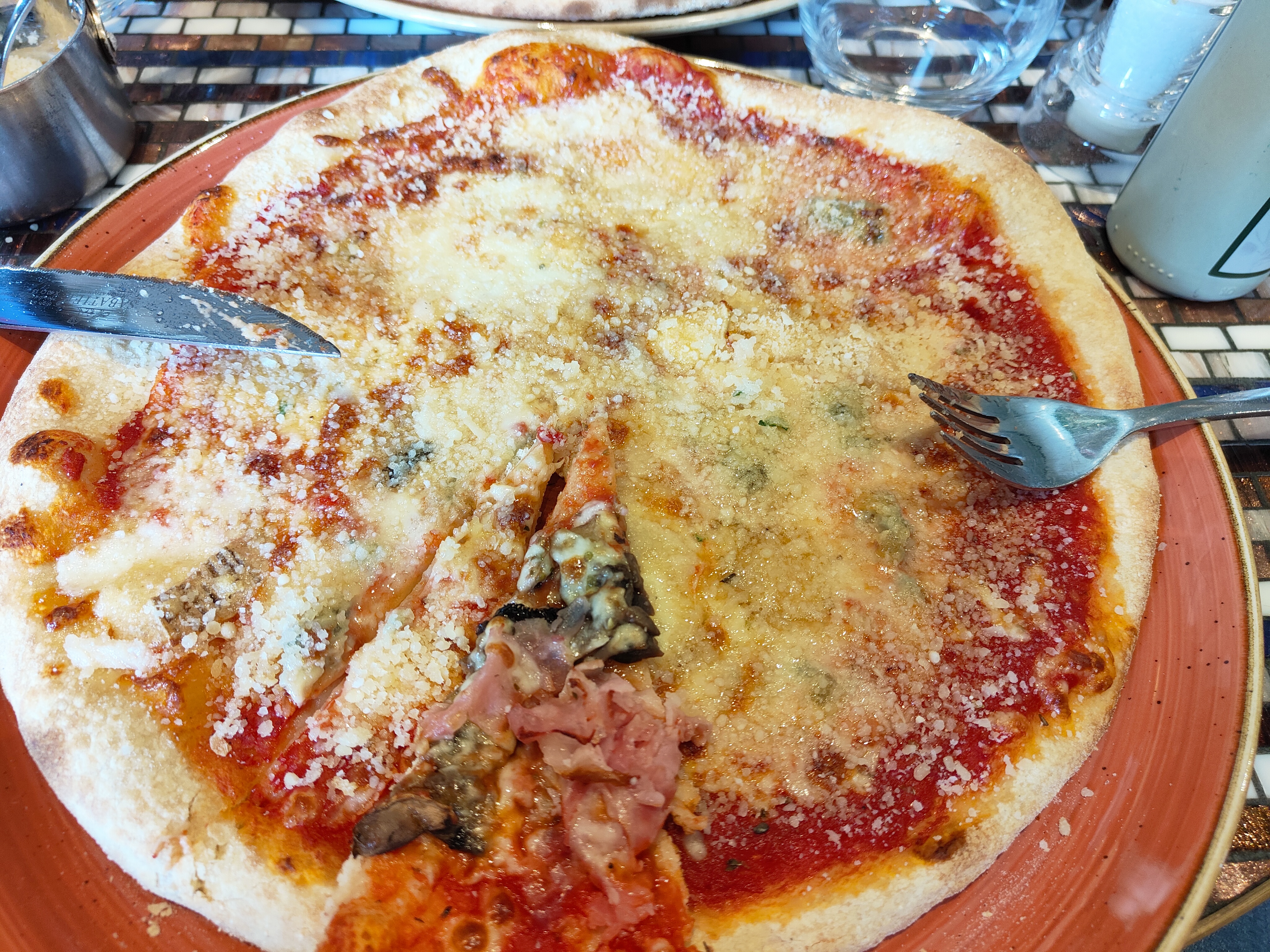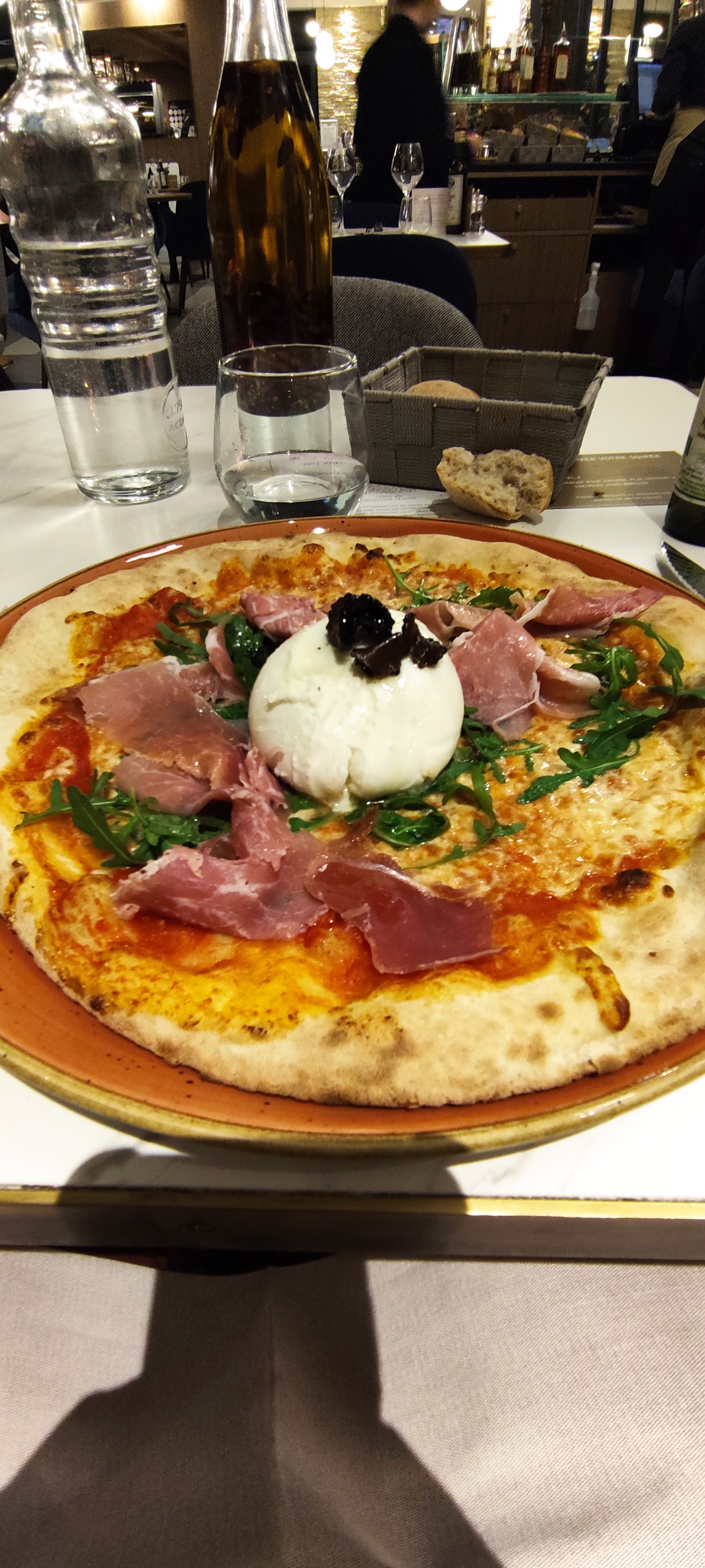Un petit moment en Italie 🇮🇹. Une bonne pizza 🍕 de façon originale et un café ☕️ appétissant. Nous avons bien mangés, la salle étant assez grande, on arrive à communiquer facilement. Malheureusement nous sommes arrivés durant un service où la plupart des serveurs étant en week-end pour l’ascension, du coup une seule serveuse pour tout le restaurant = beaucoup d’attente.