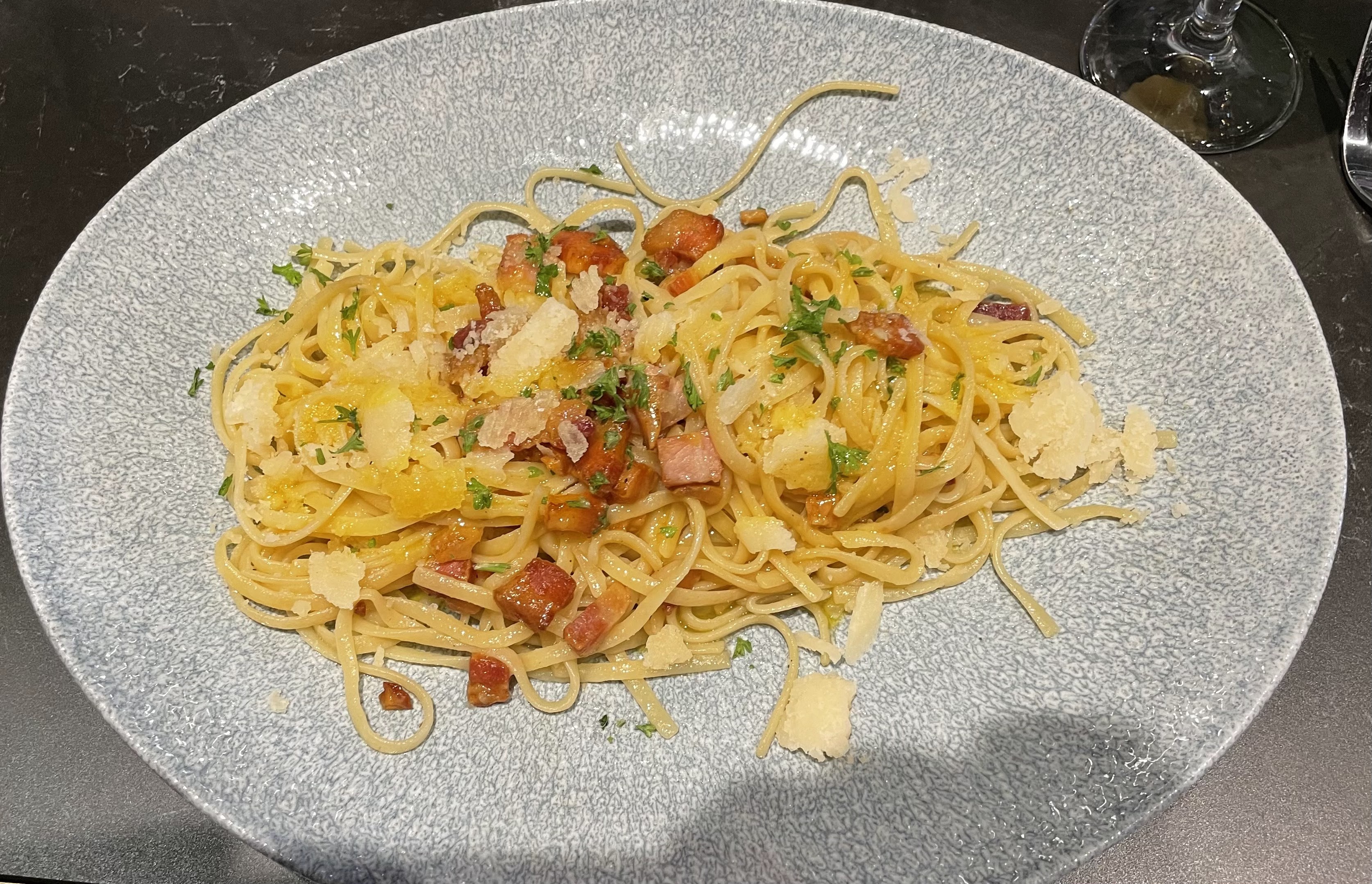 Été super mais la carbonara doit être plus crème seulement avec de pecorino et œuf et la panceta au guanchale très croustillant.