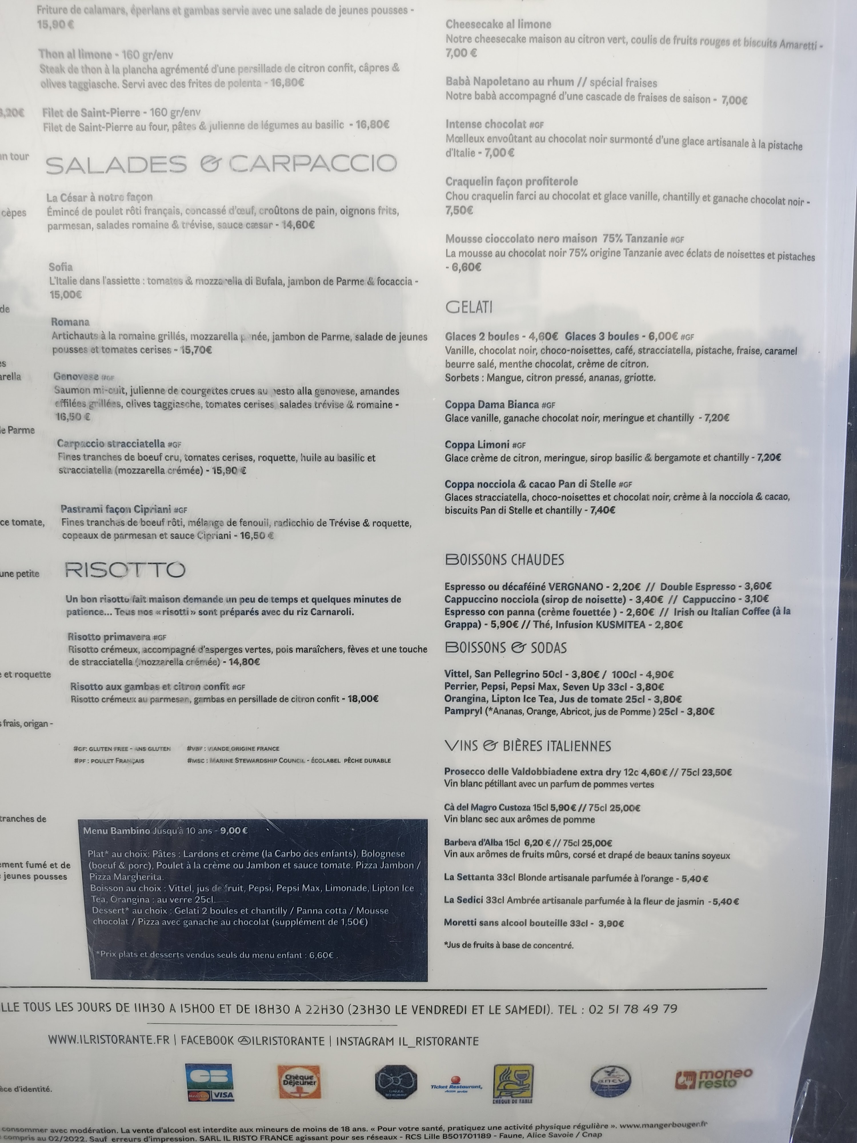 Restaurant proposant de très bons produits italiens ! Avec une ambiance chaleureuse et très conviviale. Nous avions eu un accueil très souriant et aimable de la part de la responsable du restaurant Noélie, sans oublier le très cher serveur Léandre qui n’a pas manqué d’être au petits soins avec nous ! Un autre serveur du nom de Antoine s’est aussi très bien occupé de notre accueil. Les cocktails étaient bien dosés et les anti pastis très généreux ! Je remercie toute l’équipe de il ristorante pour ce moment très agréable que je ne manquerai de repasser prochainement. Je remercie toute l’équipe malgré les rush, d’avoir constamment le sourire, en toute circonstance ! L’esprit d’équipe entre les serveurs se ressent fortement, une très belle image pour ce beau restaurant.