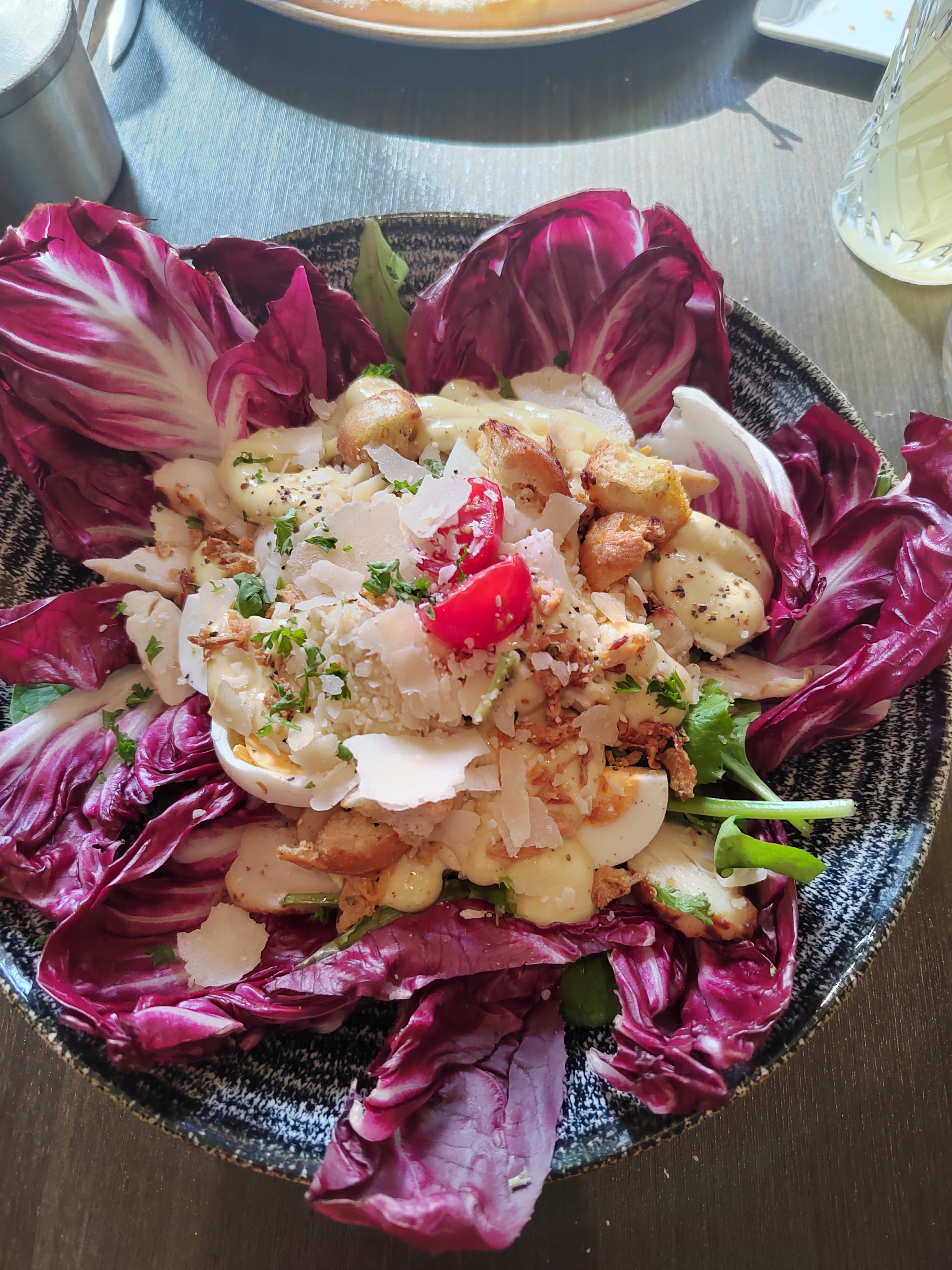 Très bonne entrée à partager, la salade césar n'en est pas une, sauce mayonnaise à la moutarde hyper épaisse, mangé juste quelques bouchées, la pizza beaucoup trop d'huile d'olive, la pâte est noyée dedans. Attente très très longue entre l'entrée et le plat