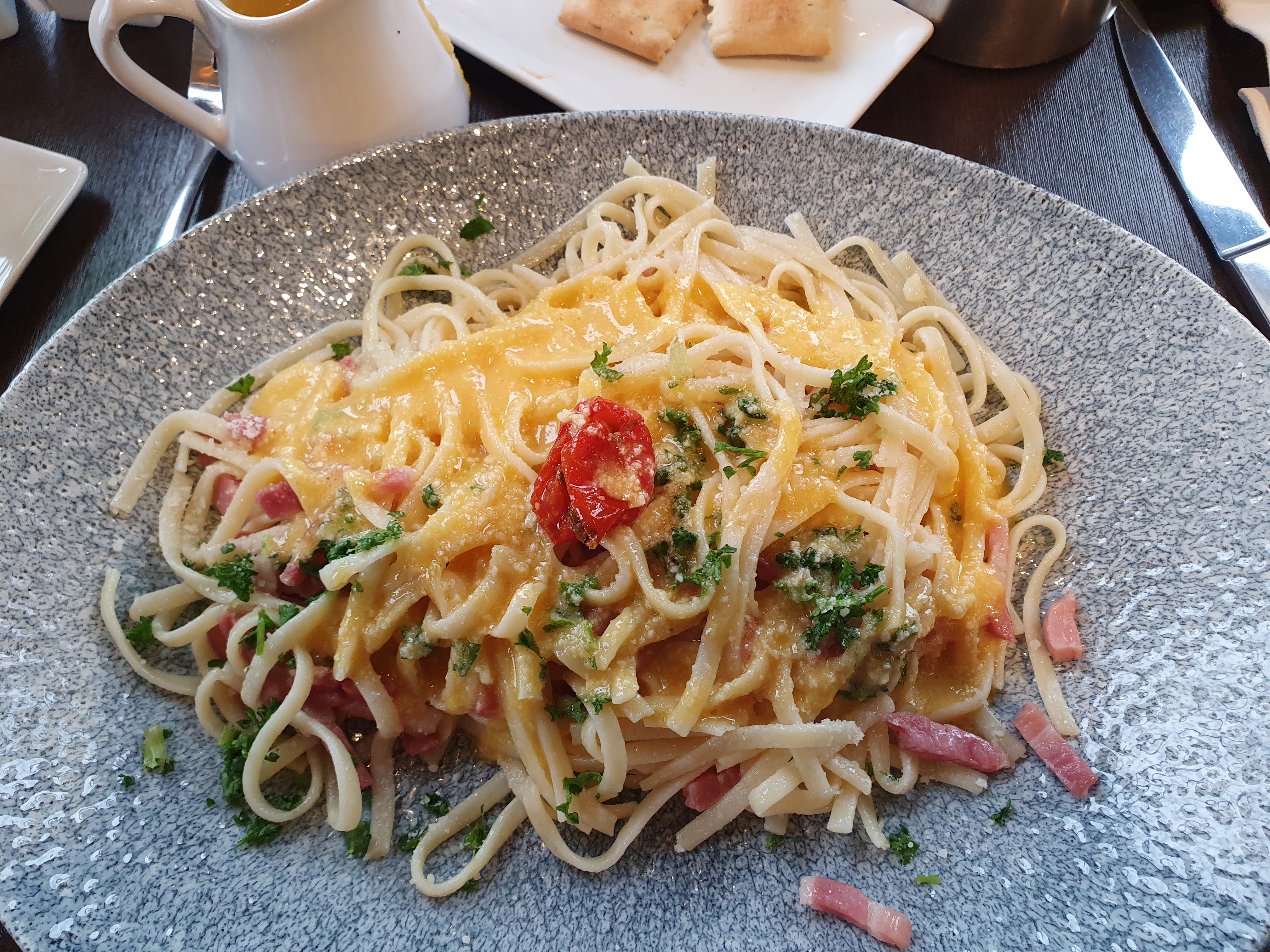 Un repas avec mon amie dans ce très beau restaurant. Je mangeais très souvent des pâtes carbonara dans d'autres resto de cette chaine Malheureusement ils ont changé leur recette maintenant sans crème fraîche. Je trouve cela dommage car je n'ai pas du tout apprécié cette nouvelle recette. Je n'en reprendrai plus du tout et pour la première fois je n'ai pas fini mon assiette juste manger pour combler une faim. Il faut impérativement revoir Votre recette ou faire deux formules avec ou sans crème fraîche. Au sinon un très beau cadre. Un serveur très efficace et très aimable.