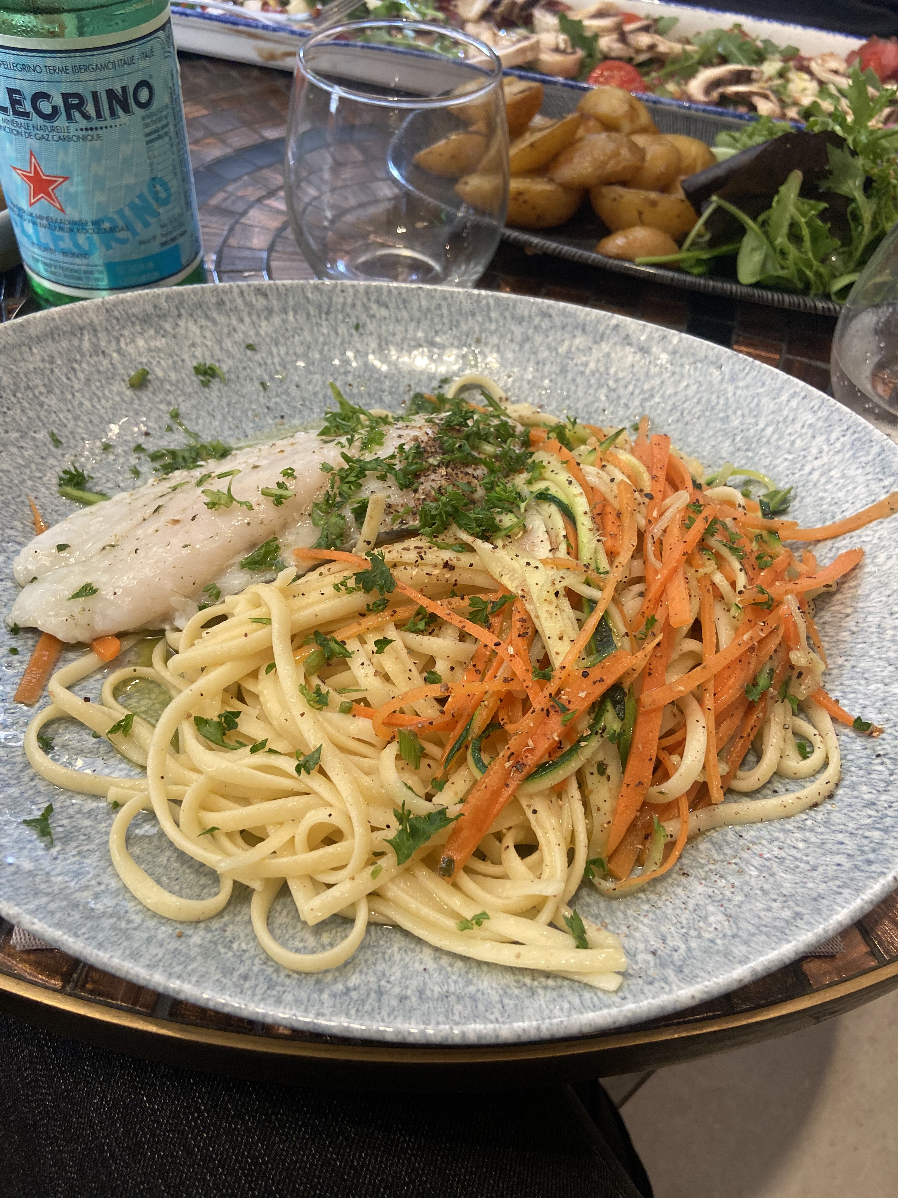 J’ai toujours appréciée ce restaurant sauf cette fois un peu déçu par le plat : « Saint-Pierre au basilic avec pâtes Julienne de légumes . Aucun goût très fade , des pâtes à l’eau avec un poisson blanc a peine cuit J’ai dû rajouter du parmesan et du sel pour avoir un peu plus de saveur mais, pas de quoi casser des briques . Heureusement que j’ai eu le plaisir de savourer le café gourmand . Sinon le serveur très sympa et courtois.