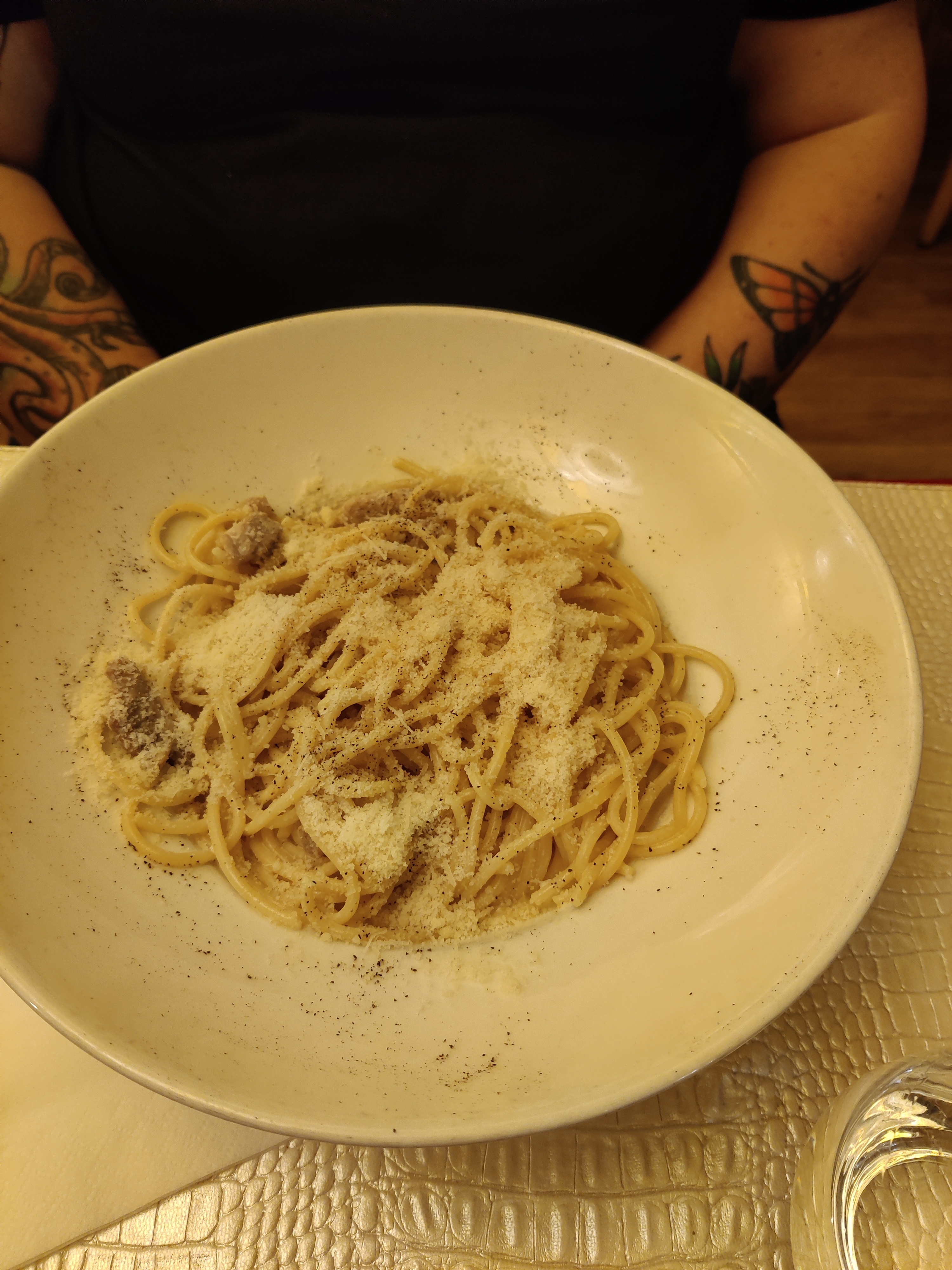 Pâtes à la carbonara qui baignaient dans la crème avec un œuf entier, cassé dessus, une catastrophe pour un restaurant italien! Du jamais vu !…