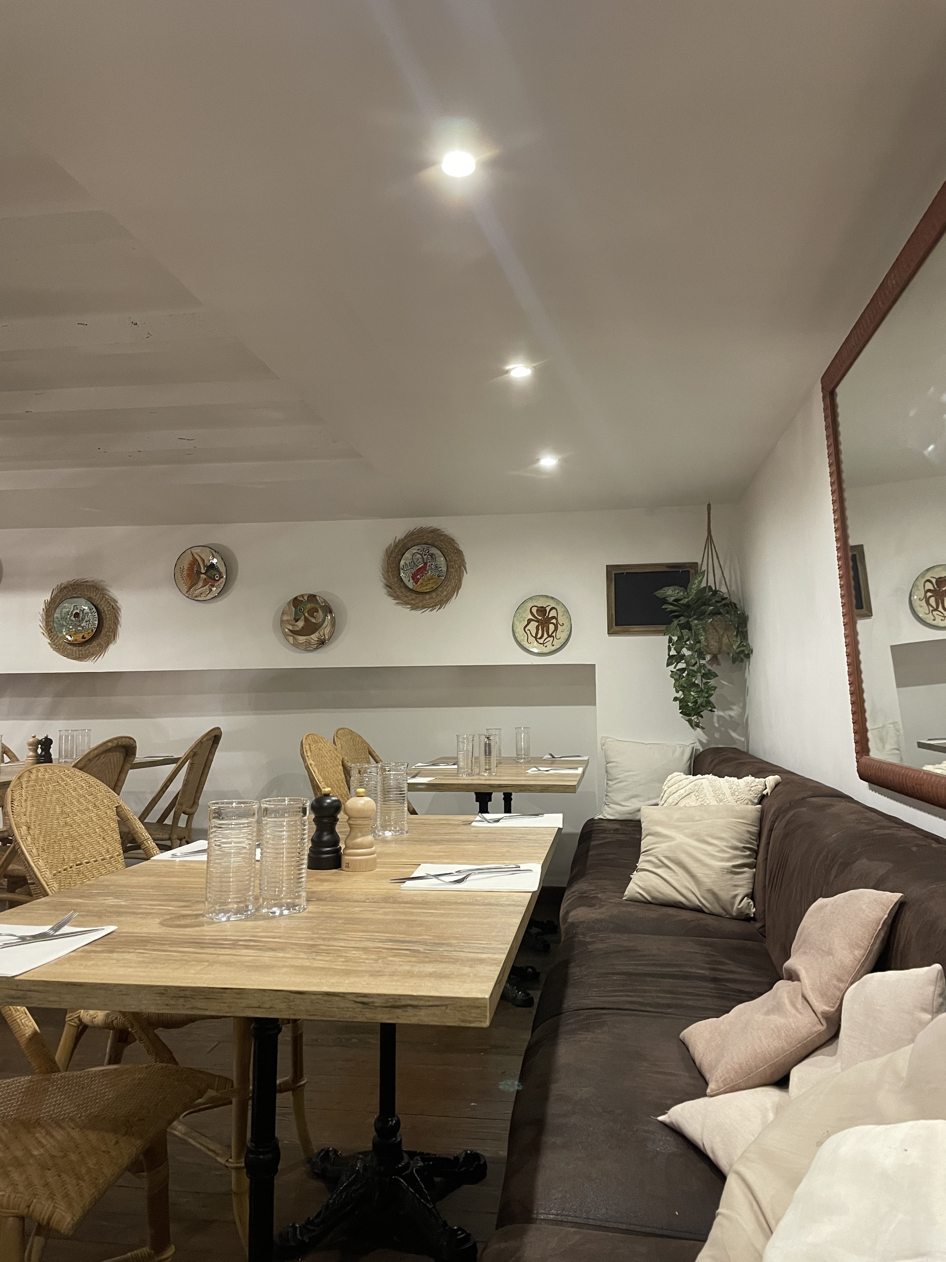 Un restaurant un peu à l'écart, sans prétention extérieure et à l'intérieur, l'accueil et le service y sont top et souriants, les plats sont excellents, on a pris les plats proposés sur l'ardoise : tartare de loup, pâtes aux cèpes). Un régal et un très bon moment.