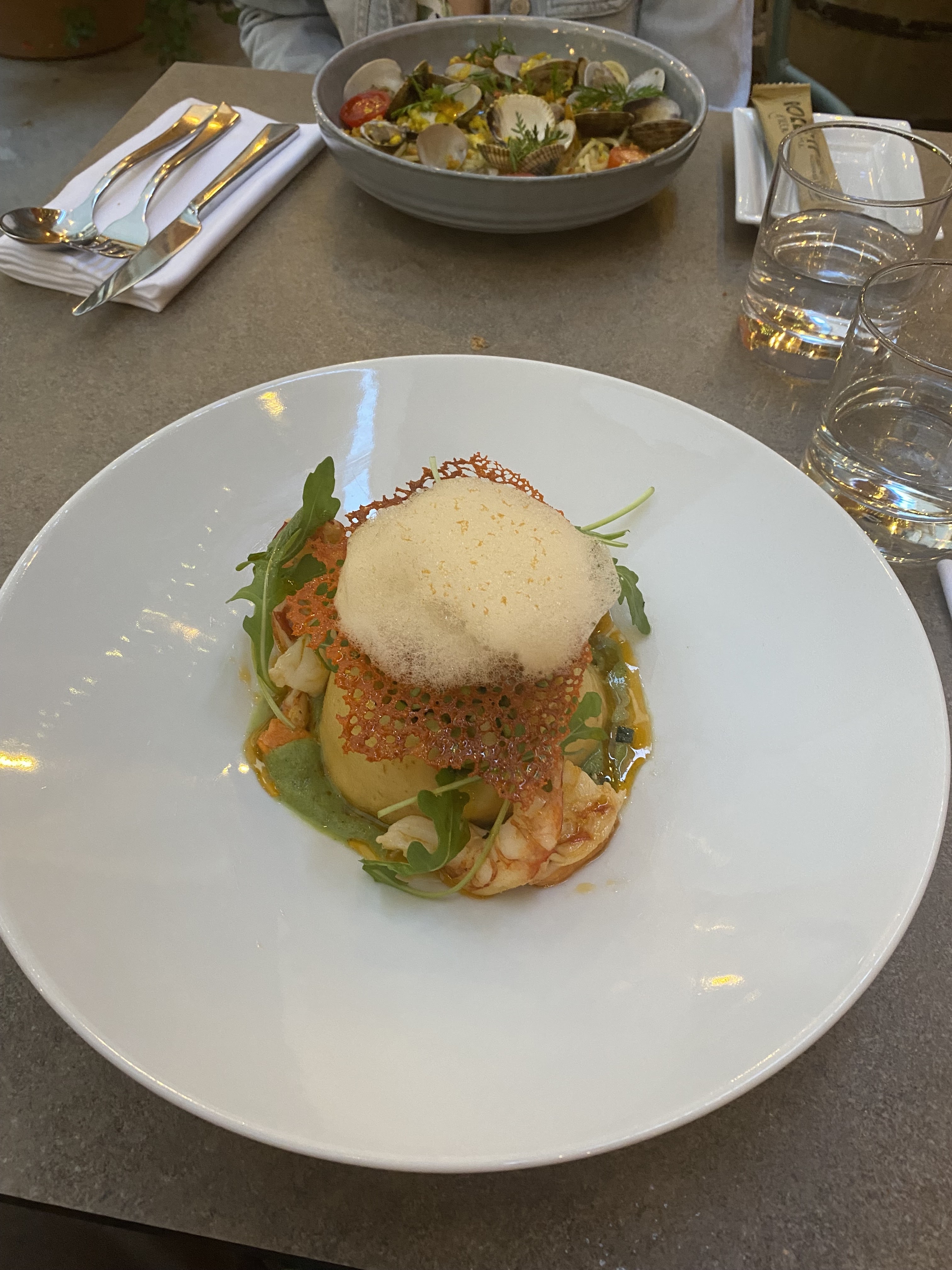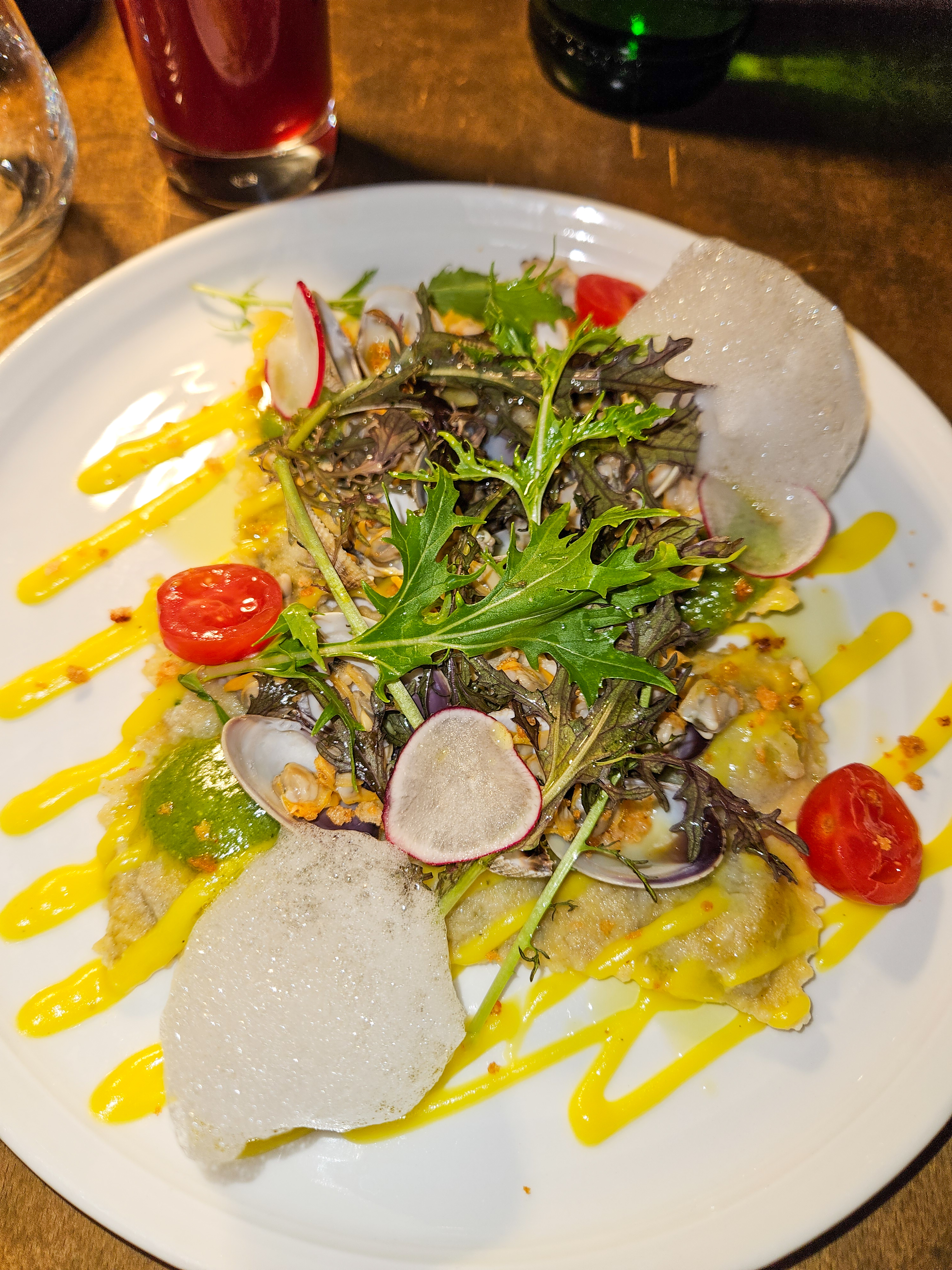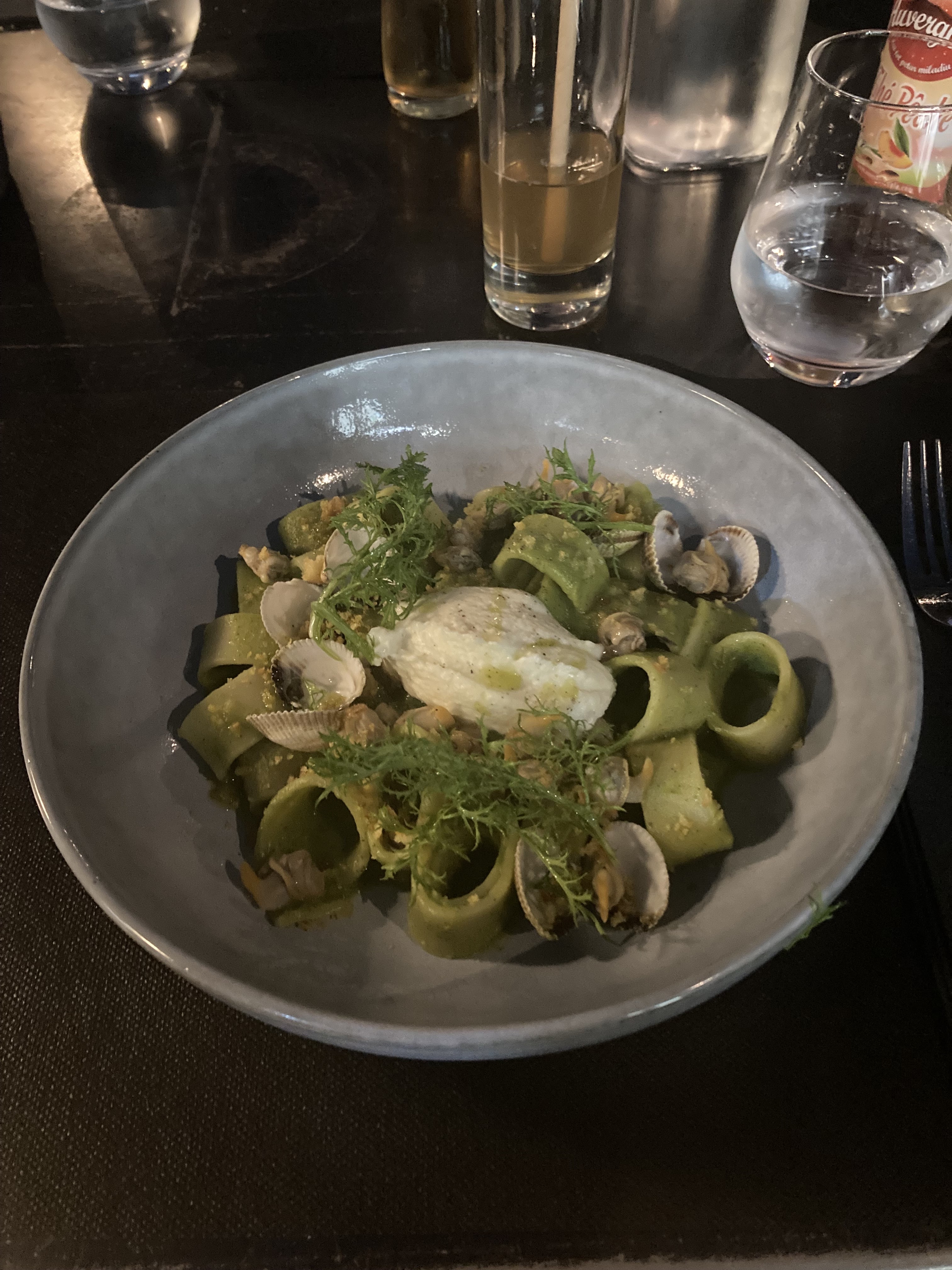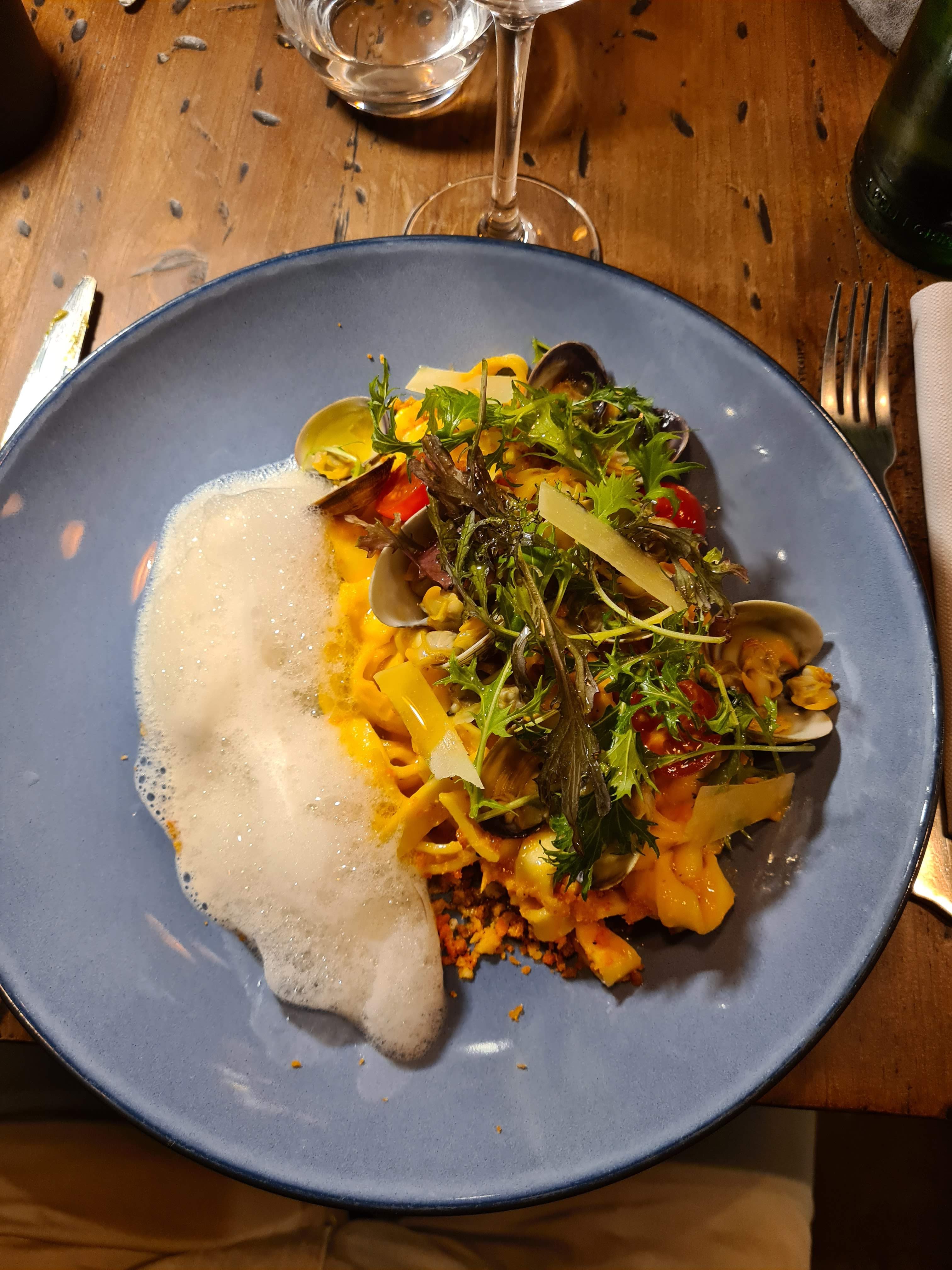 Je met 2 étoiles uniquement pour la qualité du repas et les plats qui étaient vraiment excellents. Cependant en mangeant dans cet établissement on s'attend à certaines prestations, malheureusement ici on vous sert à la chaîne à peine arrivé à peine nos verres servis, puis l'entrée en même temps, j'étais encore entrain de marcher ma dernière bouchée que le serveur avait déjà retiré mon assiette pour le servir le plat 5min après. On avait juste l'impression de déranger et qu'il voulait faire un roulement. La quantité aussi reste très minime, je suis habité à ce genre de restaurant semi gastronomique, mais ici la générosité n'est pas le mettre mot de cet établissement mon amie avait pris des raviolis il y en avait 5 dans l'assiette, sans parler de mon assiette où il avait plus de coquillages que de pâtes dans la mienne. Je ne recommanderais pas cet établissement, passer votre chemin si vous souhaitez de la convivialité et de la générosité.