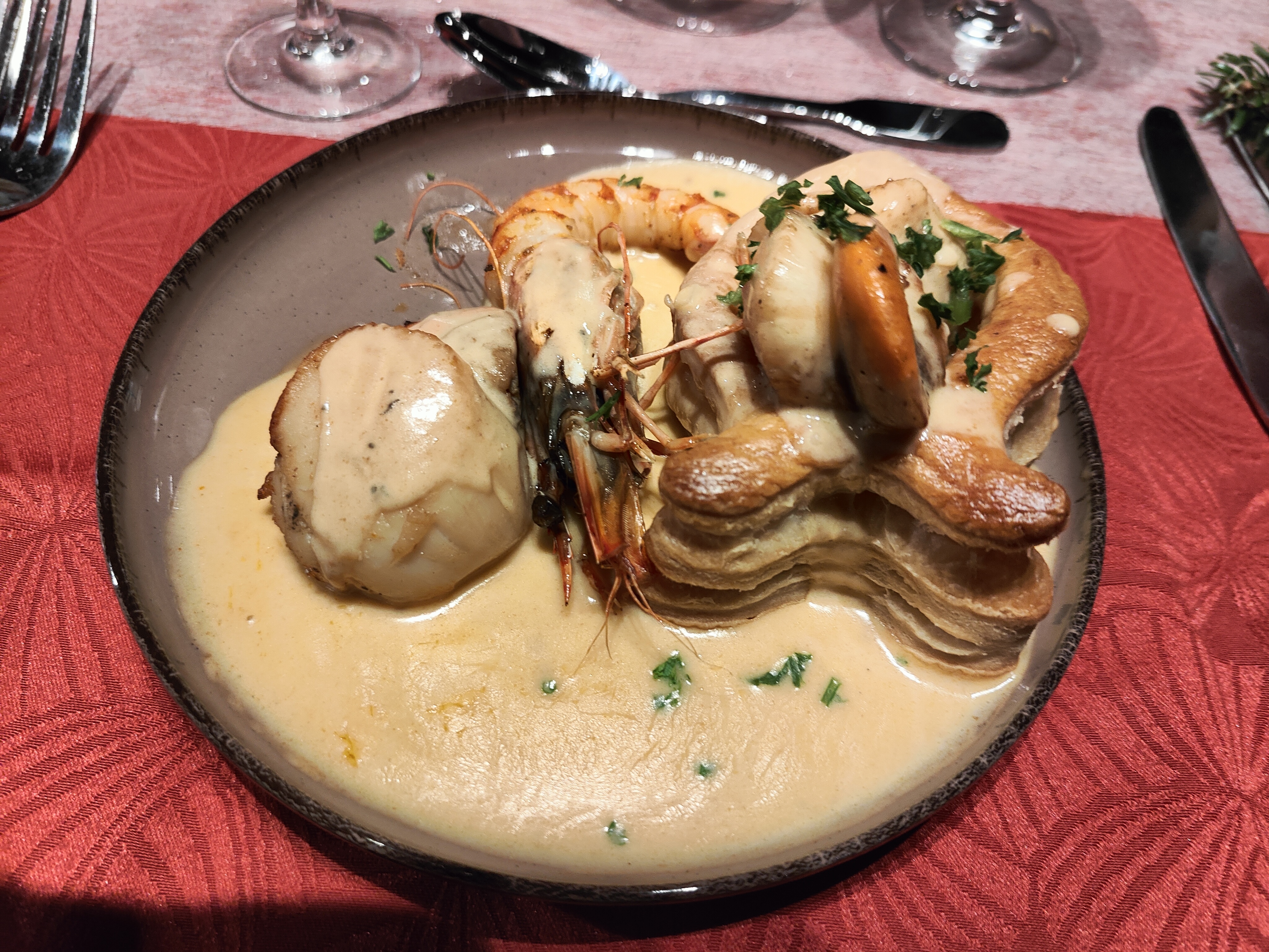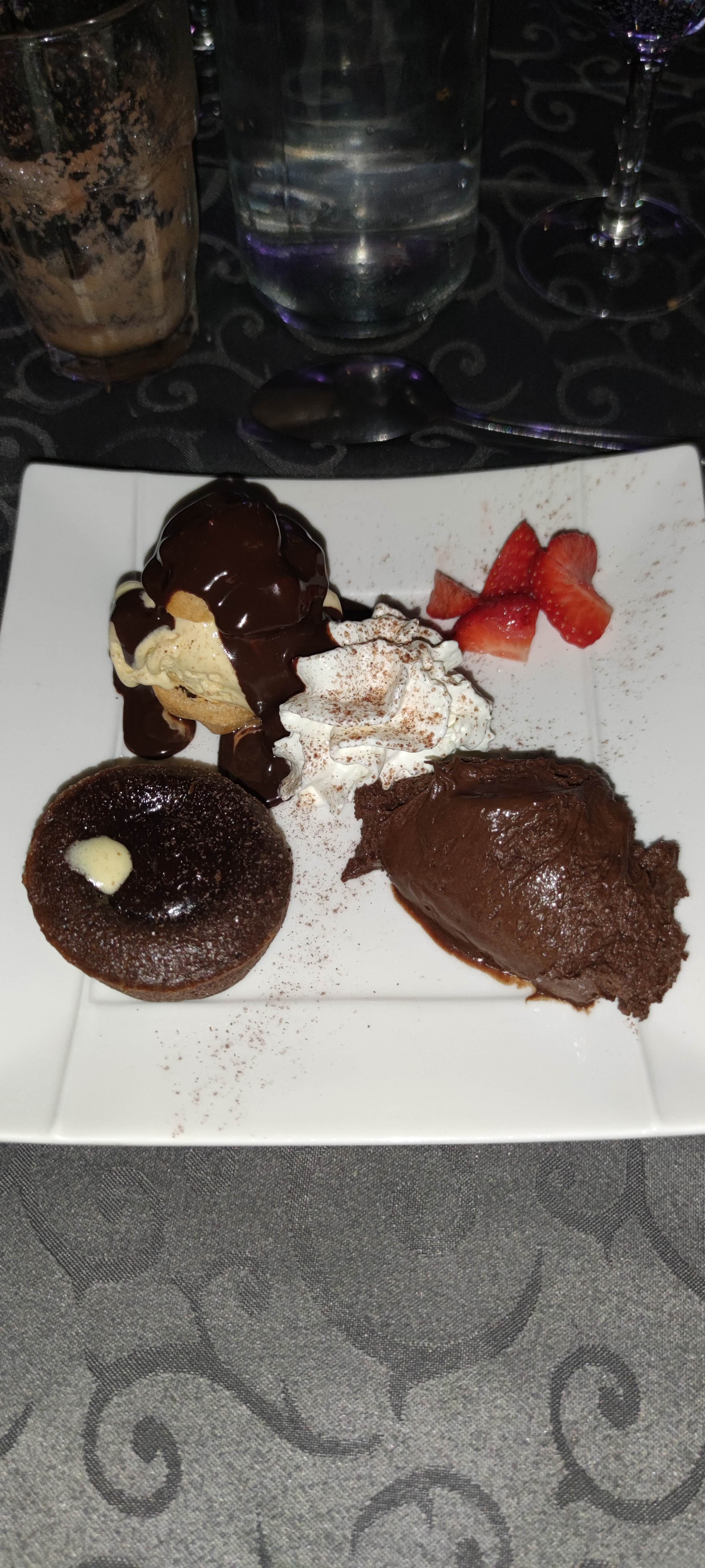 Menu original. Entrée et plat : bonnes découvertes (croustillant de Saint Marcellin aux pommes, et fricassée de poulet aux poires et champignons). Petite déception sur le dessert (gourmandise tout chocolat : mousse sèche et compacte, profiteroles très sèches et la glace vanille sent surtout l'eau). Musique un peu forte pendant le repas, pas facile de discuter, mais possibilité de s'ambiancer sur la piste après le repas.