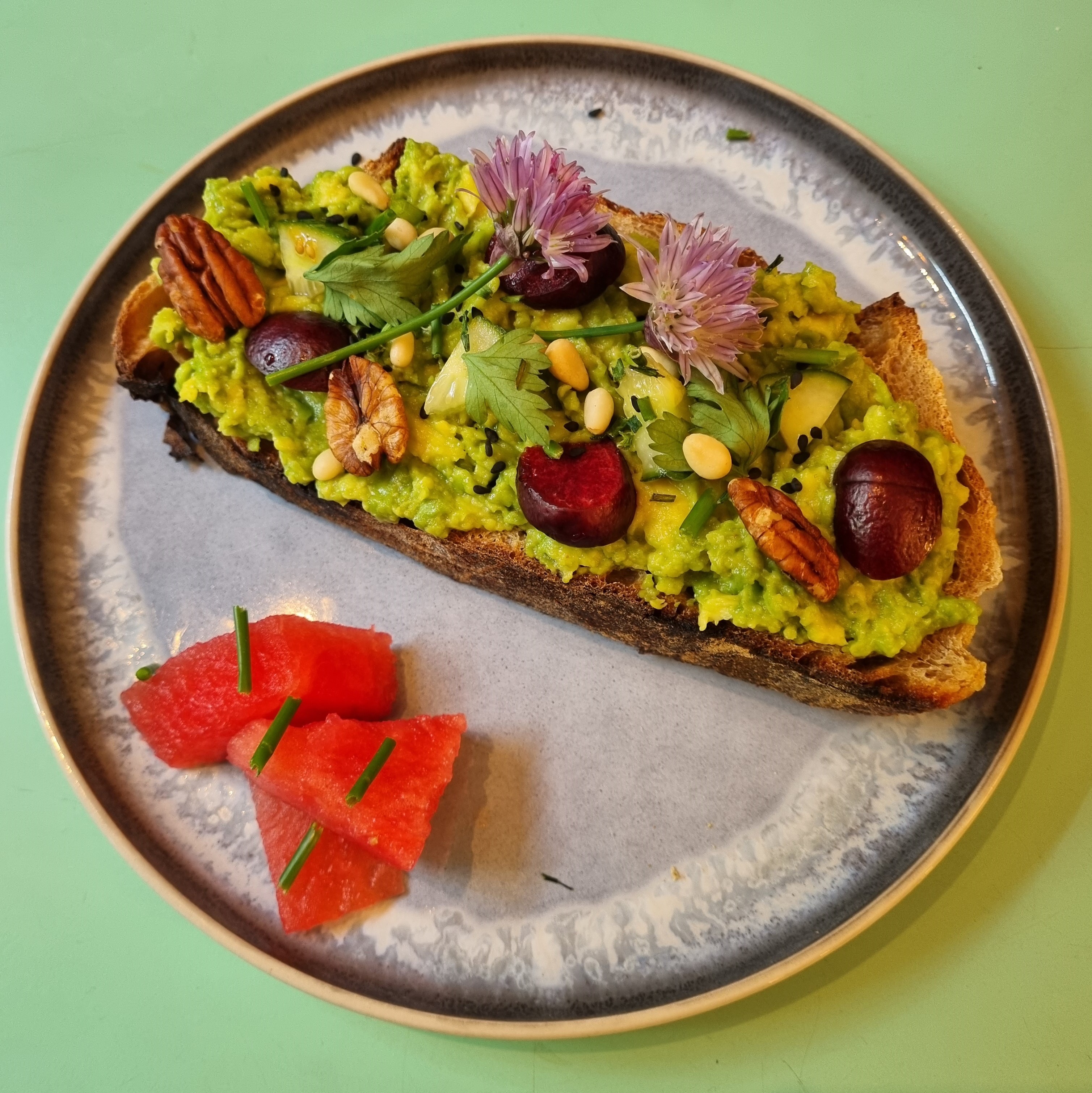 Prix exorbitants, nous avons tous les deux pris le toast à l'avocat avec un latte qui s'élevait à 42€ ! Les couverts et les tasses étaient sales - de la nourriture incrustée entre les fourchettes et des morceaux de nourriture collés sur les côtés des tasses. Le toast à l'avocat pour 14 € était composé d'une tranche de levain et d'une fine tartinade d'avocat avec quelques noix et graines. Une véritable arnaque, ne perdez pas votre temps ! Land&Monkeys est un fantastique café végétalien à bon prix où vous devriez plutôt aller !