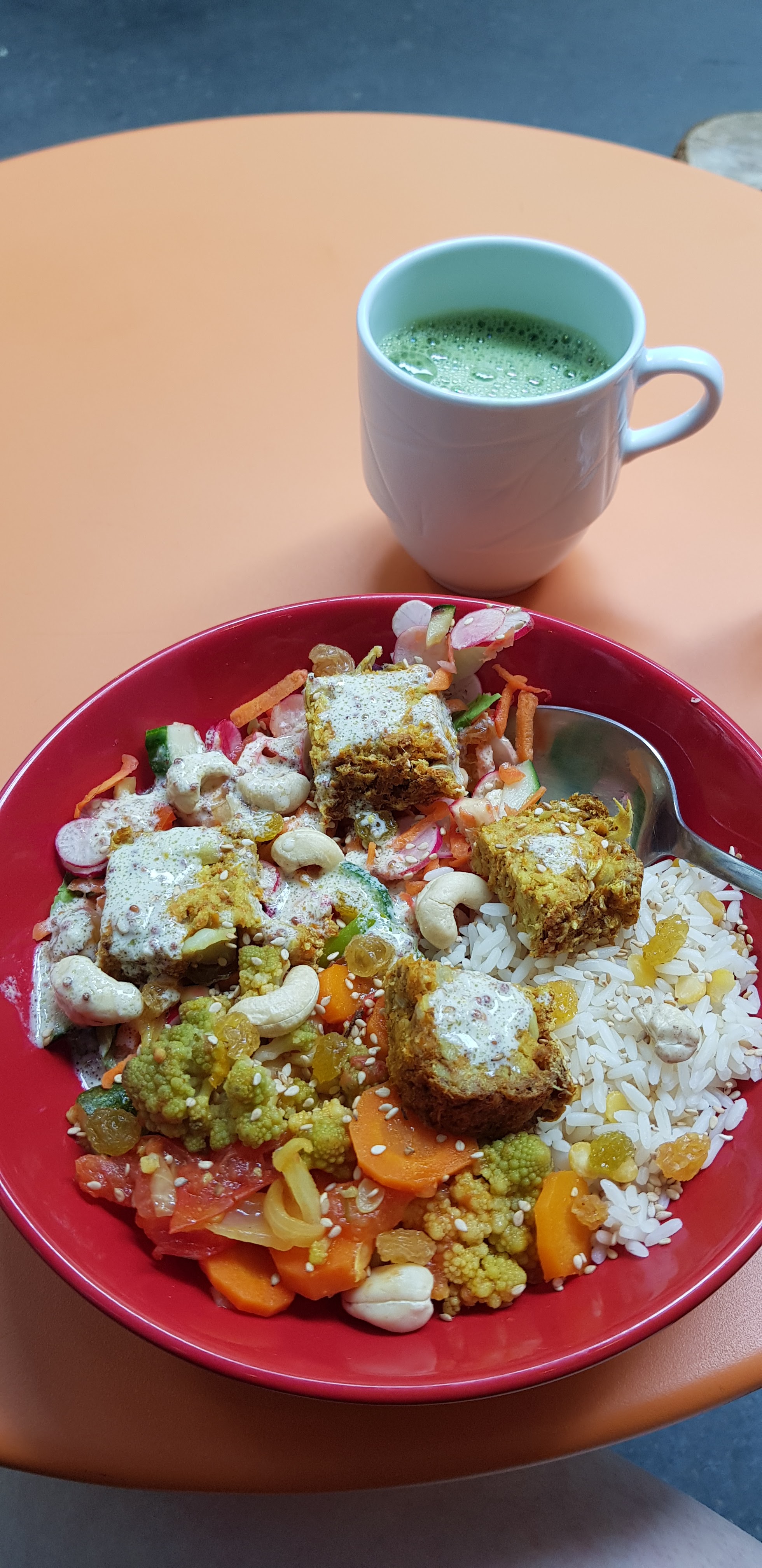 Belle découverte surprenante lors d'une balade à Montmartre. Dans le flot d'une cuisine ennuyeuse à base de viande et de pommes de terre, j'ai trouvé cet endroit génial proposant une cuisine délicieuse, végétalienne et abordable. J'ai mangé un bol de déjeuner avec du riz et des lentilles, une sauce à base de légumes, un gâteau aux carottes salé et une salade en accompagnement. Il y avait de nombreux types de légumes différents dans la sauce et dans la salade. J'ai aussi mangé du matcha latte avec du lait de souchet, préparé à la main au café tous les matins ! Tout le monde était très gentil avec moi, nous avons eu une agréable conversation sur l'importance de la nourriture dans nos vies avec le propriétaire. Je recommande vivement cet endroit :)