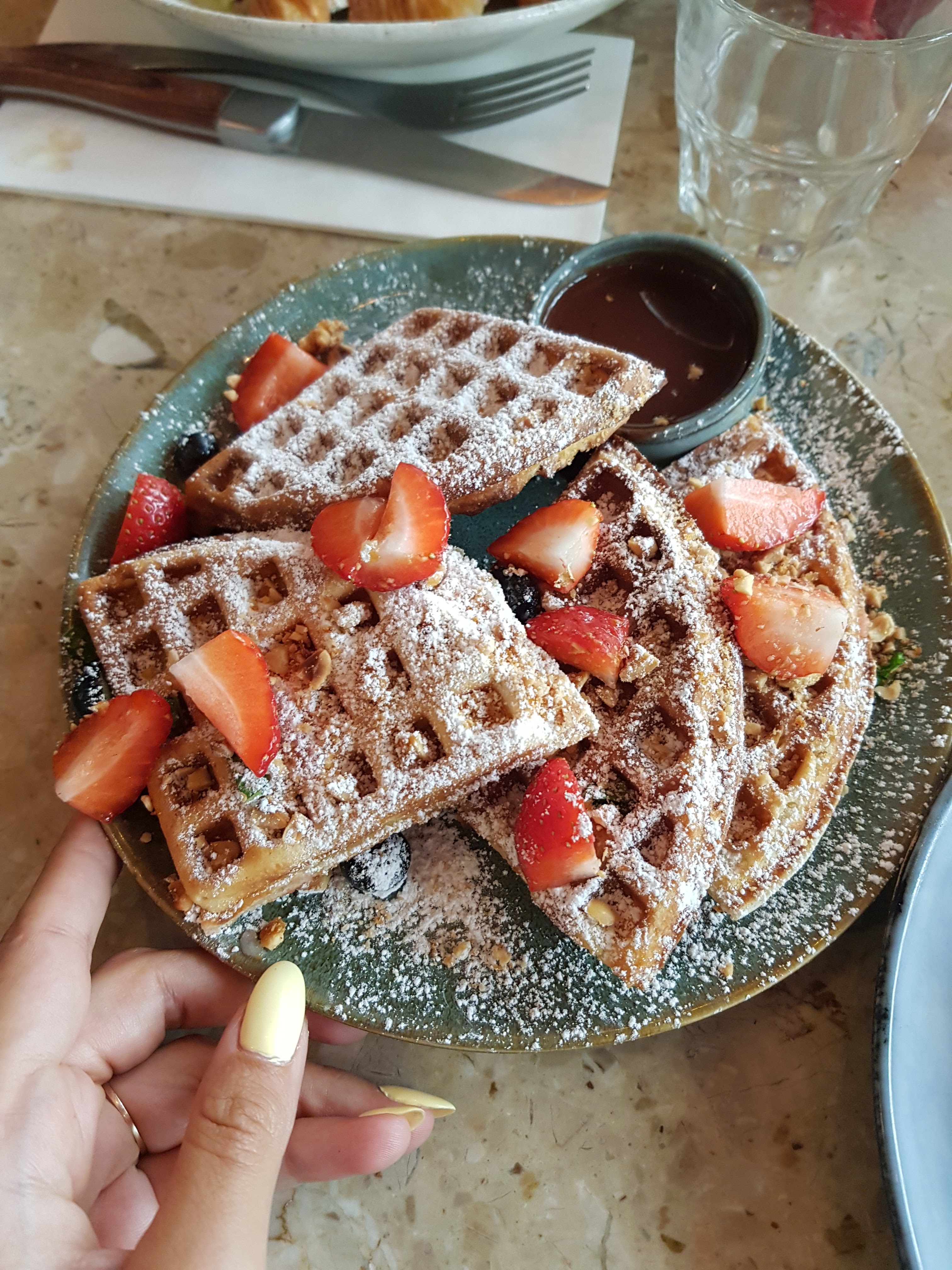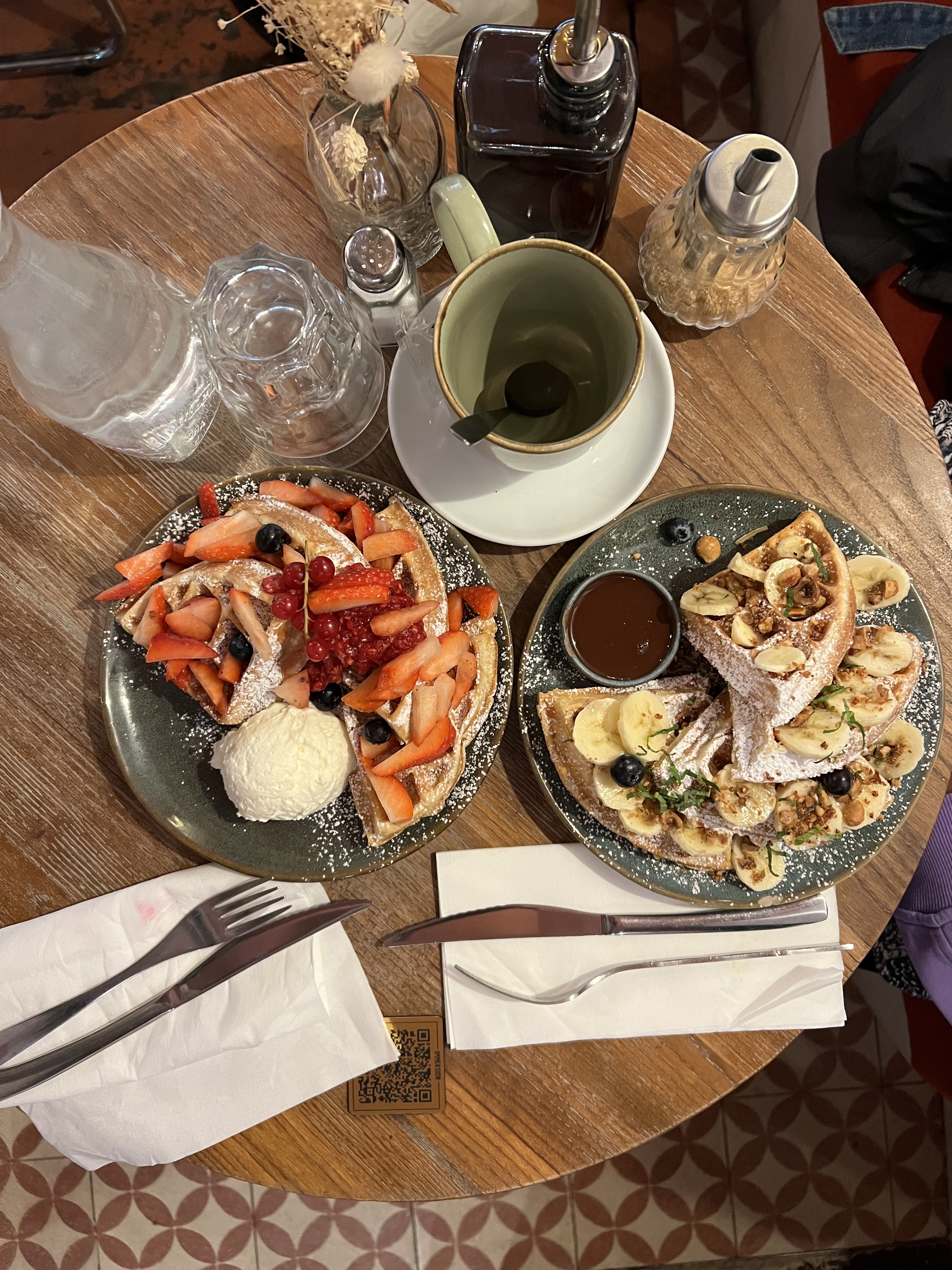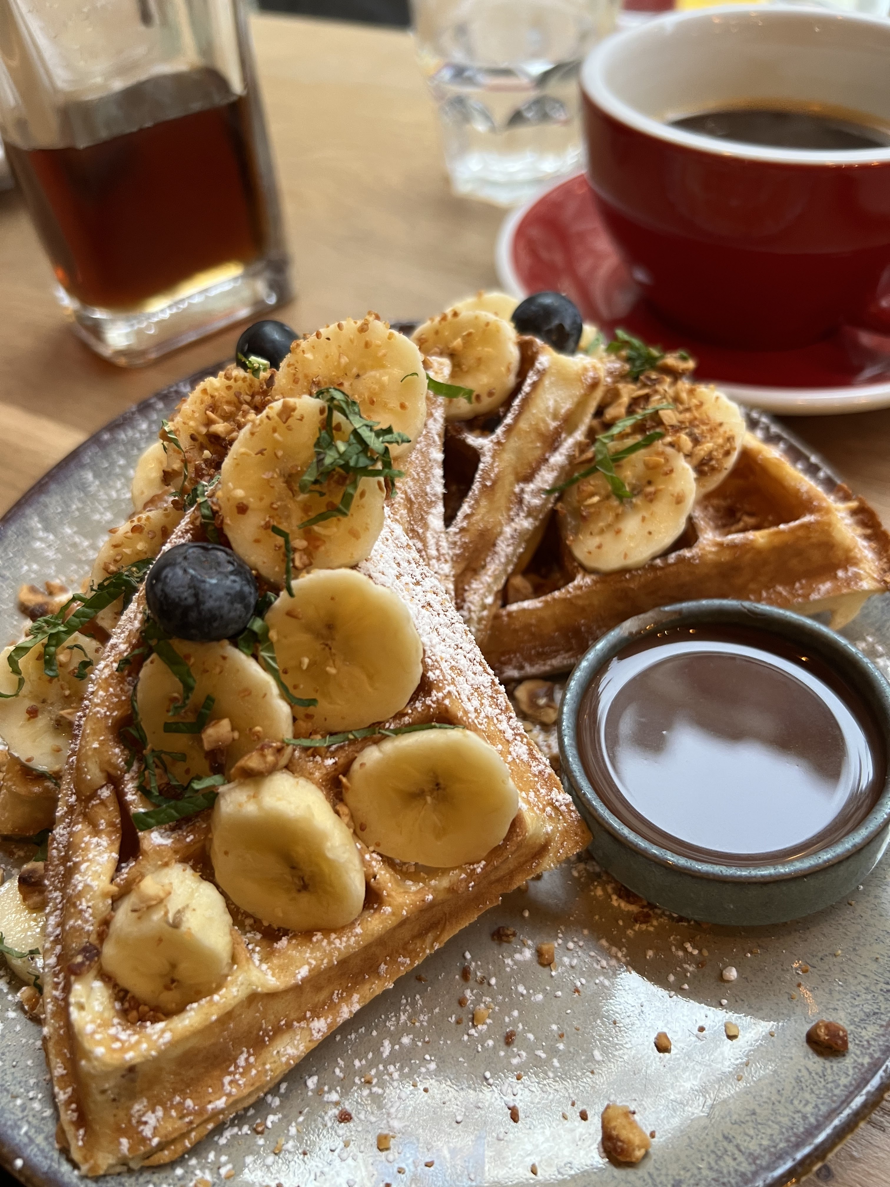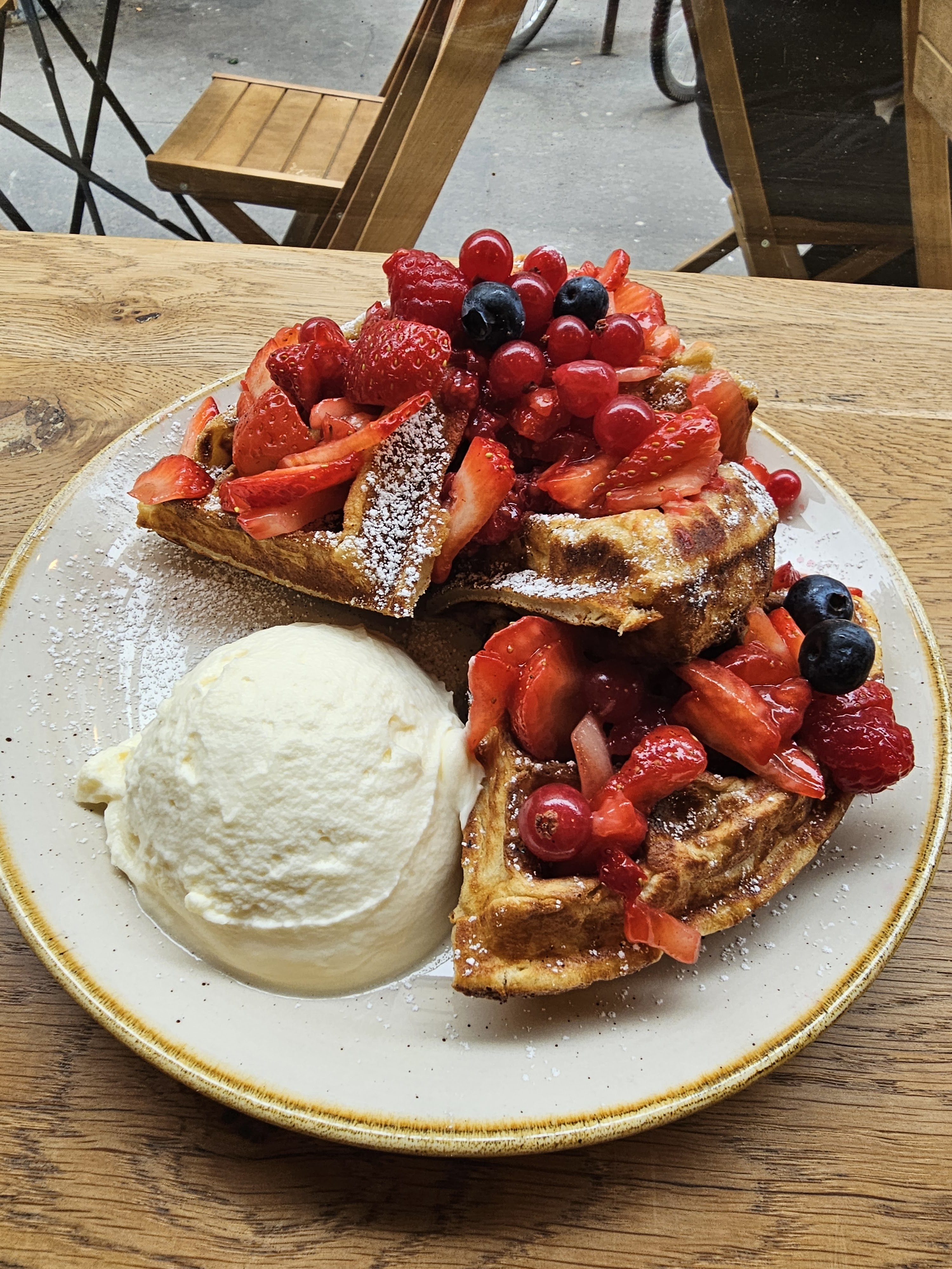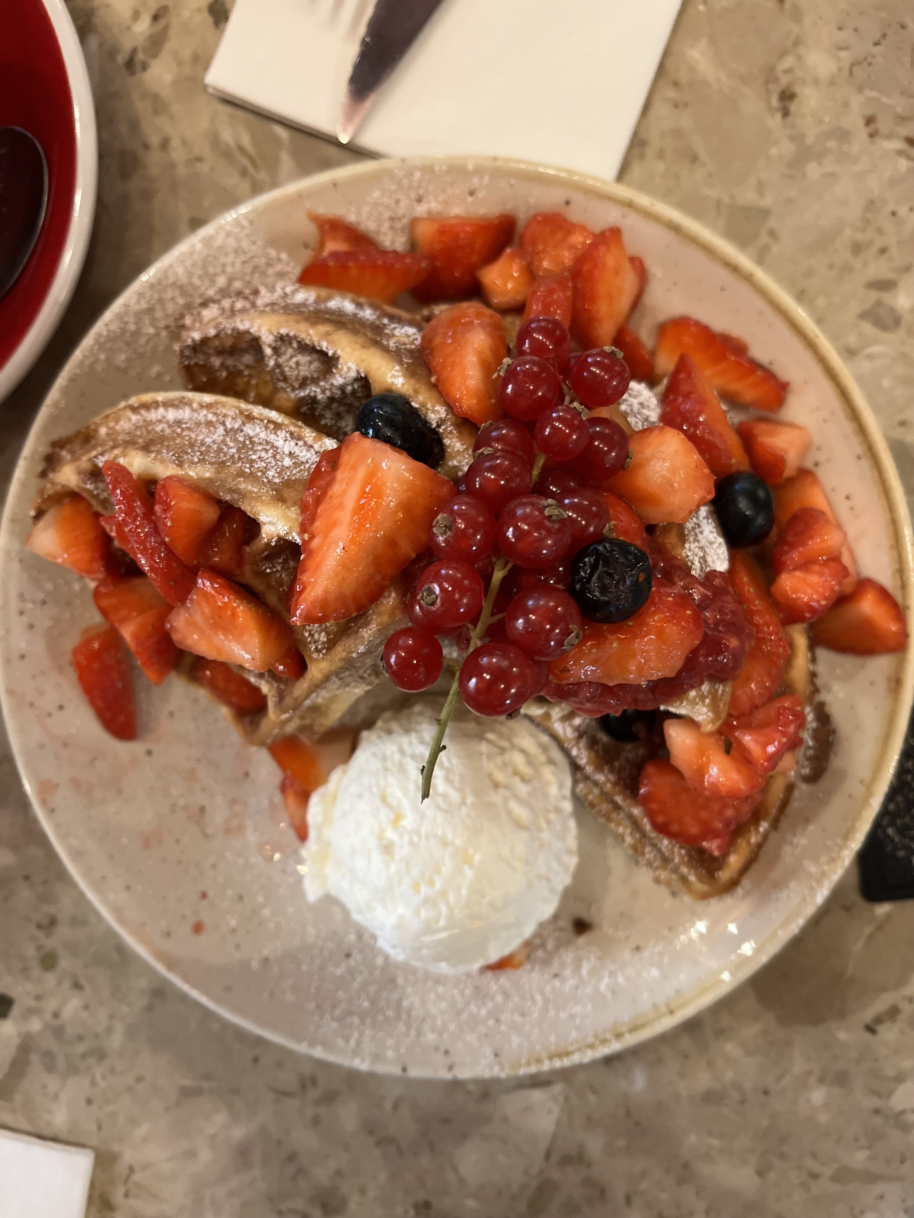 Déco sympa, service agréable et le repas était très bon. Ce qui est difficile, c'est de choisir car tout à l'air bon sur la carte. Mais il fait choisir. J'ai beaucoup aimé les waffles fruits rouges. D'habitude les fruits rouges, c'est ce qui manque un peu dans les restos mais là j'ai eu une portion généreuse 😋. Je reviendrai pour essayer un autre brunch et peut-être reprendre des waffles 😁