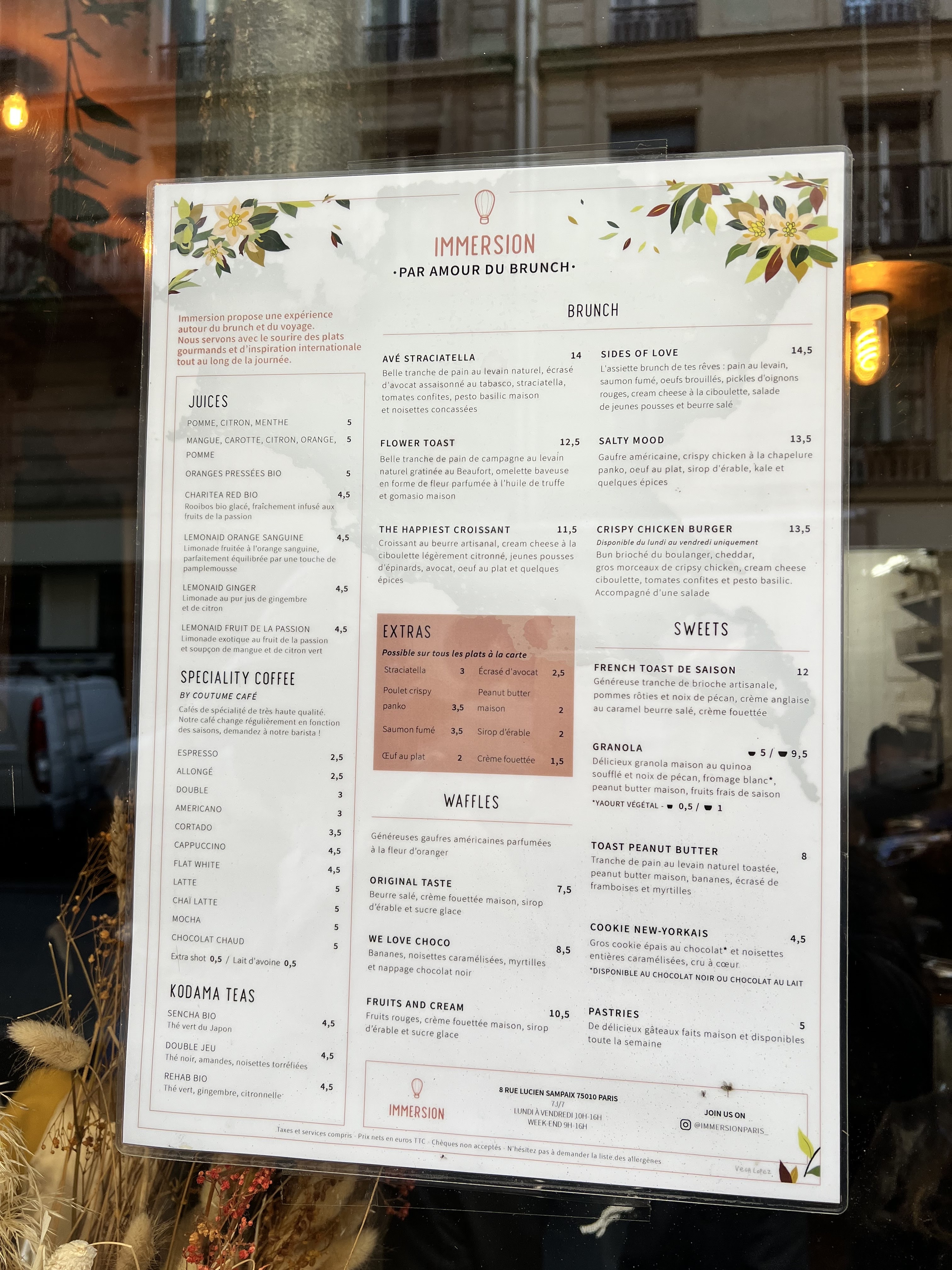De passage sur Paris et après de vives recommandations, nous avons eu la chance de profiter d’un brunch à l’Immersion. C’était vraiment délicieux, le service est extra, absolument rien à redire ! On reviendra