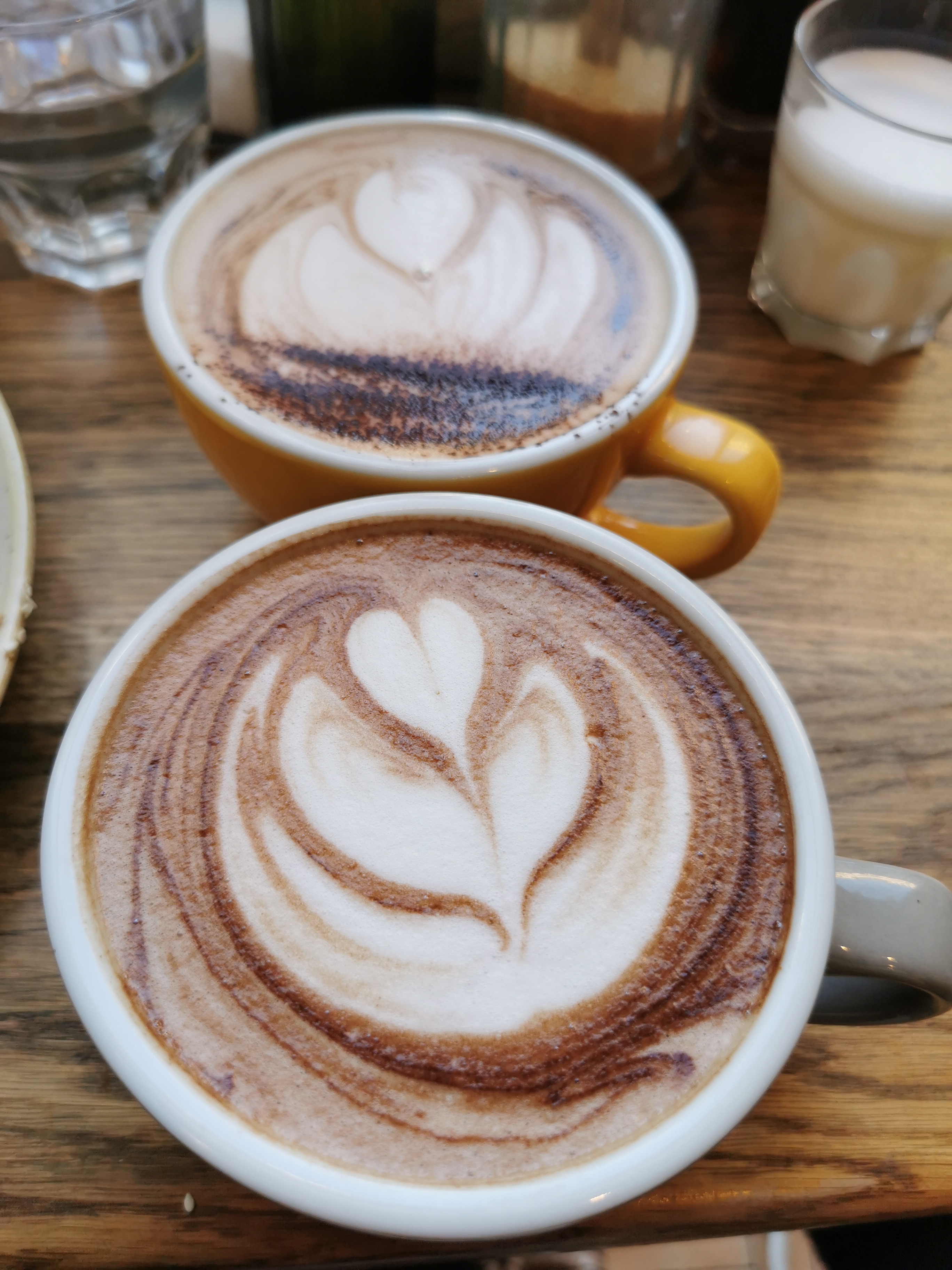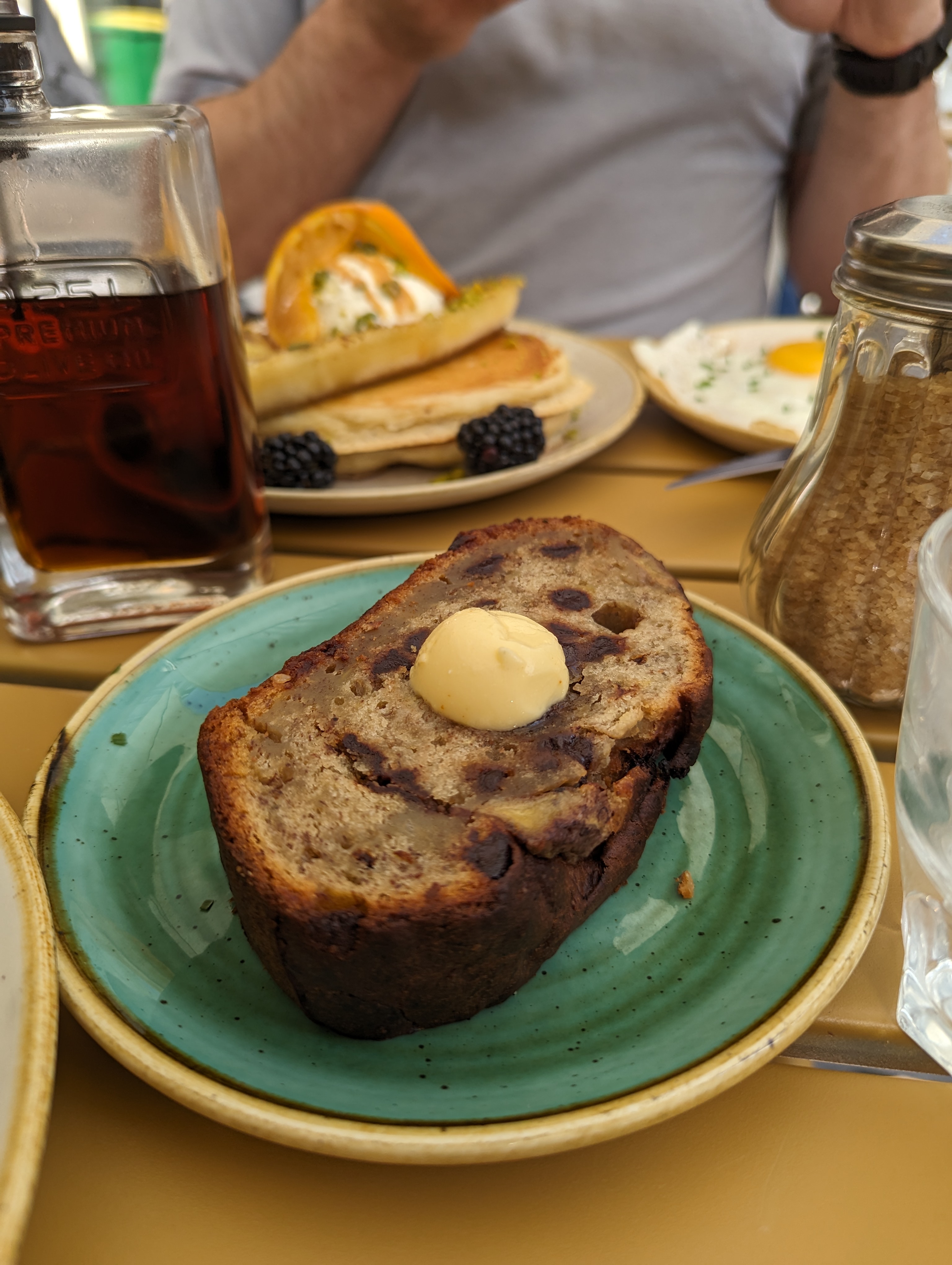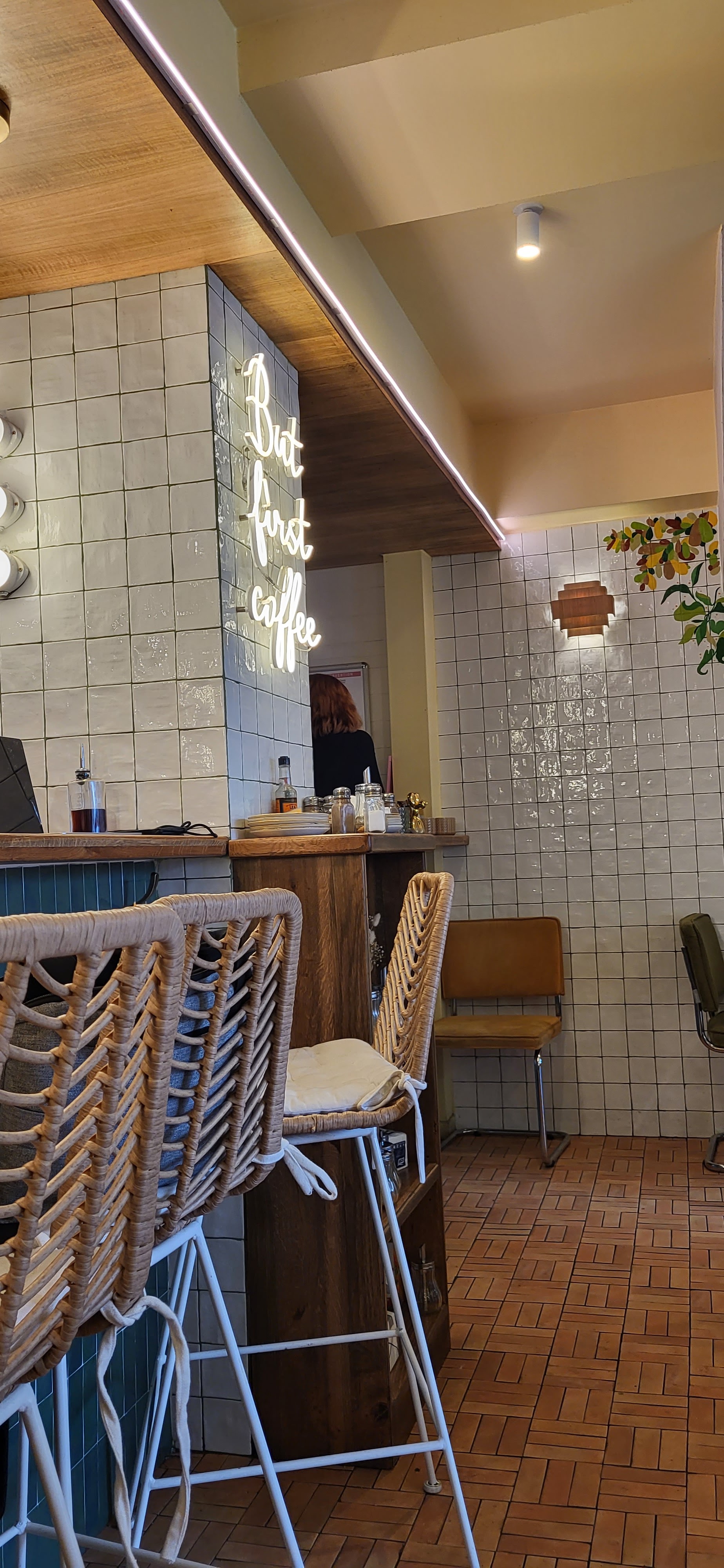 J'ai eu beaucoup de chance de ne pas avoir à faire la queue. Nous avons dîné sur la « terrasse » qui était un peu cosy et exiguë. L'intérieur est très beau. Le service n'était pas le meilleur. Les serveurs semblaient indifférents et fatigués. Le chai latté était délicieux, mais le flat white était dans un verre plutôt que dans une tasse, ce qui n’était pas des plus faciles à manipuler/boire. Nous avons d'abord commandé le pain aux bananes « chaud », mais il est sorti après nos plats principaux. Nous pensions qu'ils l'avaient oublié, ce qui aurait pu être le cas, mais il faisait froid quand il nous est arrivé et trop sec. Le boulanger au saumon était cependant vraiment bon. Le Smell like Paradise (qui devrait être « sent le paradis » en anglais d'ailleurs) était décevant et l'élément le plus cher du menu à 17 €. Le halloumi était le seul bon côté. A part ça, c'était assez sec et nous ne pouvions pas le faire. Je n'ai pas goûté la truffe. Peut-être qu'une sauce ou quelque chose aurait ajouté beaucoup à ce plat. Également sur le menu, il était indiqué que le pain de ce pain grillé était recouvert de flocons de maïs, mais ce n'était qu'un pain de mie. Je ne veux pas les écarter complètement et je leur donnerais probablement une chance, peut-être dans l’un de leurs autres sites. Ils ont cependant une certaine marge d'amélioration.