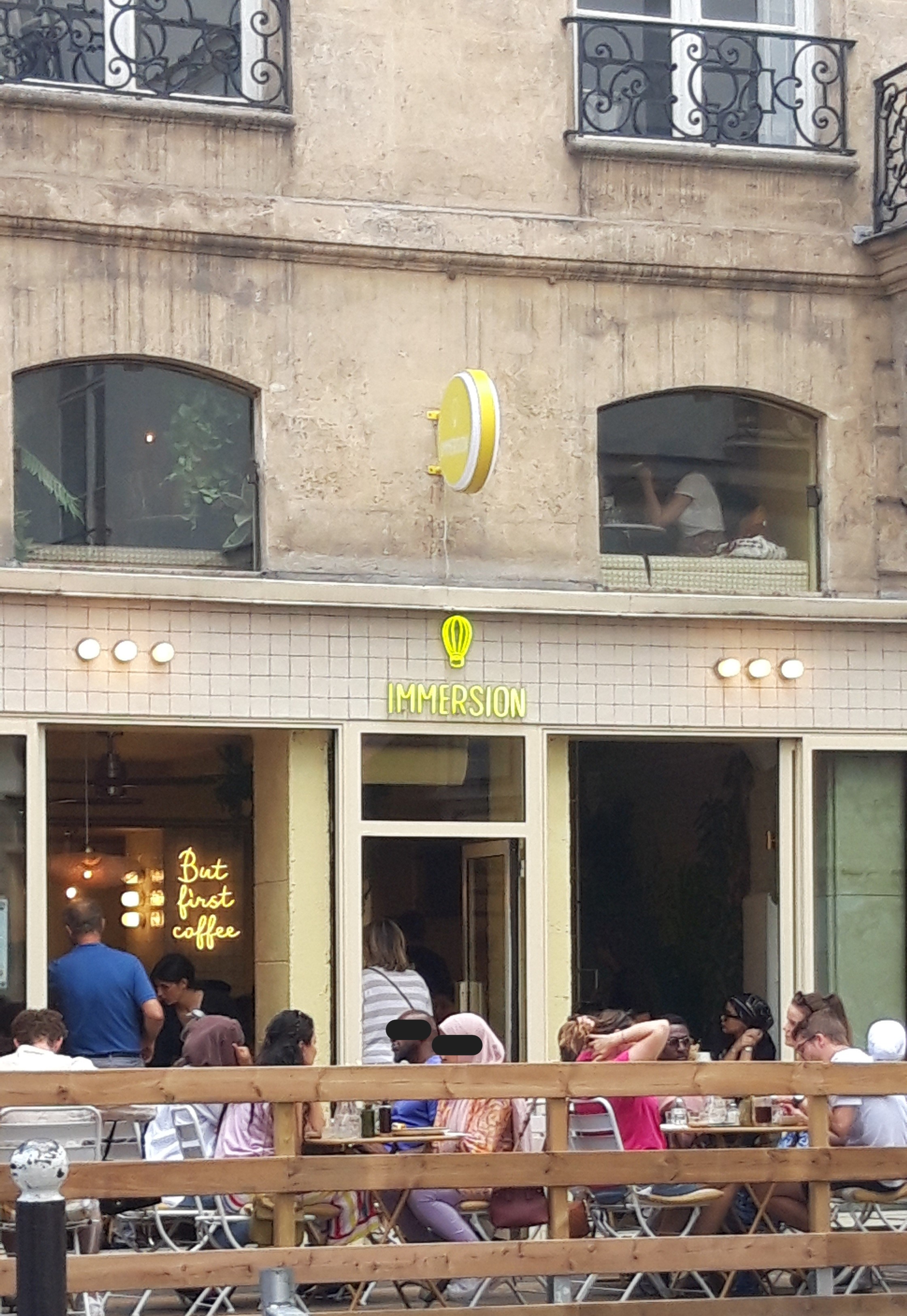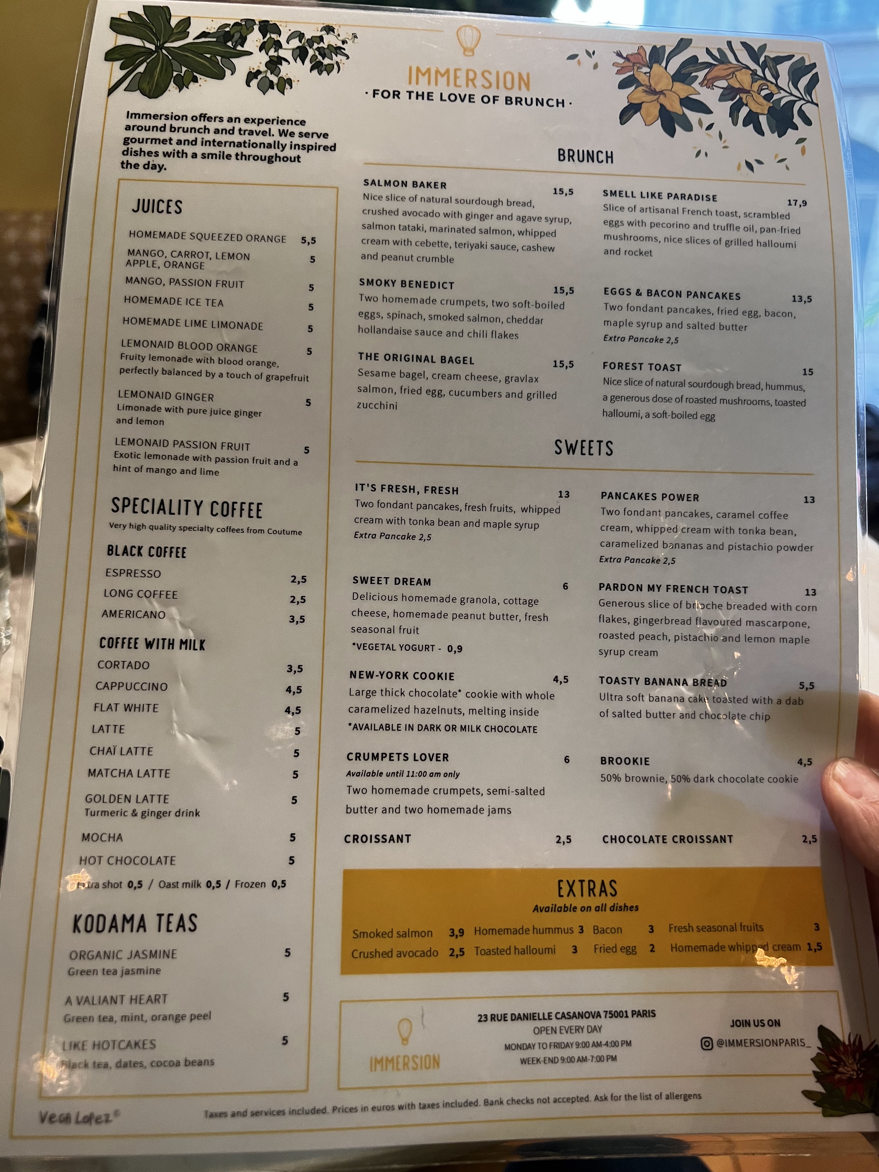 Haut lieu du brunch parisien Immersion Paris comble vos papilles avec ces propositions gourmandes, gargantuesques et fraiches. Une cuisine soignée, un service agréable et courtois. Du fait maison autour de produits de saison. Une fusion de saveurs issues des meilleurs brunchs de la planète. Café d'origine confectionné par un barista avec talent, Thé, panecake, oeufs brouillés à la truffe, brioche perdue aux fruits de saison, écrasé d'avocat au gingembre, jus de fruits et smoothies d'exceptions. un vrai régal ! un seul bémol , c'est tellement bon que victime de son succès vous devrez faire la queue pour accéder à ce moment d'extase. Mais restez zen le surbooking et bien gérer et bien orchestré. comptez entre 10€ et 25€ par personne suivant la gourmandise qui vous anime. Régalez-vous
