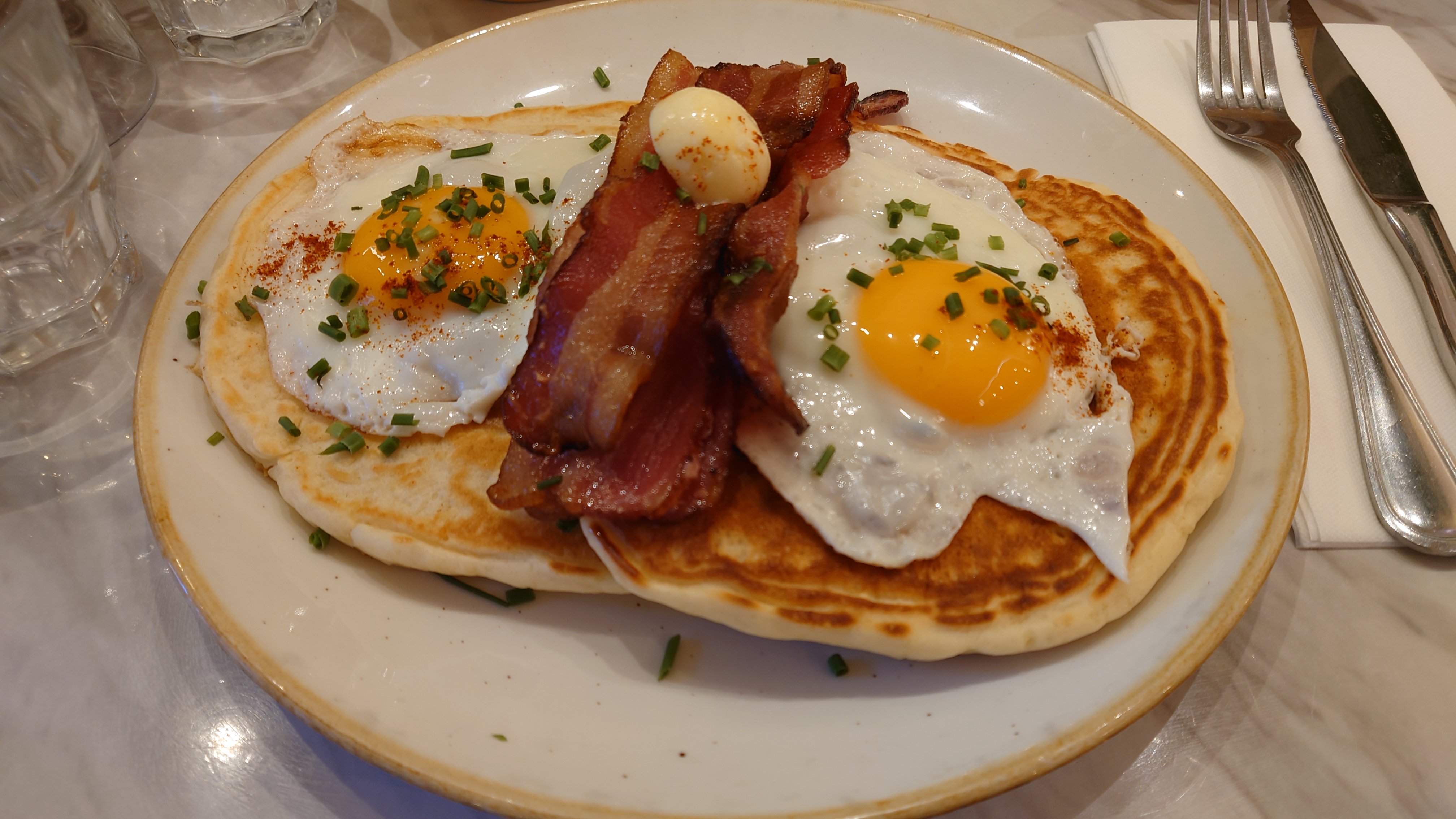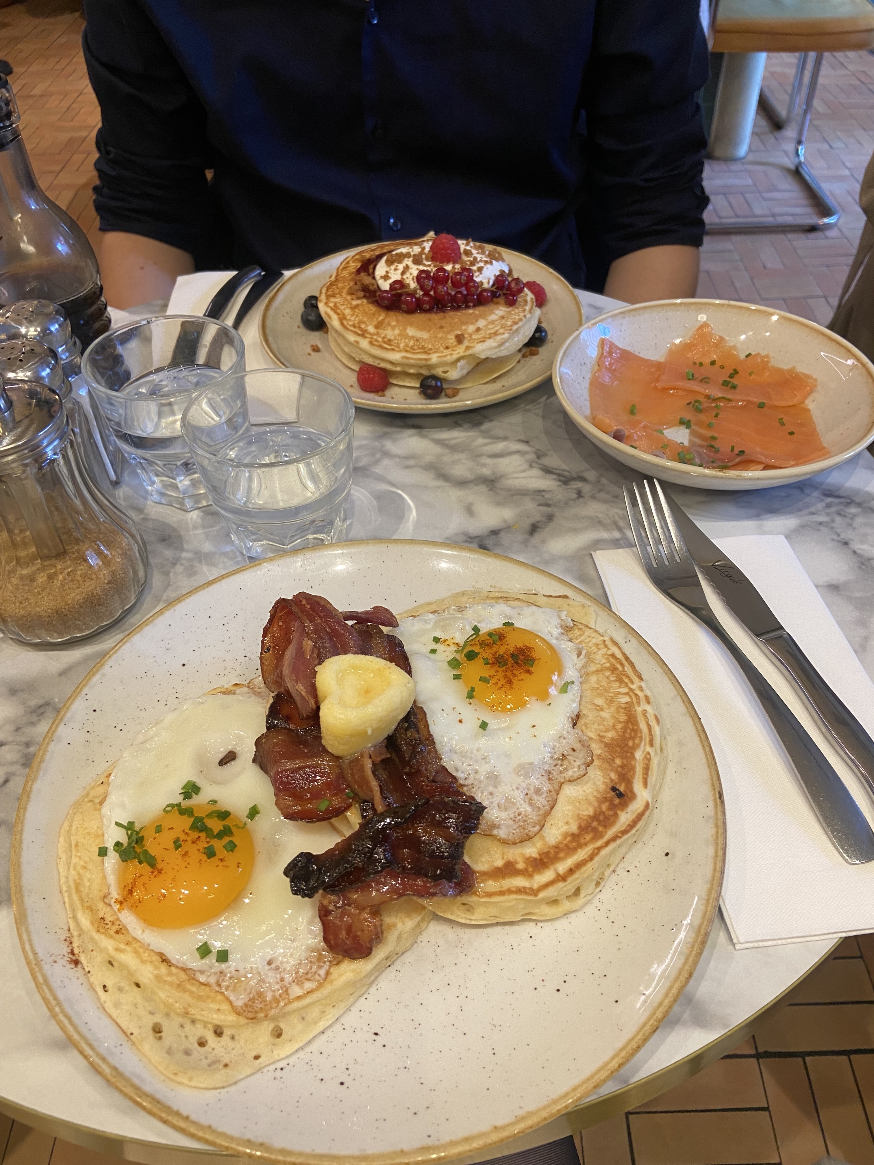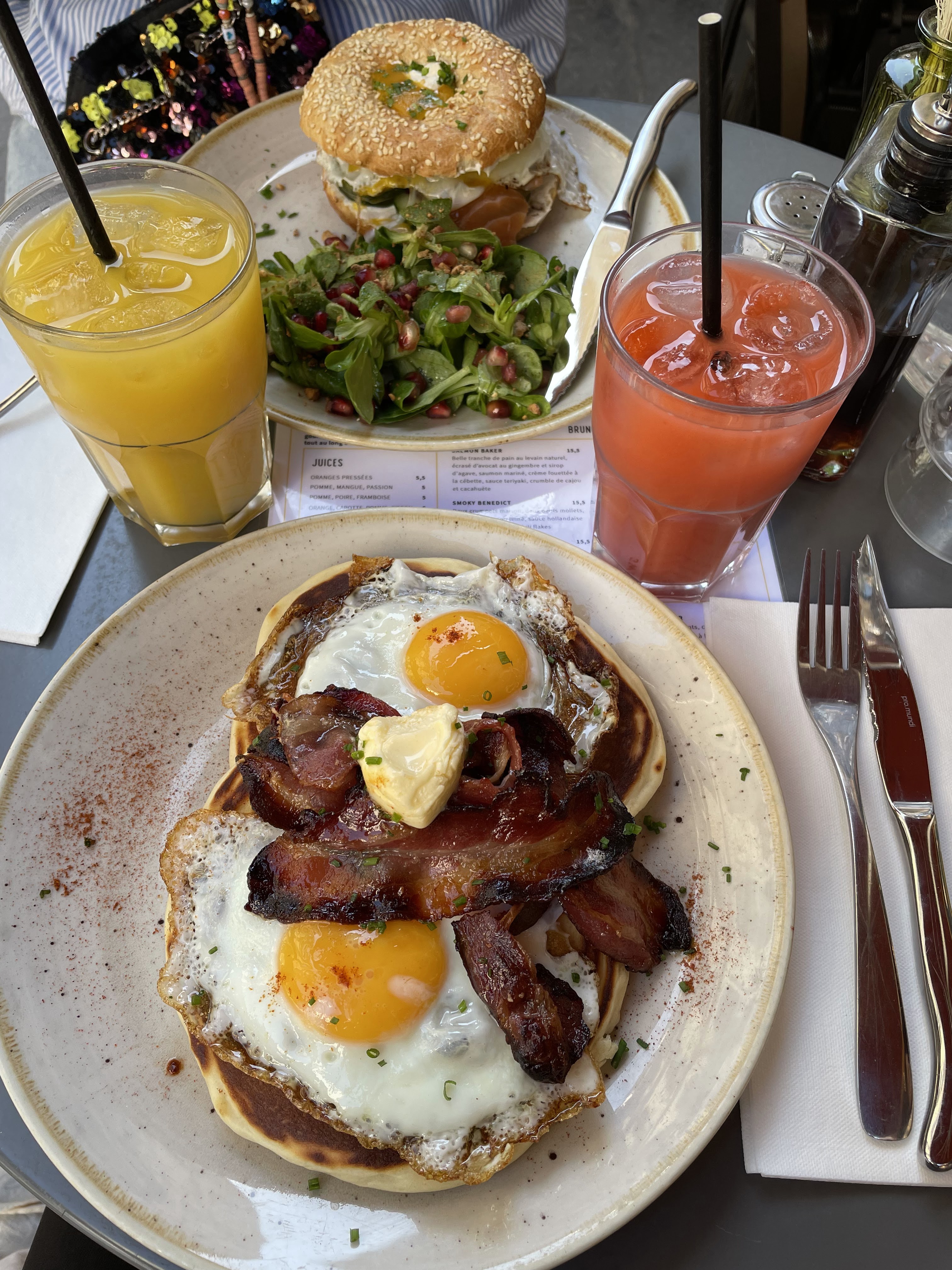 Un peu d’attente avant de pouvoir s’installer, mais le serveur a fait en sorte que ce ne soit pas long. Le restaurant est très joli, un peu bondé mais ça va. Nous avons pris deux pancakes egg & bacon et c’était délicieux pour des prix abordables si on a envie de se faire un bon brunch à Paris. Bref, on s’est régalés !
