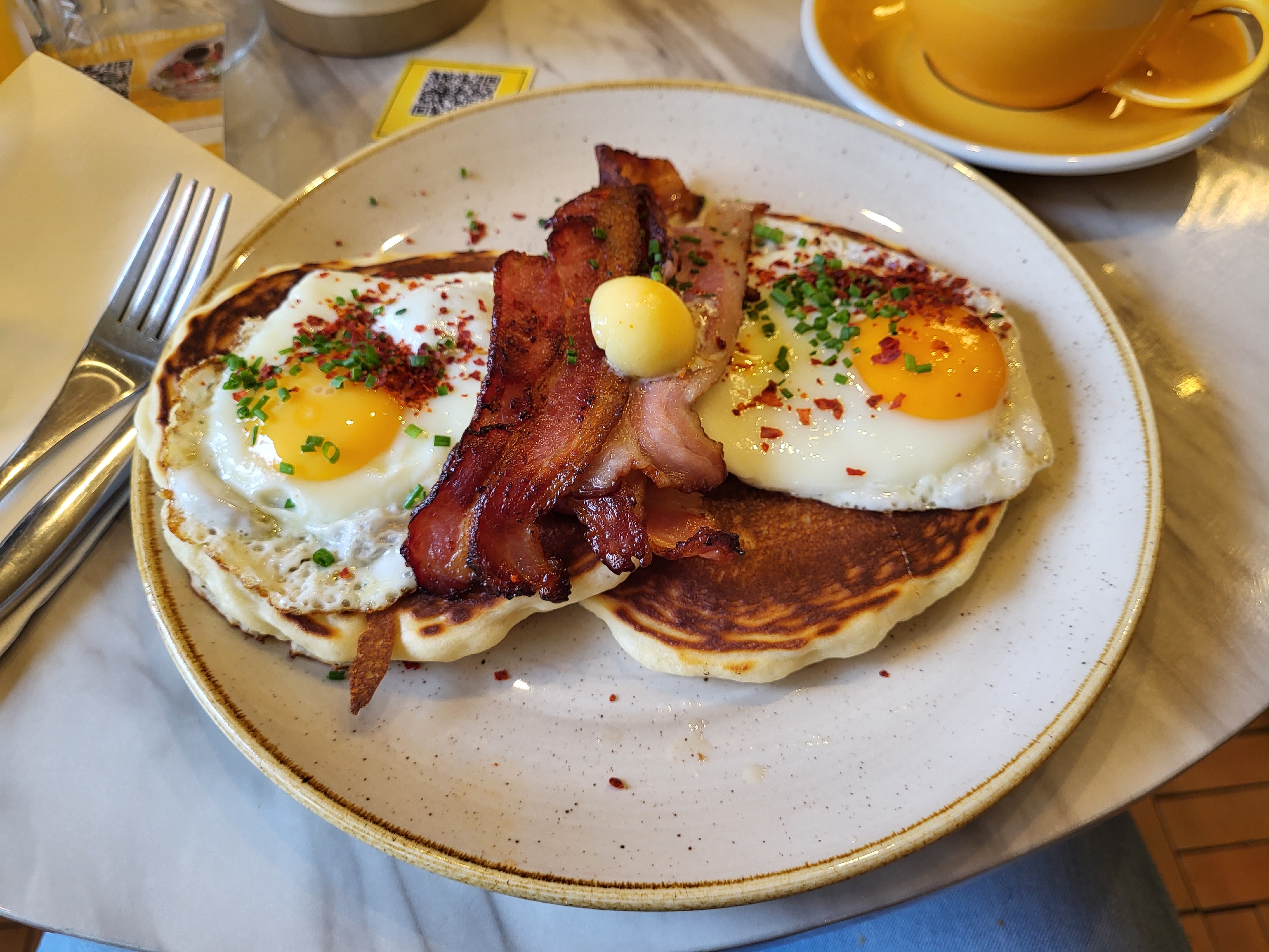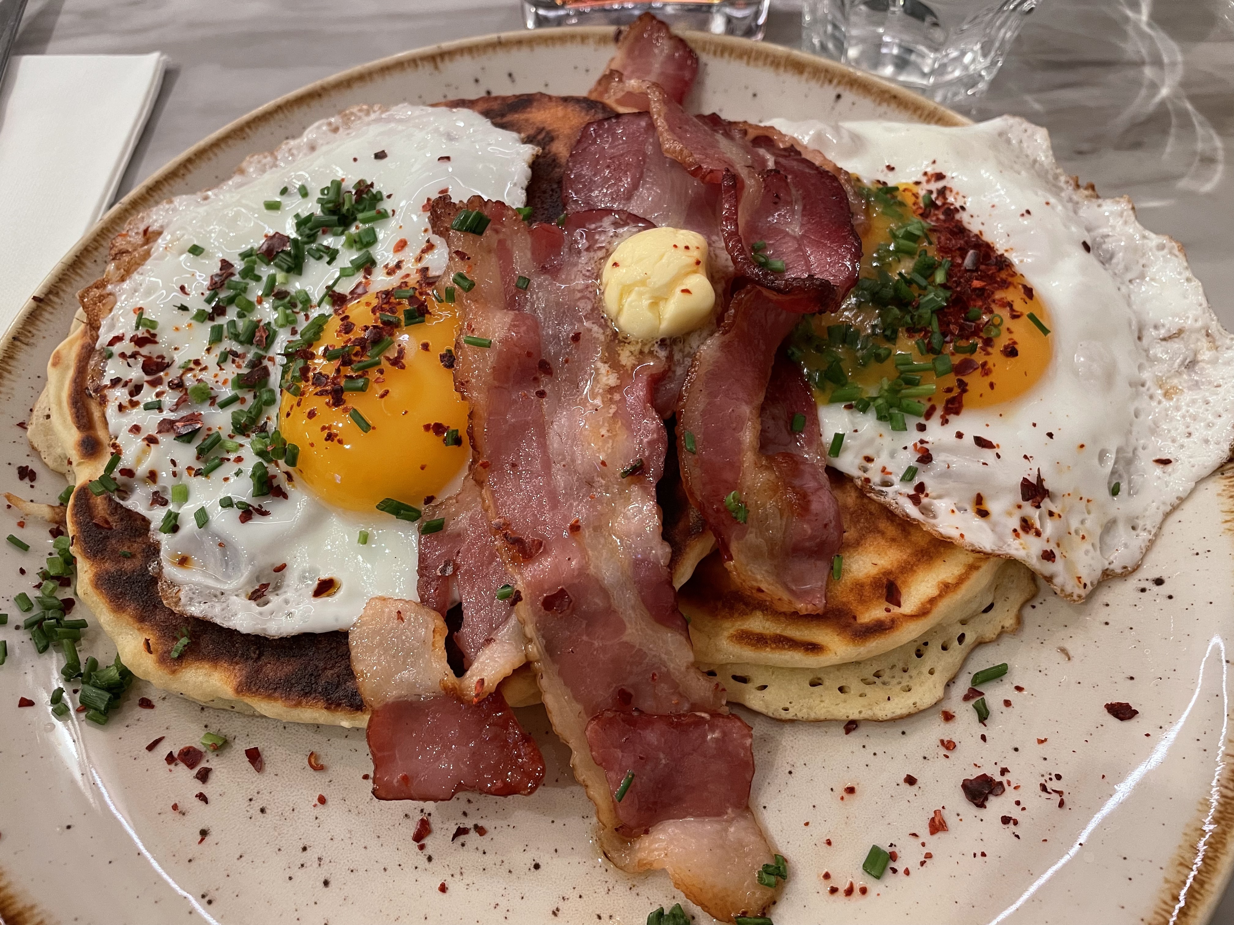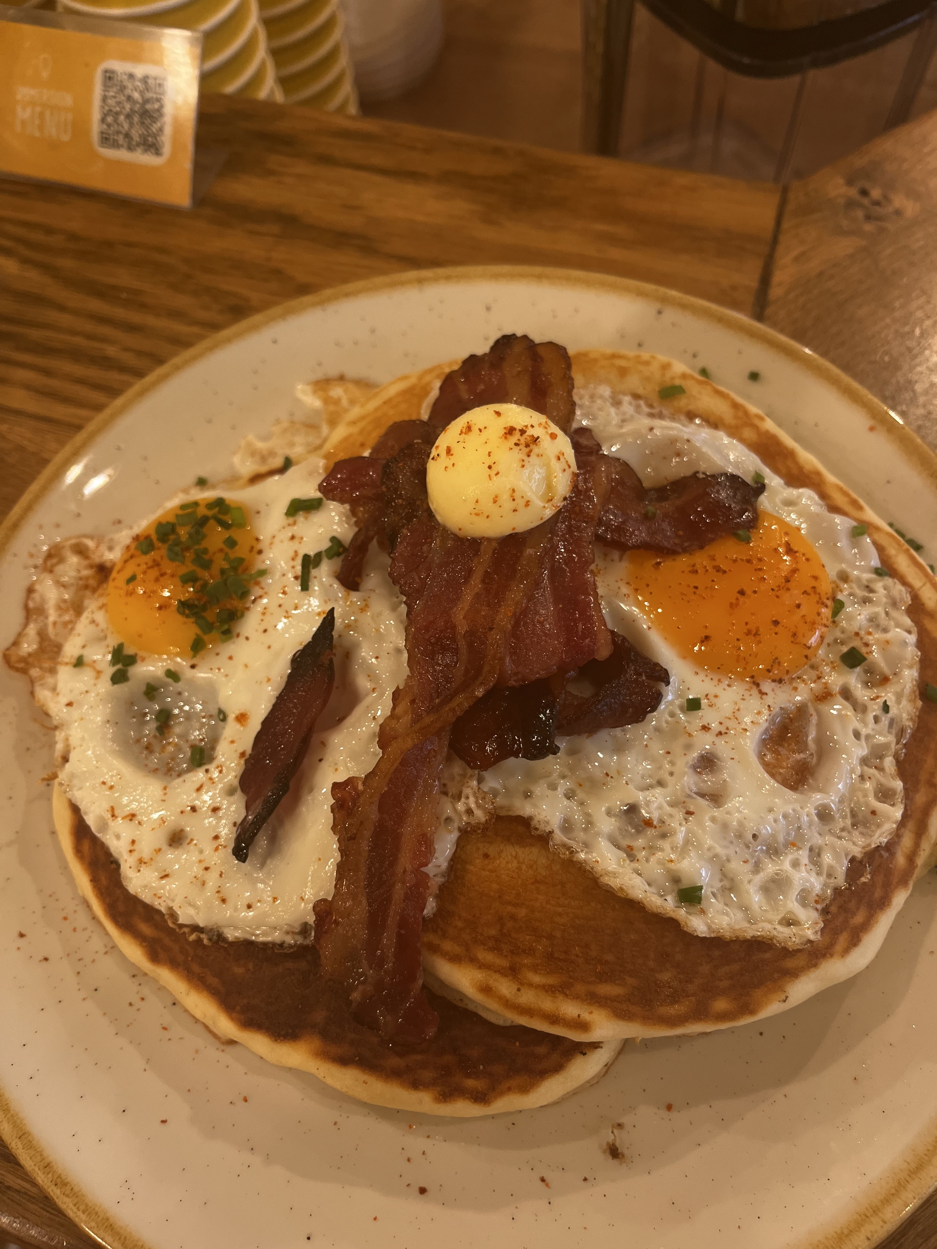 Un peu d’attente avant de pouvoir s’installer, mais le serveur a fait en sorte que ce ne soit pas long. Le restaurant est très joli, un peu bondé mais ça va. Nous avons pris deux pancakes egg & bacon et c’était délicieux pour des prix abordables si on a envie de se faire un bon brunch à Paris. Bref, on s’est régalés !
