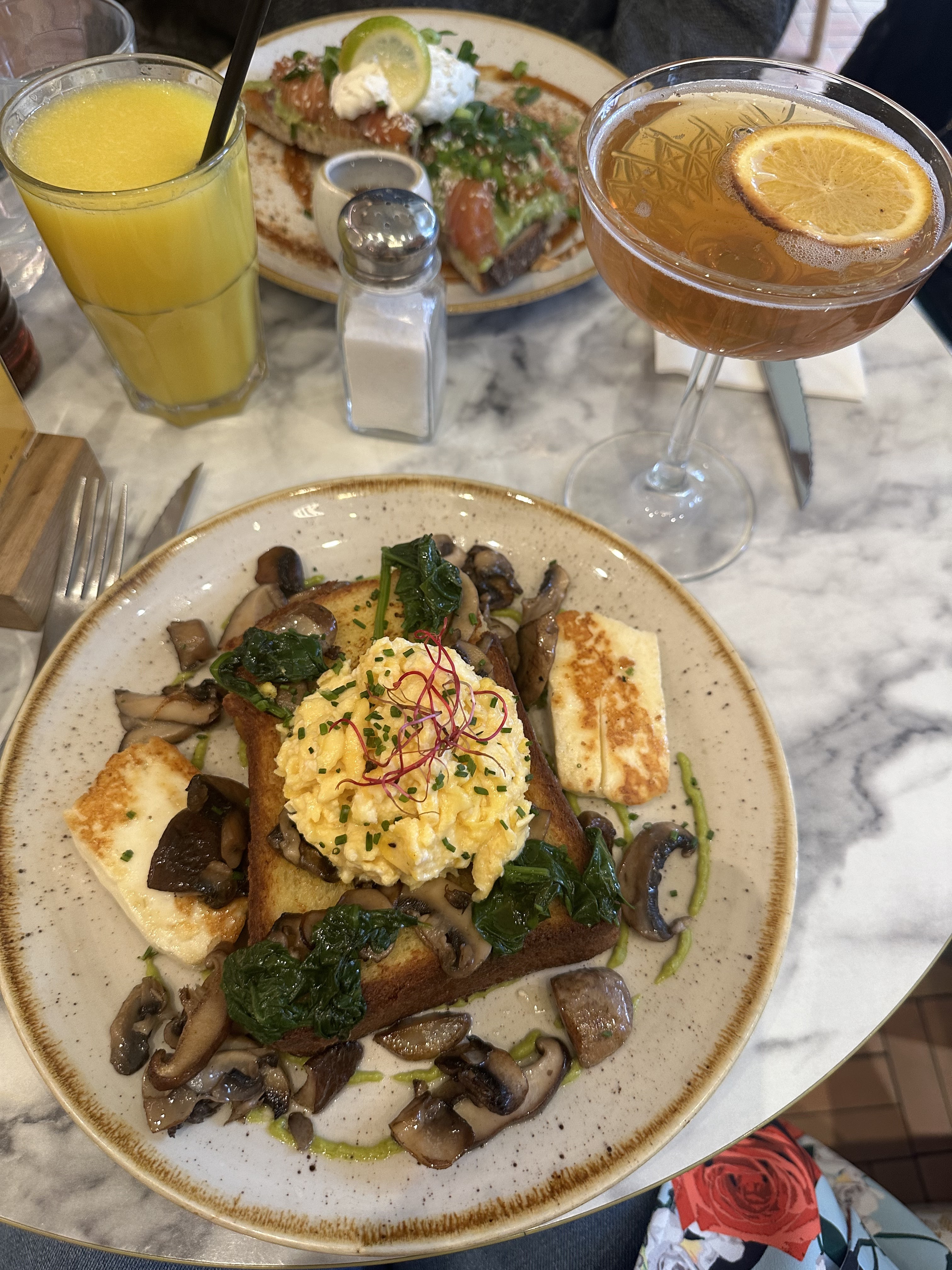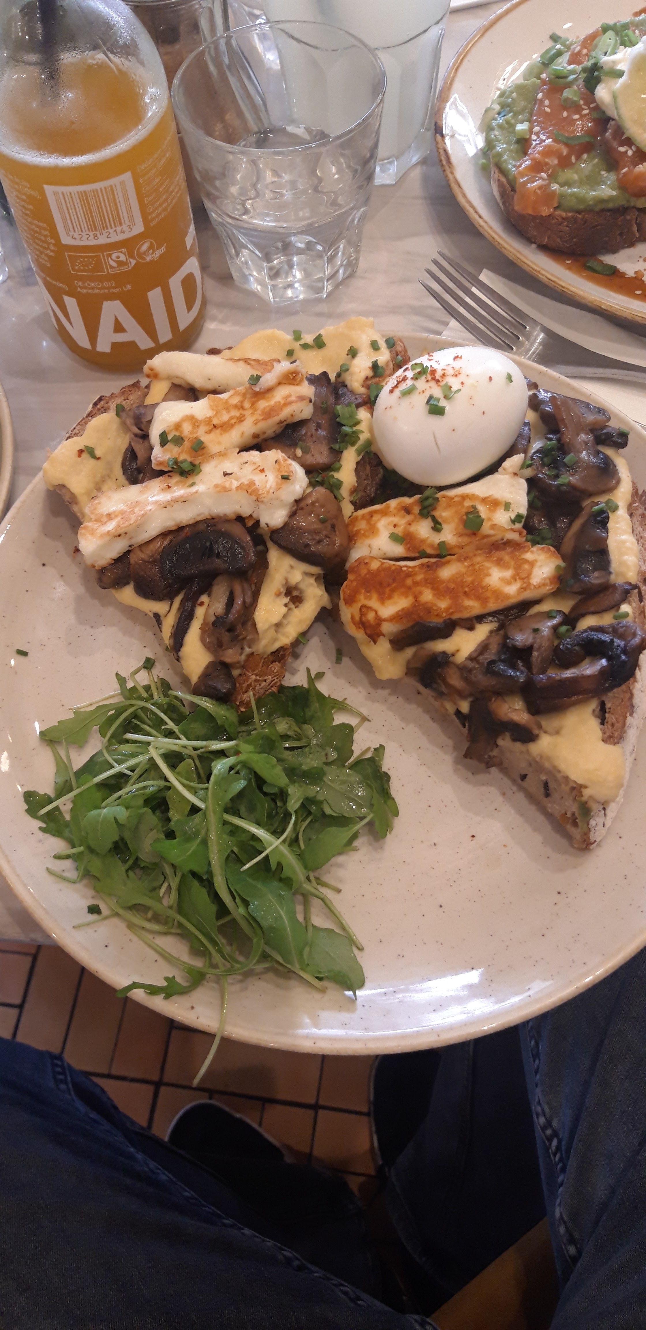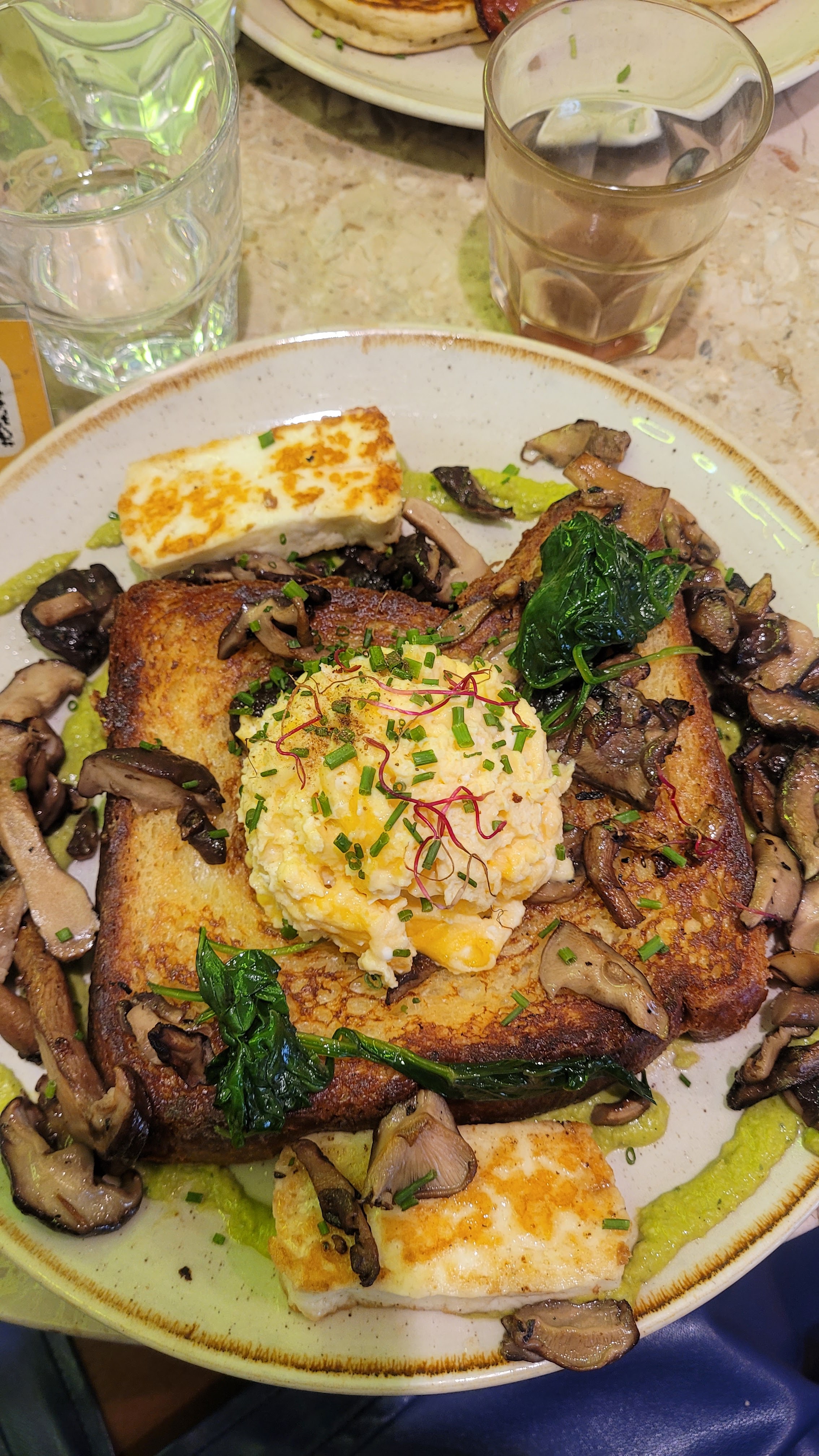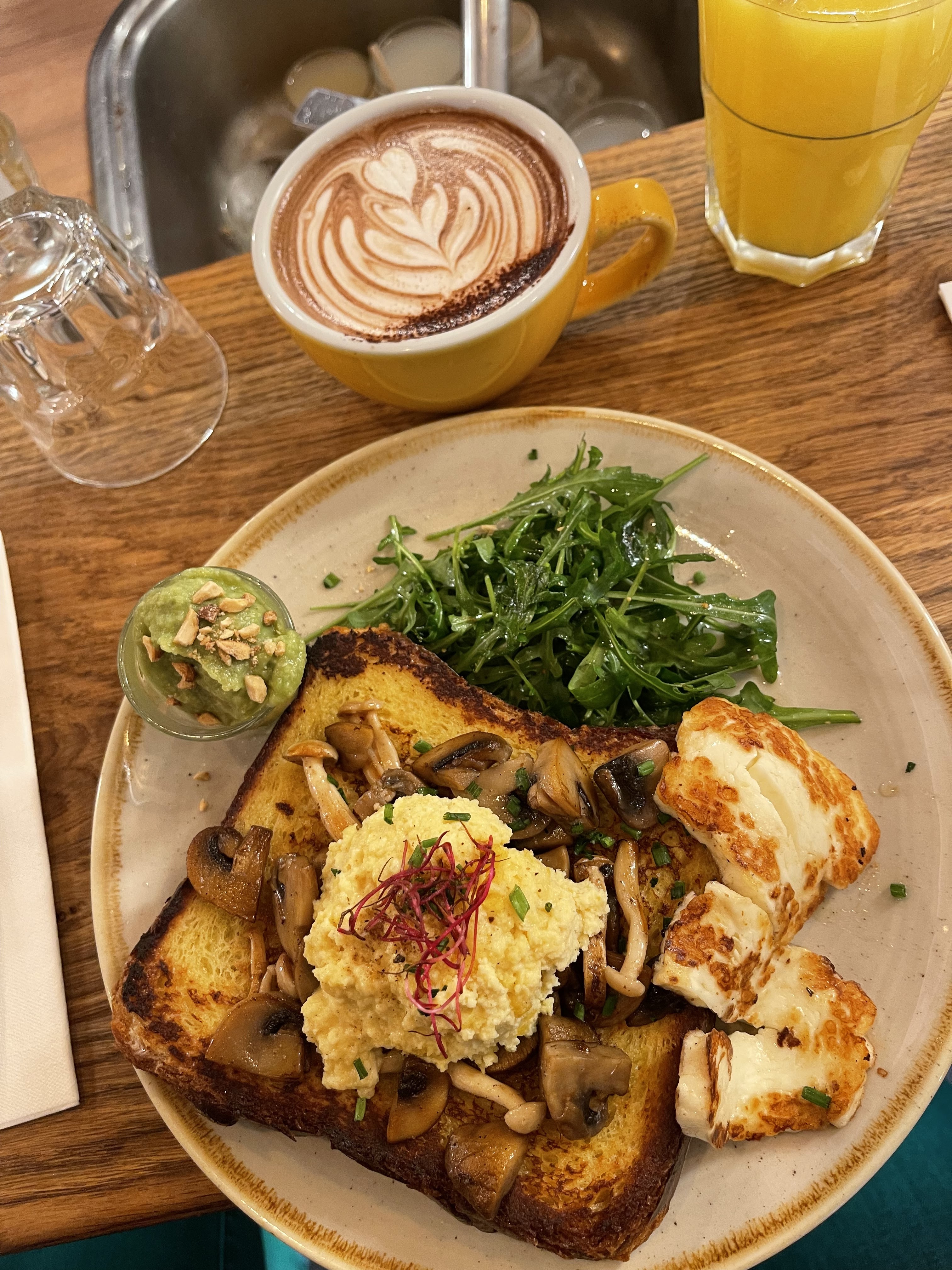 Très chouette lieu aux couleurs vives : s’y asseoir nous donne déjà la pêche ! Nous avions pris la brioche perdue en version salée. Un régal ! Le moelleux de la brioche était extra. Les champignons bien assaisonnés. Les œufs brouillés sentaient bons la truffe. Et le halloumi était parfaitement grillé ! Merci pour ce beau moment.