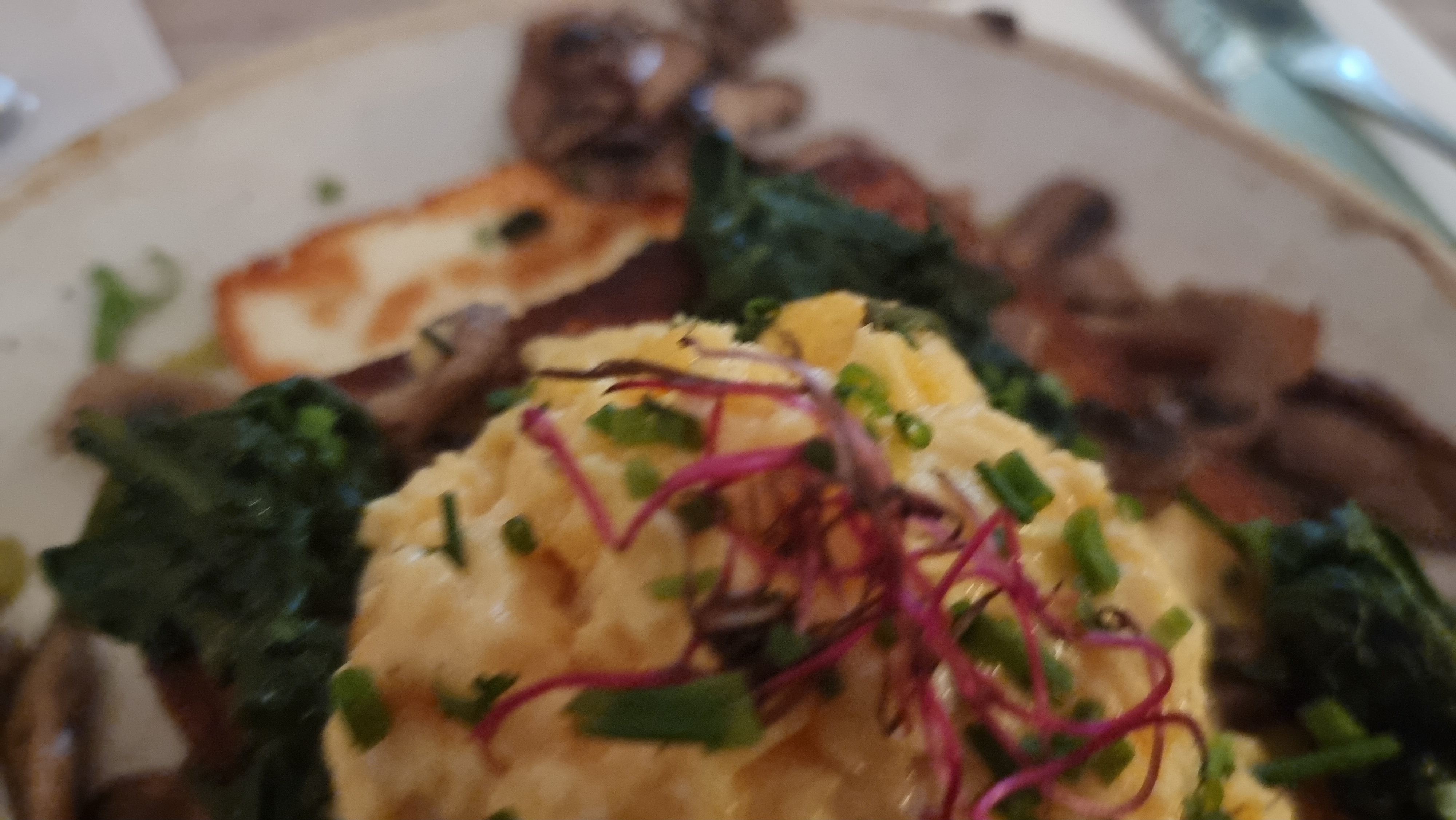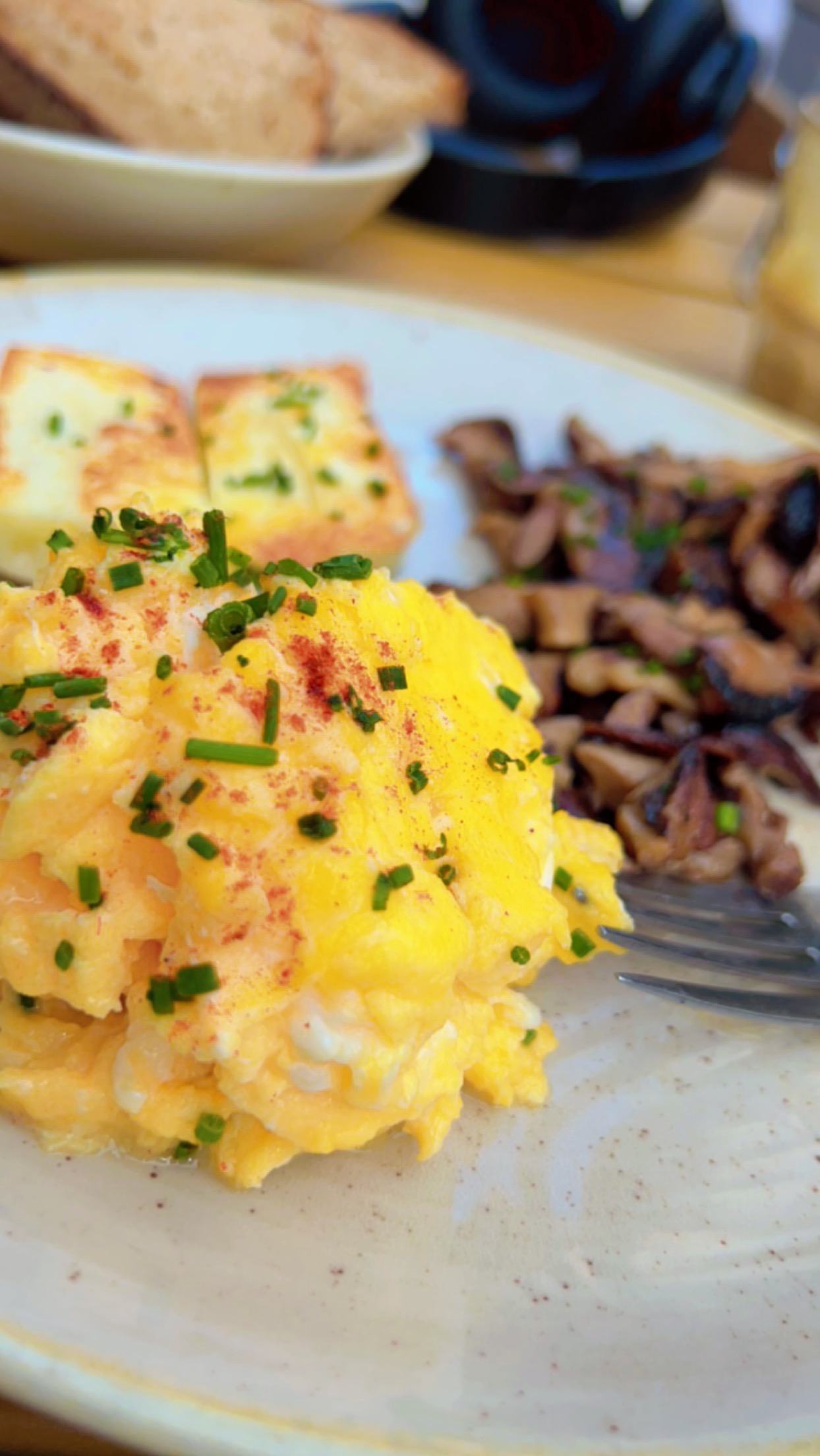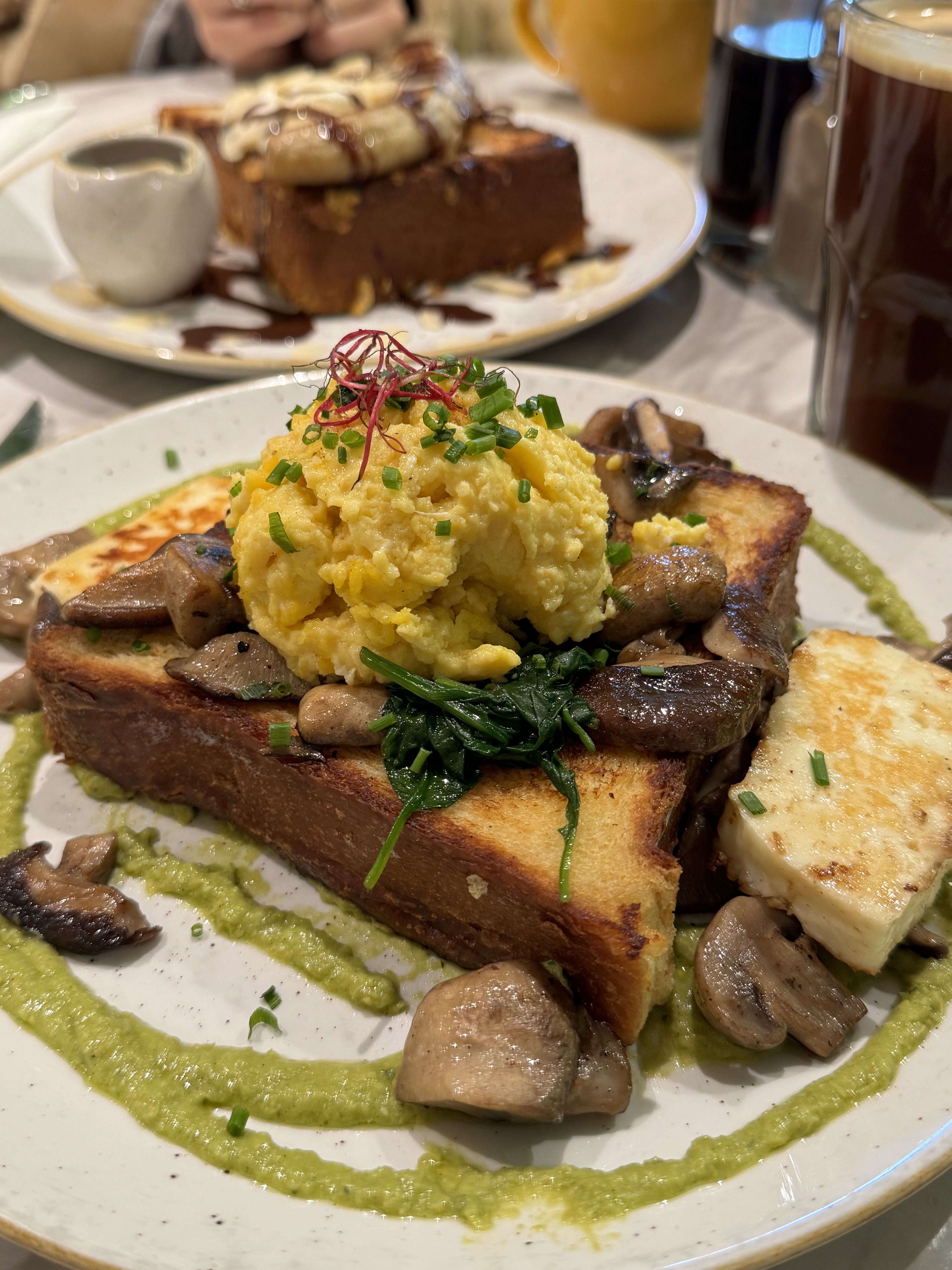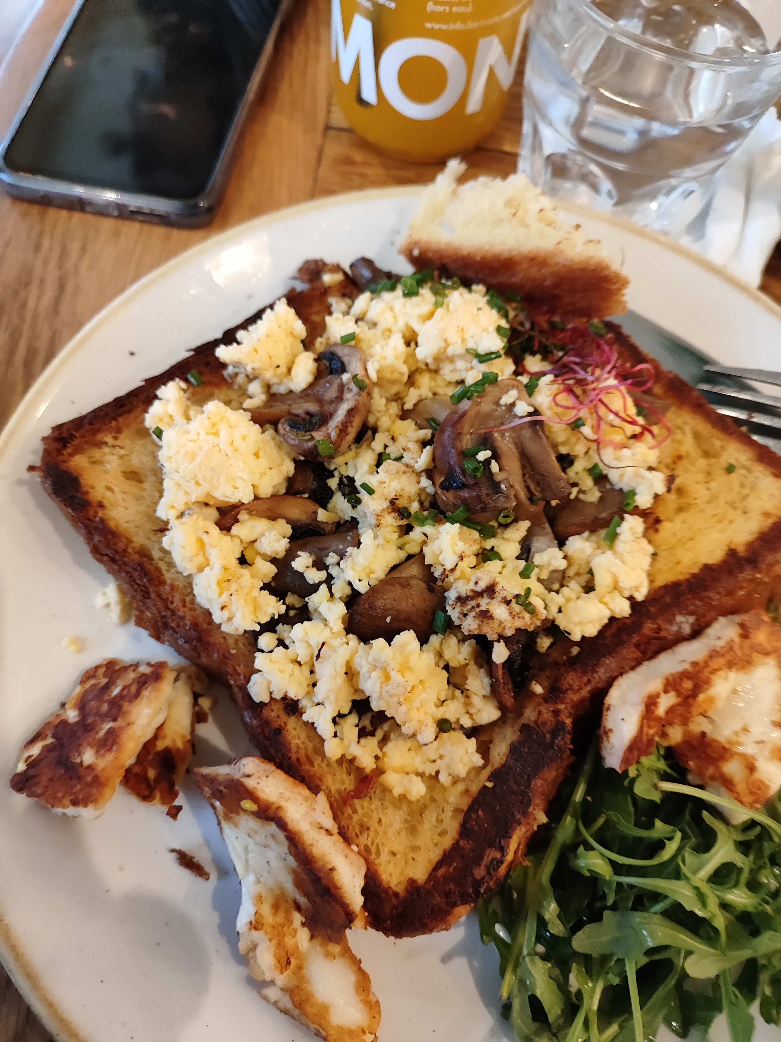 Très chouette lieu aux couleurs vives : s’y asseoir nous donne déjà la pêche ! Nous avions pris la brioche perdue en version salée. Un régal ! Le moelleux de la brioche était extra. Les champignons bien assaisonnés. Les œufs brouillés sentaient bons la truffe. Et le halloumi était parfaitement grillé ! Merci pour ce beau moment.