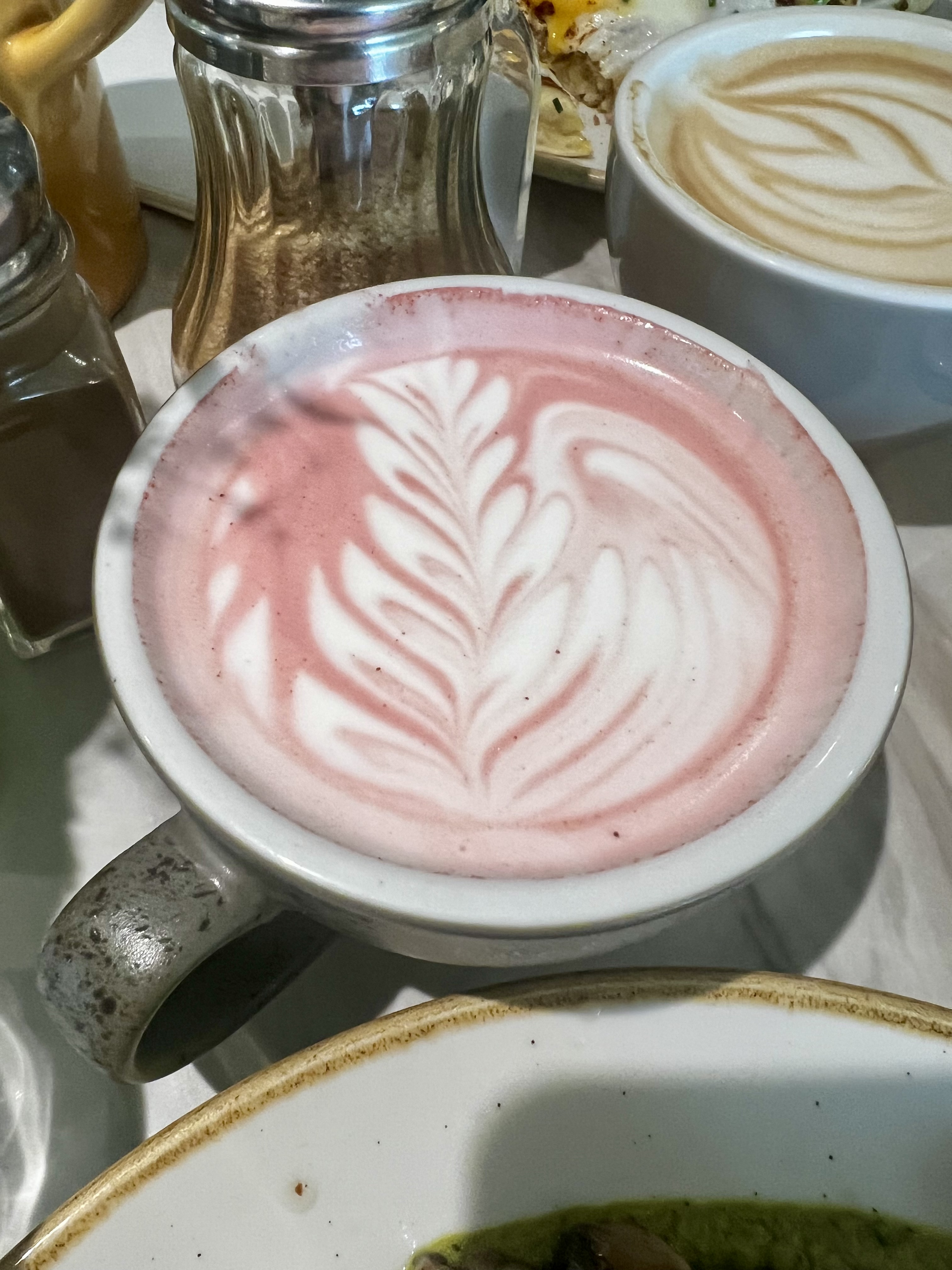 Avant tout, c'était bon. Sinon, les points forts étaient les portions très très généreuses, une belle cuisson - rien à redire sur les pancakes, le pain perdu, l'oeuf ni le bacon. Jolie présentation. Par contre, si c'était moi qui vendait ces plats, il y a quelques éléments que j'aurais amélioré : Le pain perdu était sec au bords, et le menu ne clarifie pas que la crème c'est de la crème épaisse et non de la fleurette montée. Je n'ai d'ailleurs pas senti le tonka, mais avec tous les autres arômes c'est pas très grave. Ma boisson était belle, mais je me suis aperçue que certains autres clients ont eu des roses séchées sur leur latte rose, j'aurais apprécié les avoir aussi. Finalement, j'ai une question. Le latte rose est il coloré à la betterave ou ce goût vient il de la rose? J'ai beaucoup aimé quand même, et si un jour je me retrouve sur Paris avant les foules je reviendrai sûrement